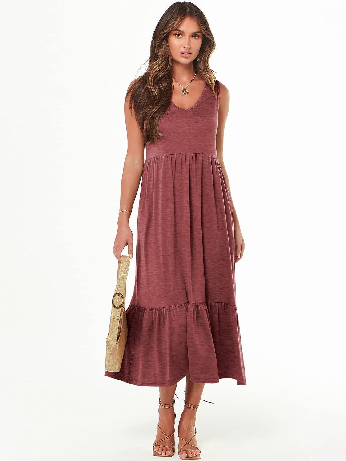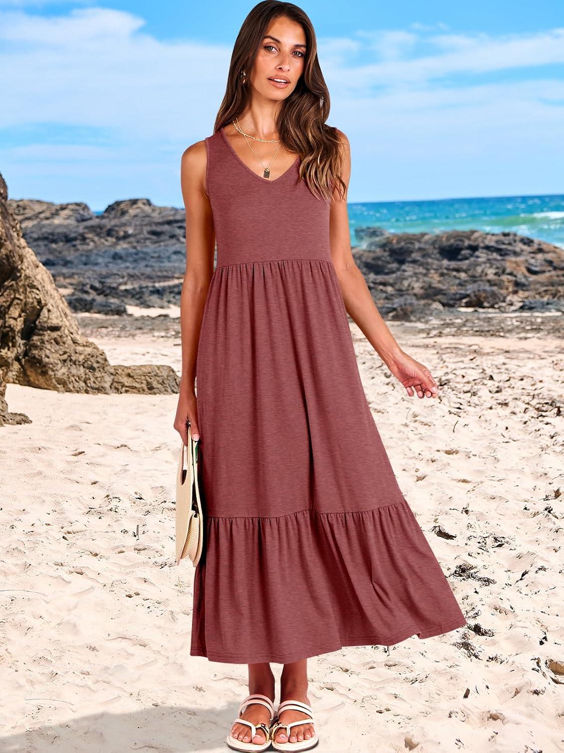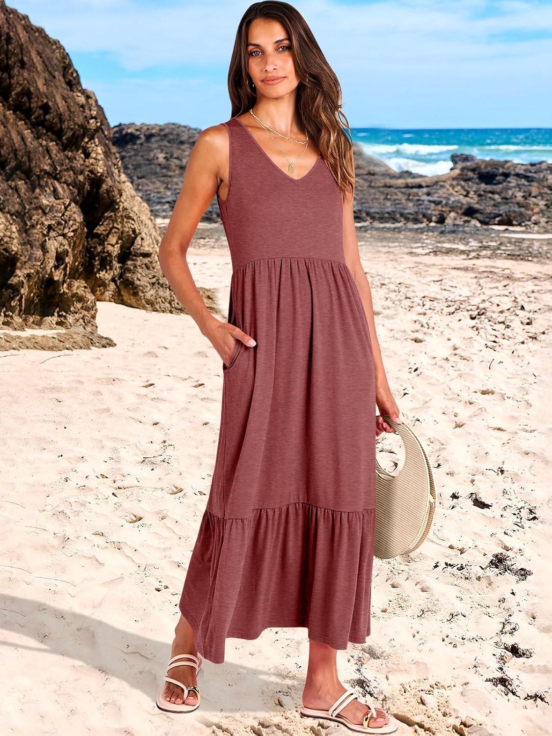 ANRABESS Womens Summer Maxi Dresses Fit & Flare Flowy V Neck Sleeveless Swing Casual Tiered Beach Sundress with Pockets(Rose)