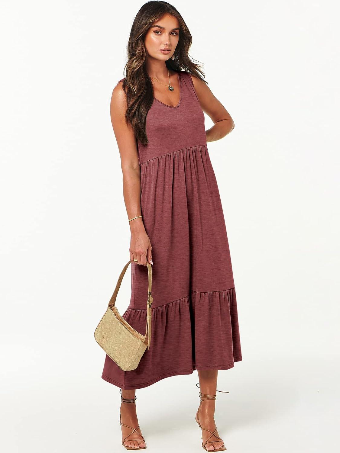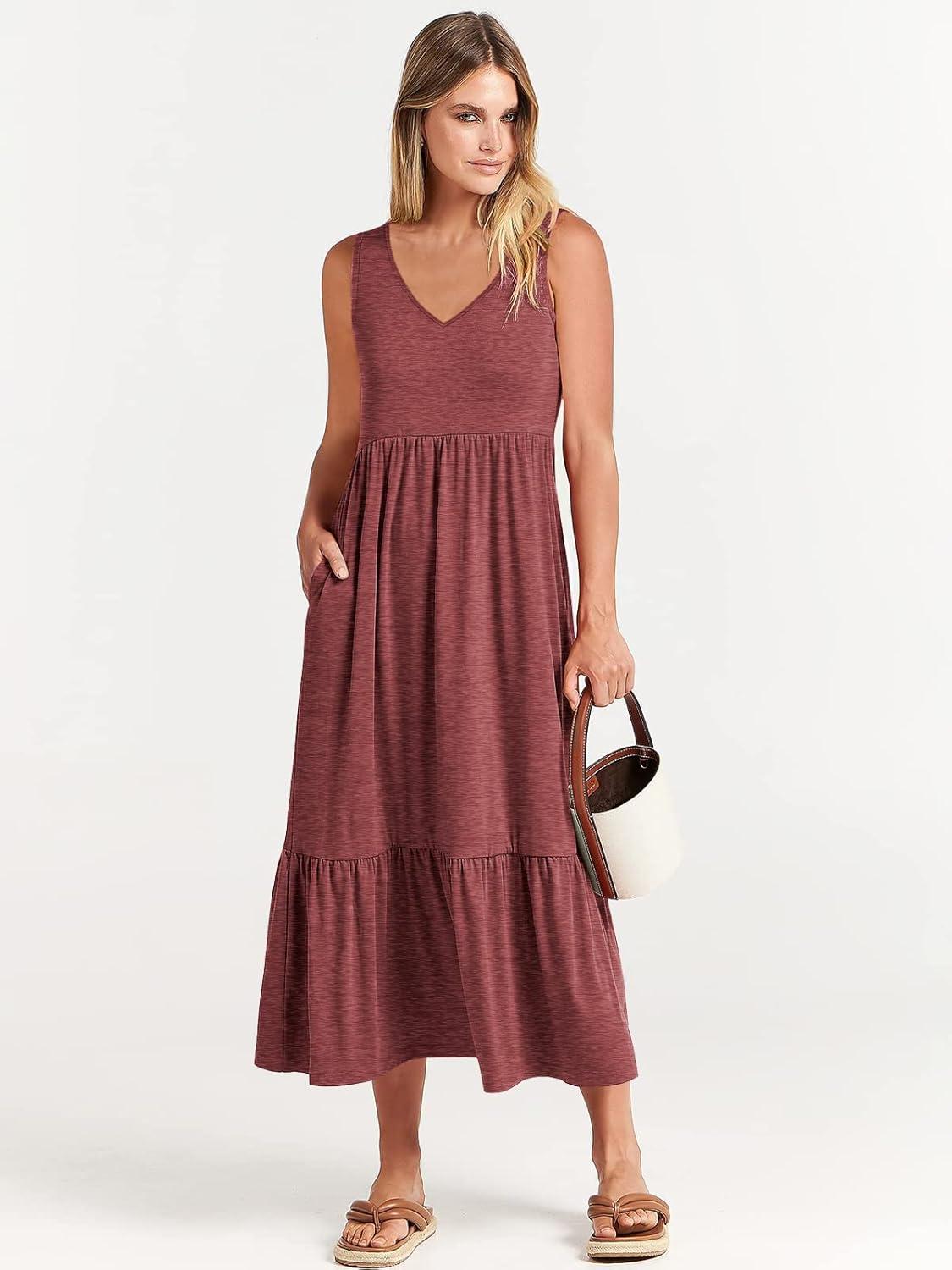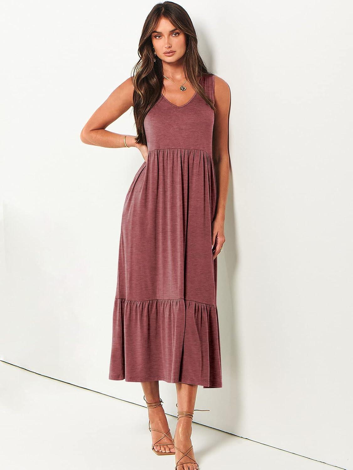 ANRABESS Womens Summer Maxi Dresses Fit & Flare Flowy V Neck Sleeveless Swing Casual Tiered Beach Sundress with Pockets(Rose)