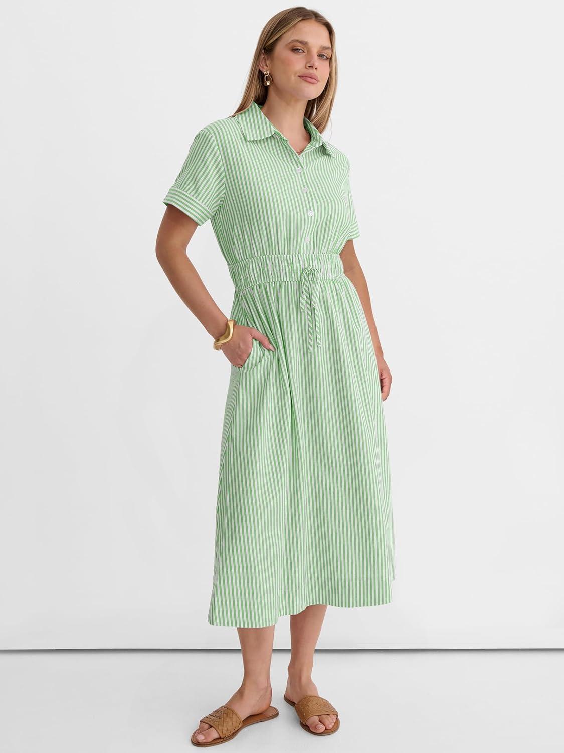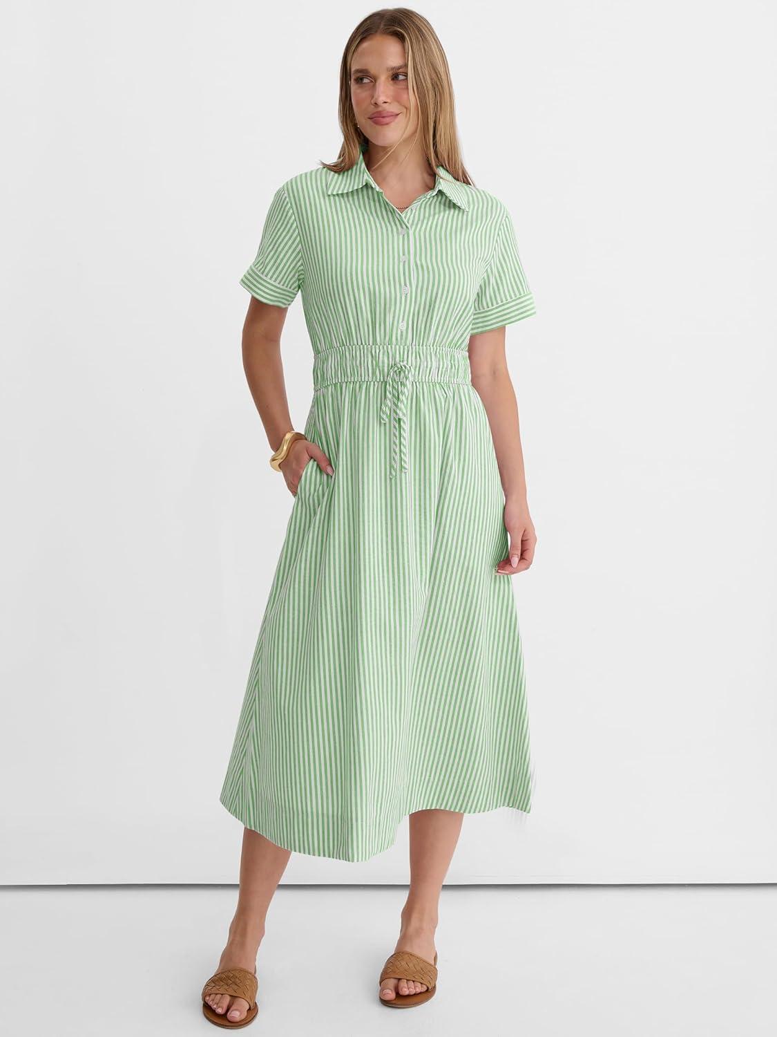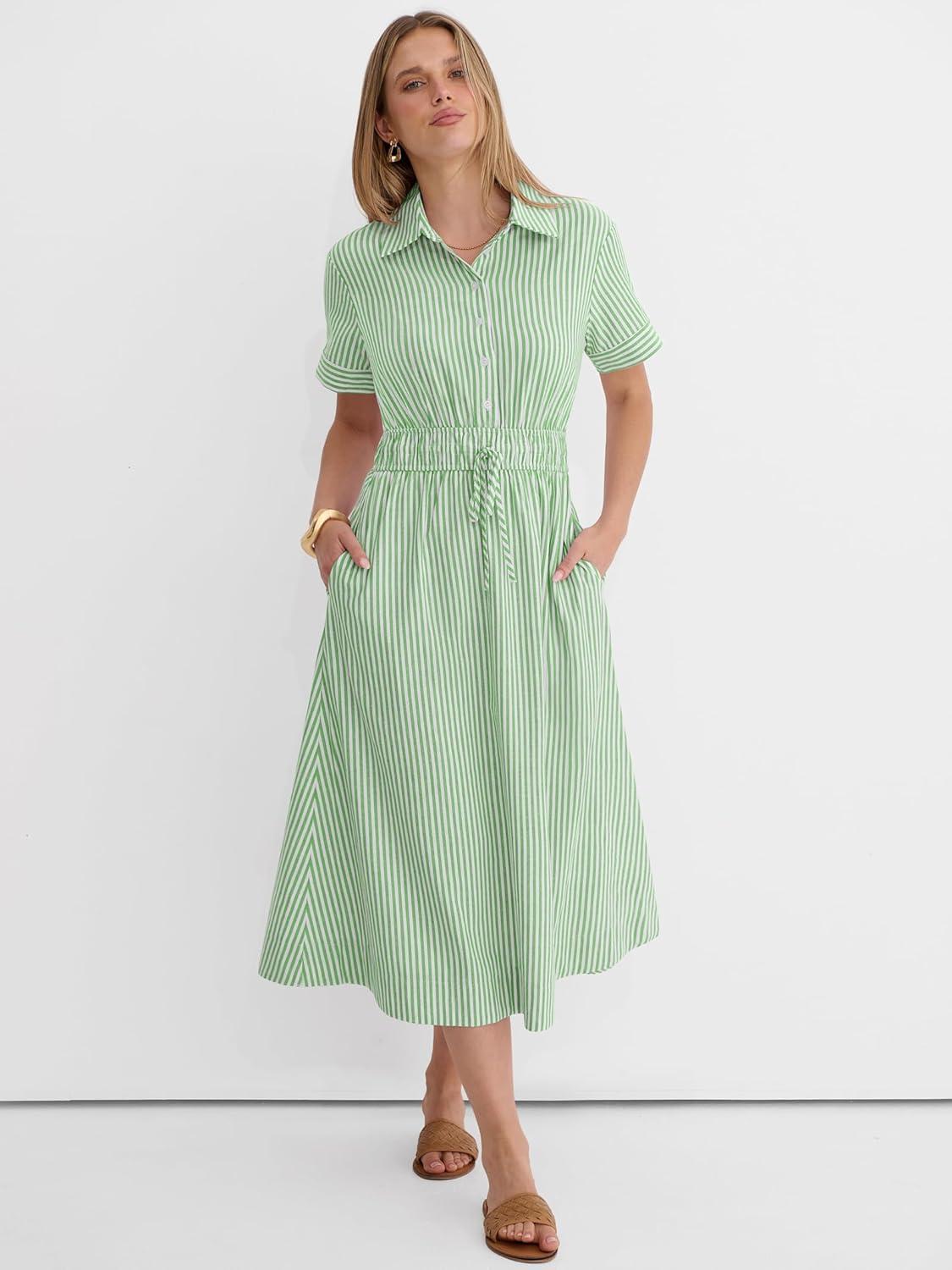 ANRABESS Womens Summer Midi Dress Short Sleeve Striped Plaid Button Collar Shirt Dresses 2026 Casual Beach Vacation Clothes(Green White Stripe)