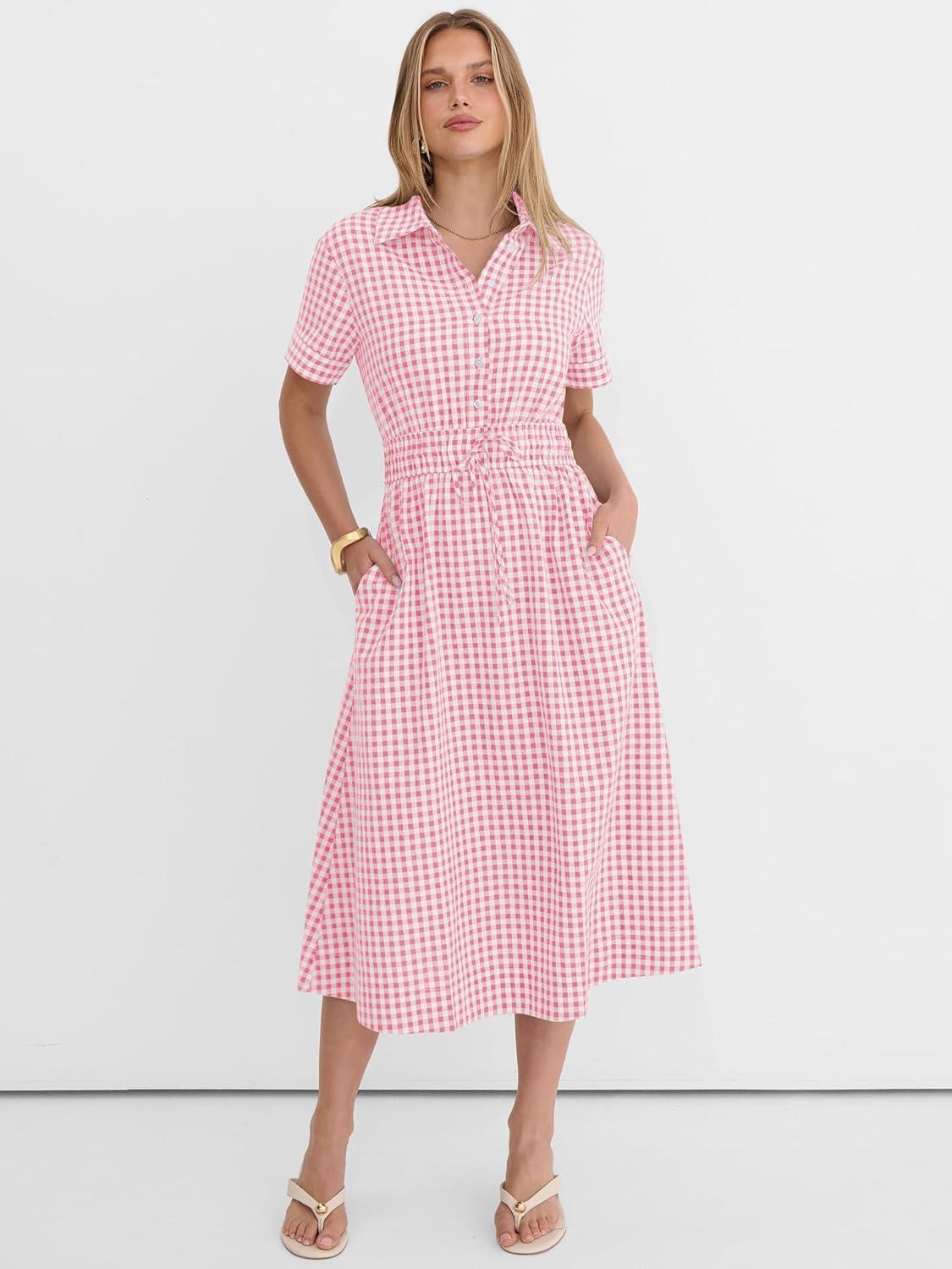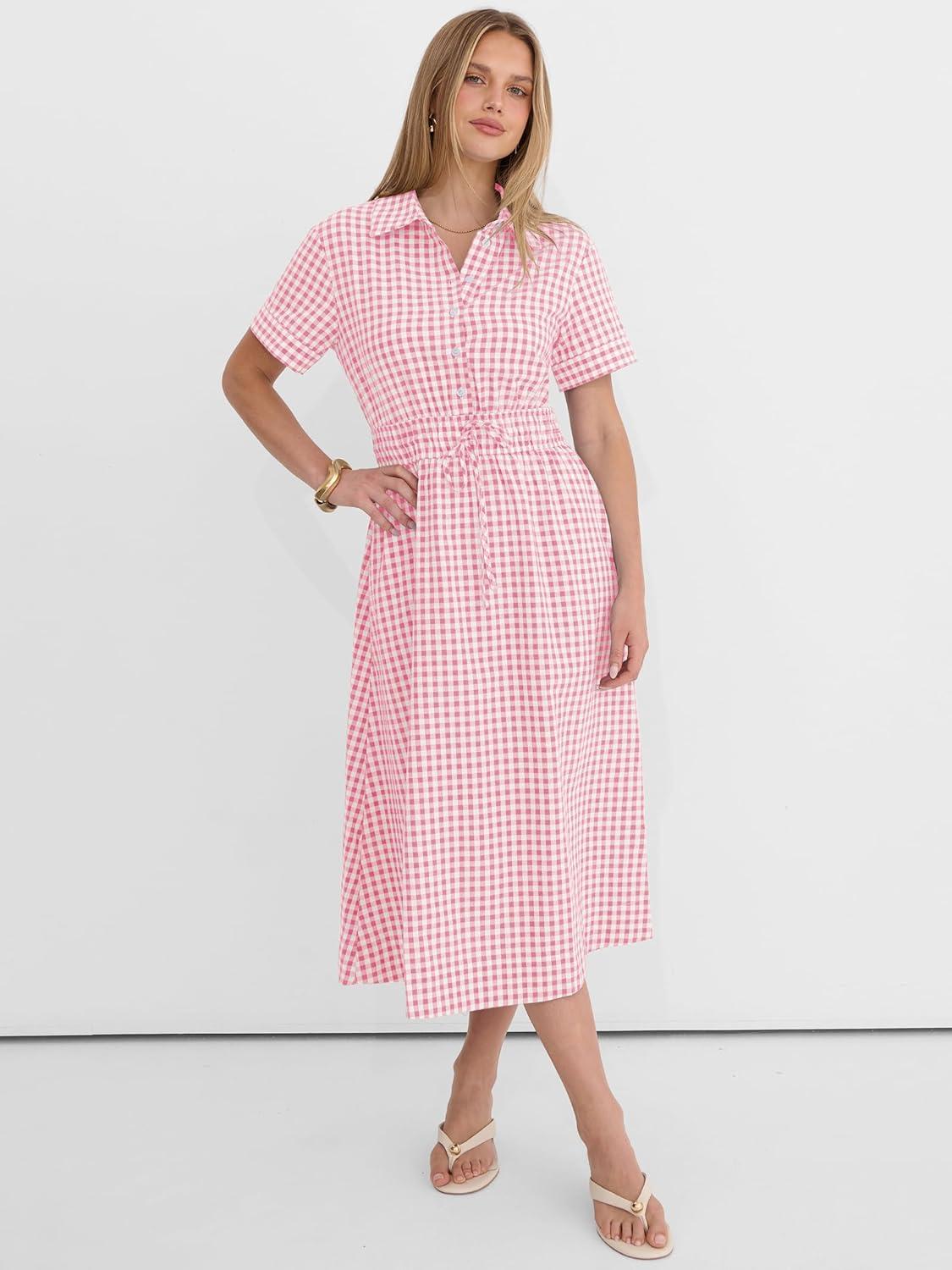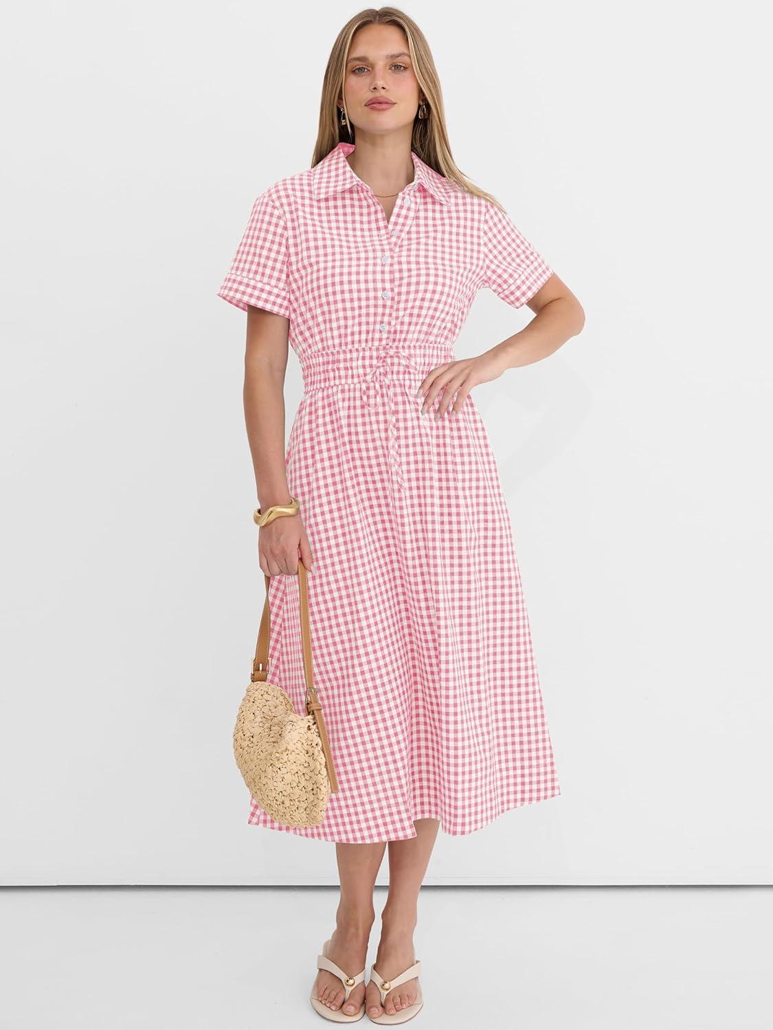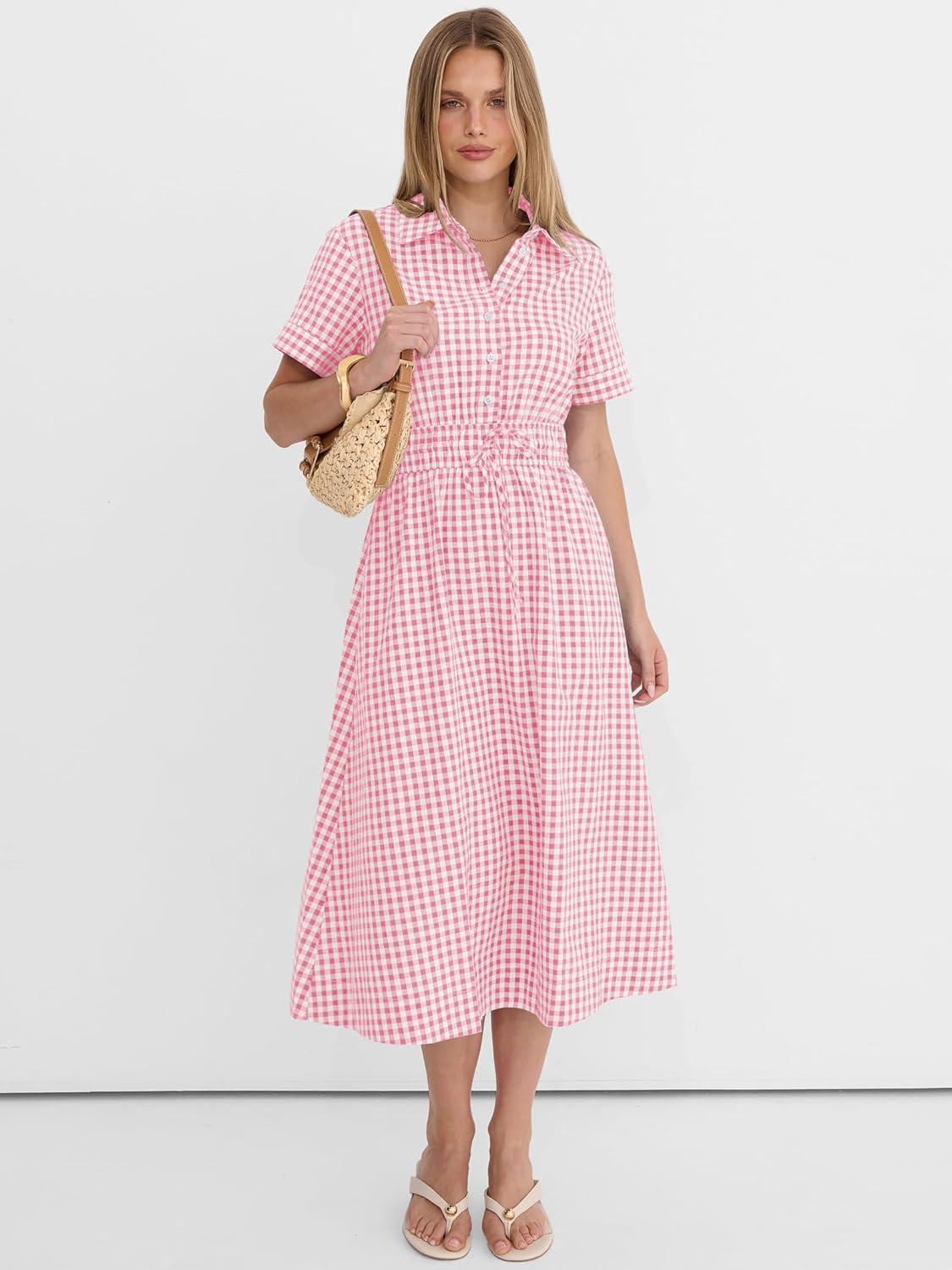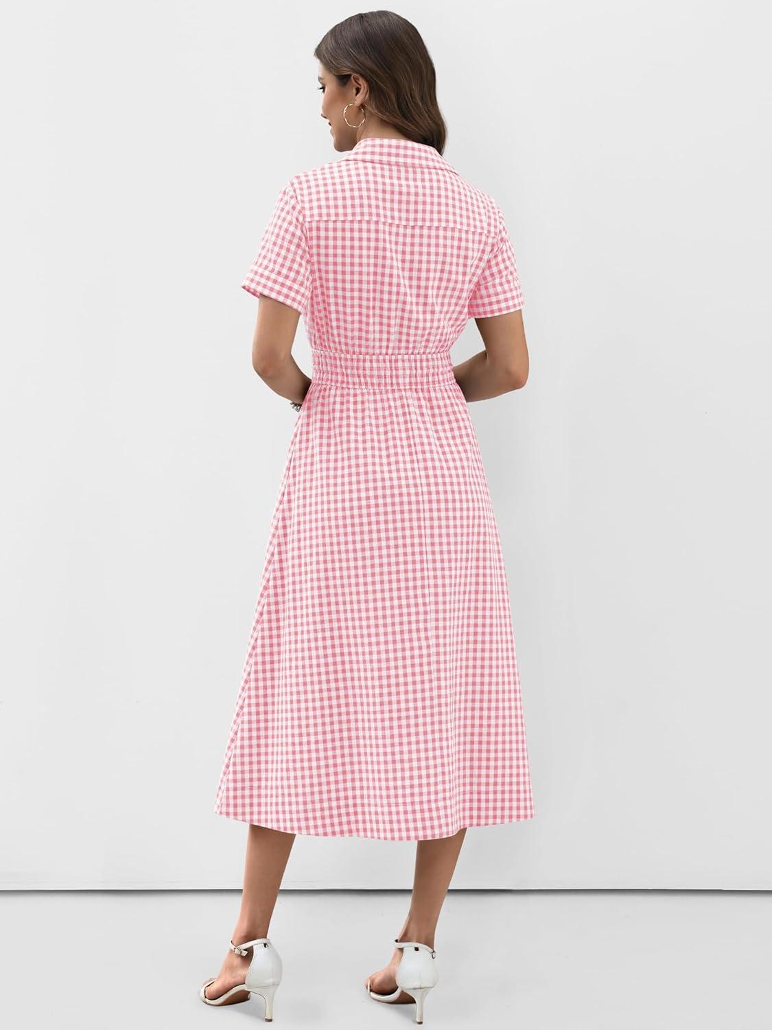ANRABESS Womens Summer Midi Dress Short Sleeve Striped Plaid Button Collar Shirt Dresses 2026 Casual Beach Vacation Clothes(Pink White Plaid)