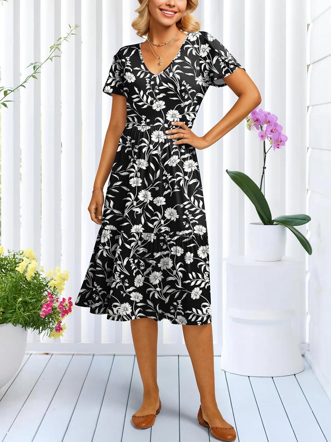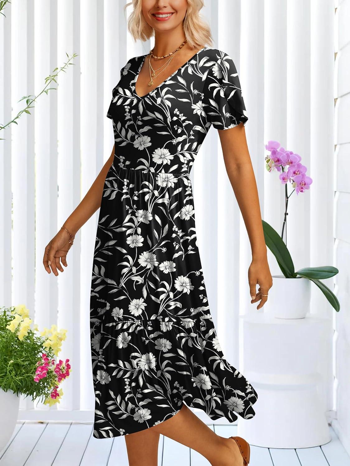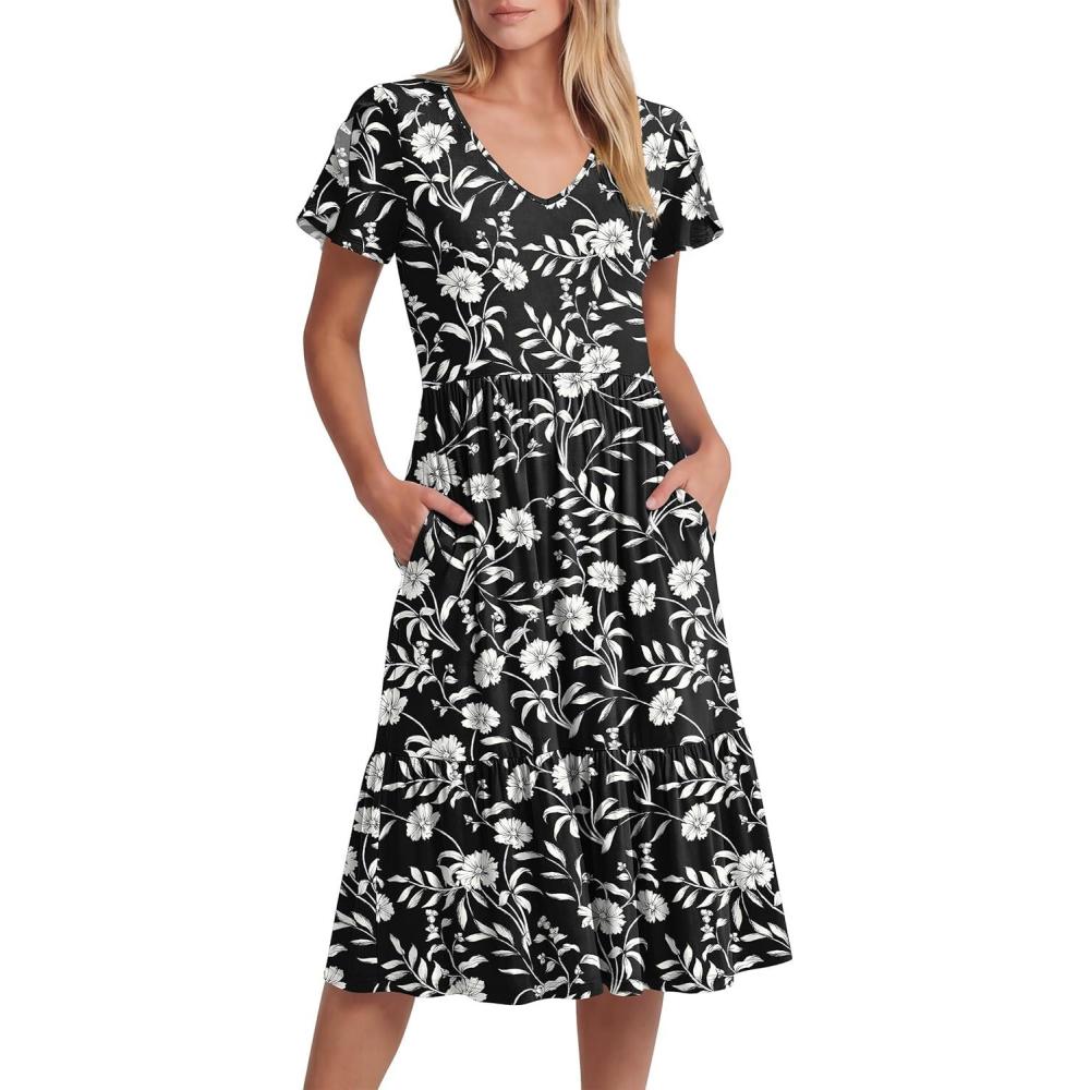ANRABESS Womens Summer Midi Dresses Casual V Neck Short Sleeve A Line Floral Flowy Tiered Beach Vacation Dress with Pockets(Black Floral)