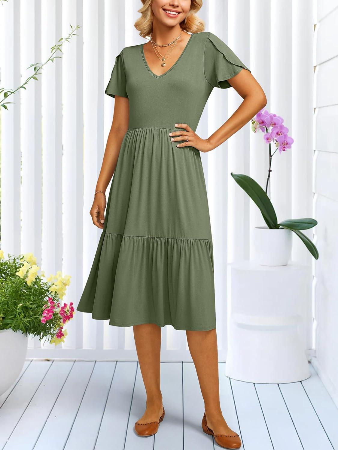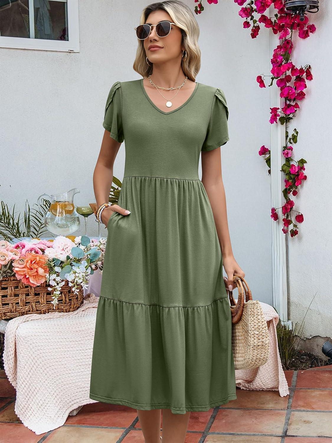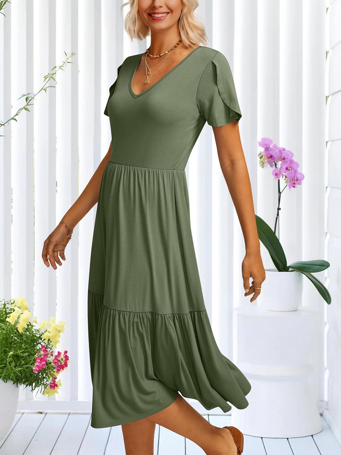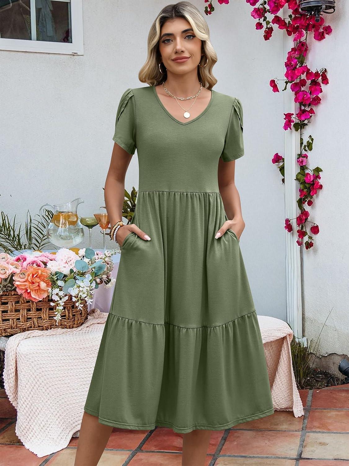 ANRABESS Womens Summer Midi Dresses Casual V Neck Short Sleeve A Line Floral Flowy Tiered Beach Vacation Dress with Pockets(Olive)