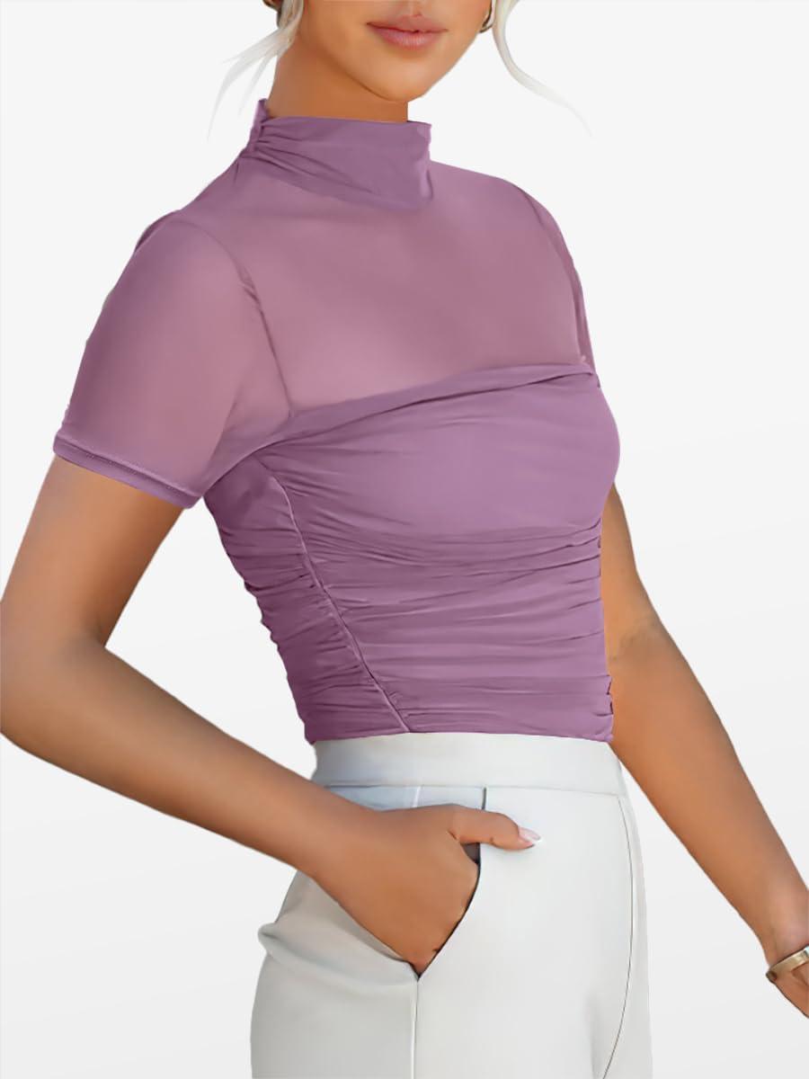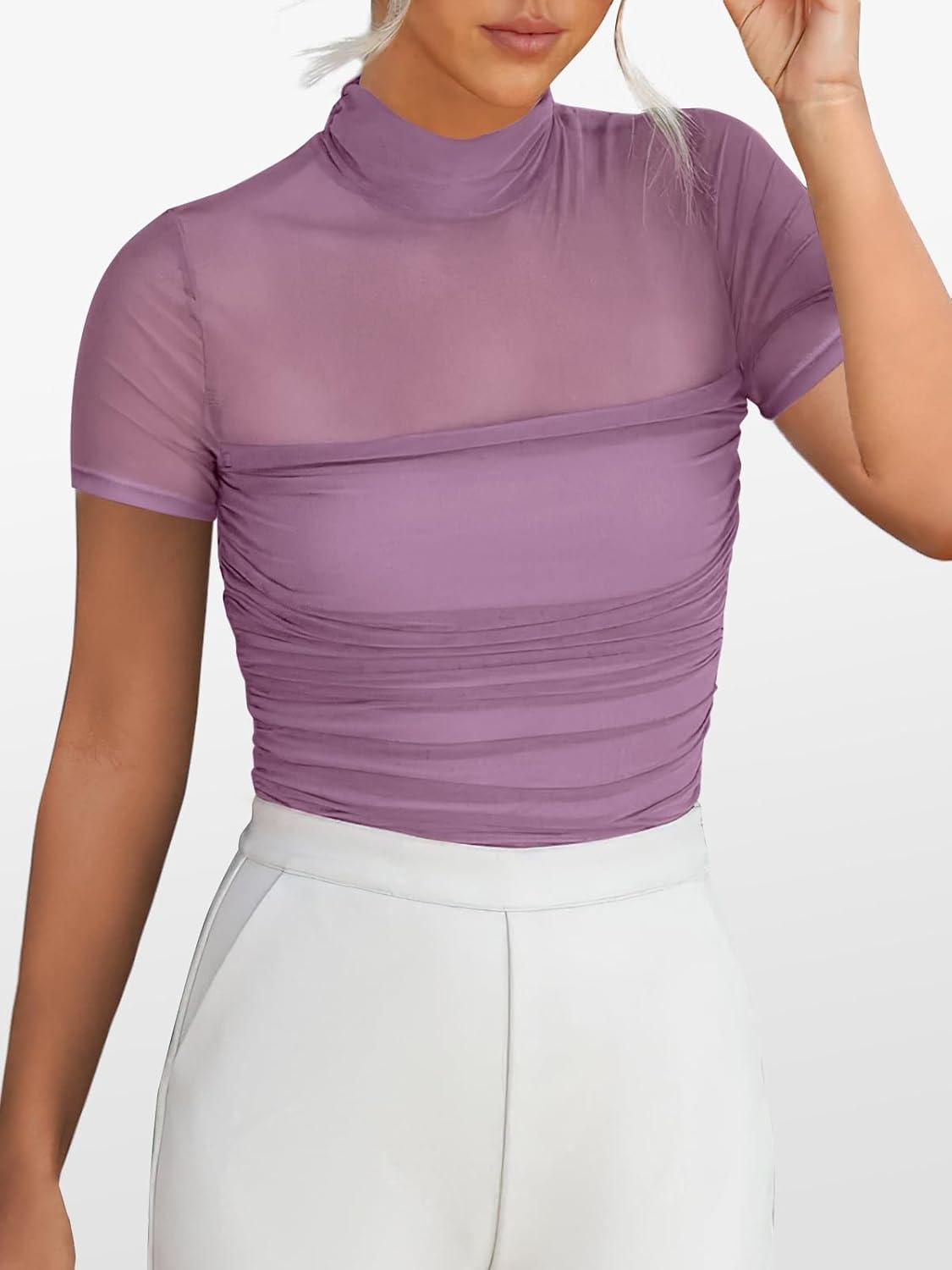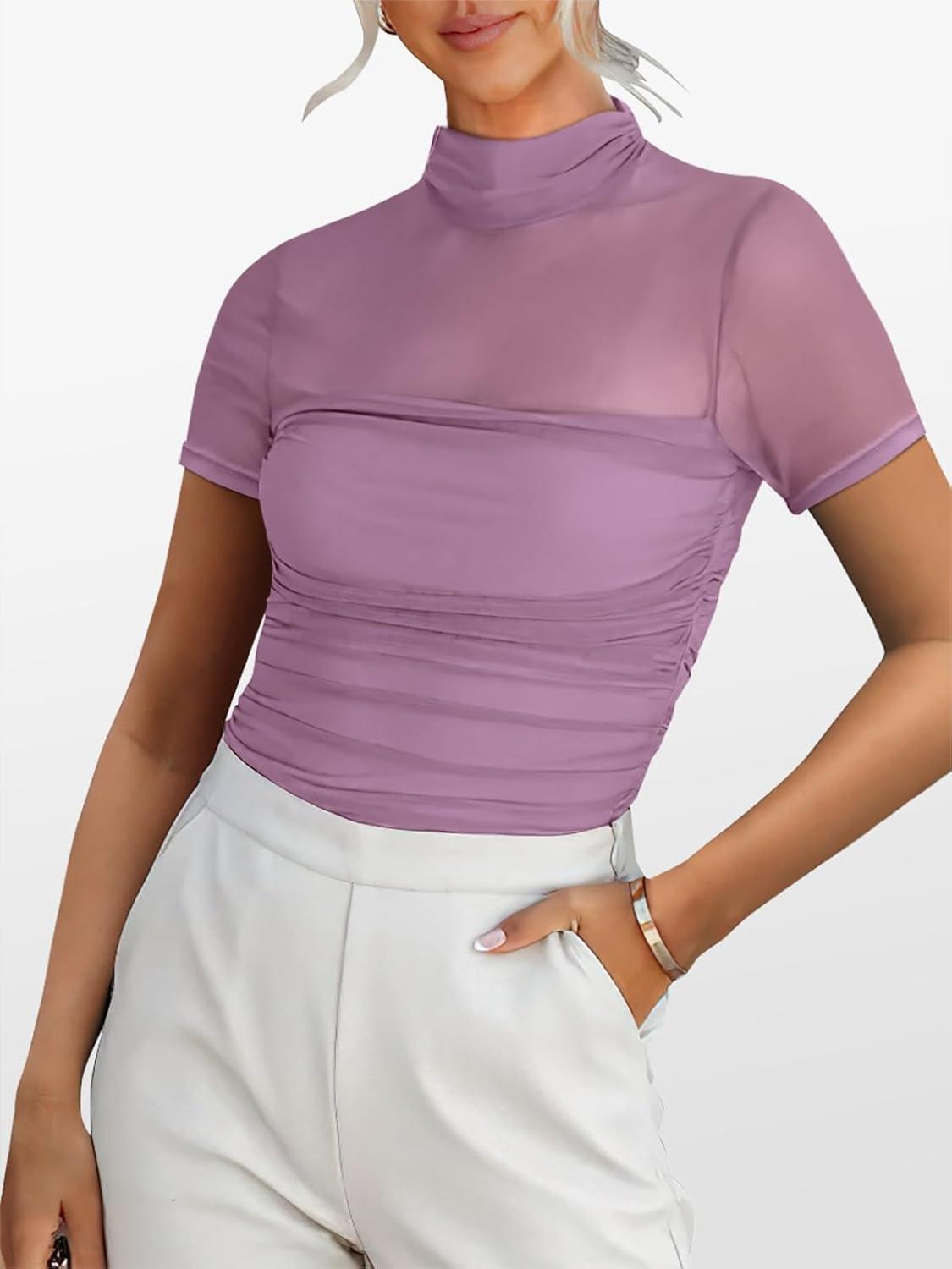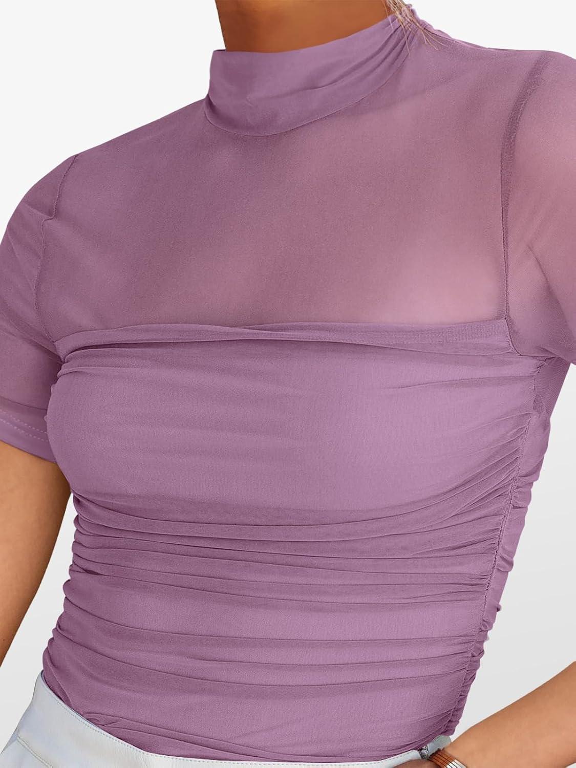 ANRABESS Womens Summer Sexy Mock Turtle Neck Short Sleeve Tops Sheer Mesh Shirts Slim Blouse Trendy Ruched Going Out Outfits(Gray Purple)