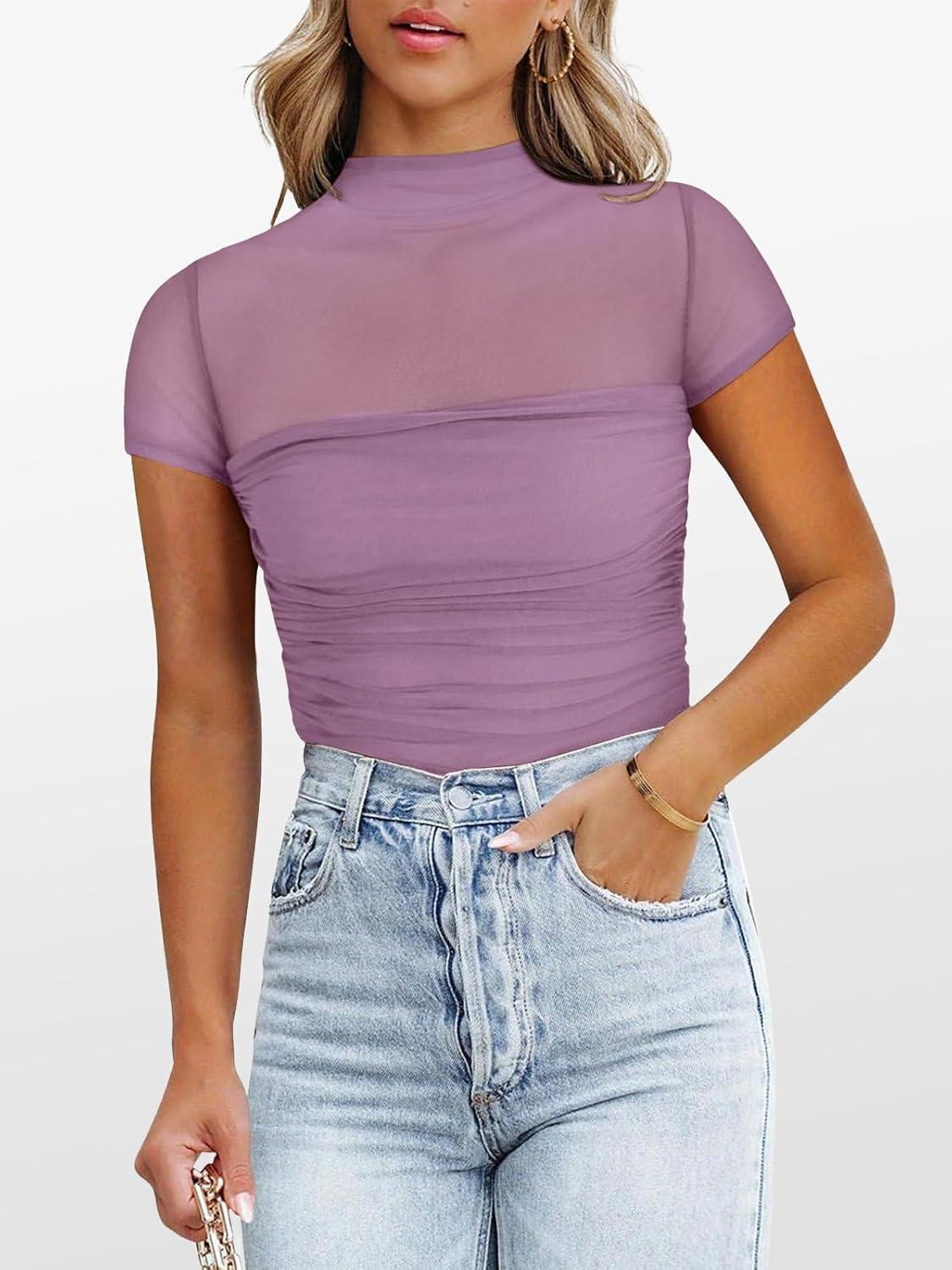 imageANRABESS Womens Summer Sexy Mock Turtle Neck Short Sleeve Tops Sheer Mesh Shirts Slim Blouse Trendy Ruched Going Out OutfitsGray Purple