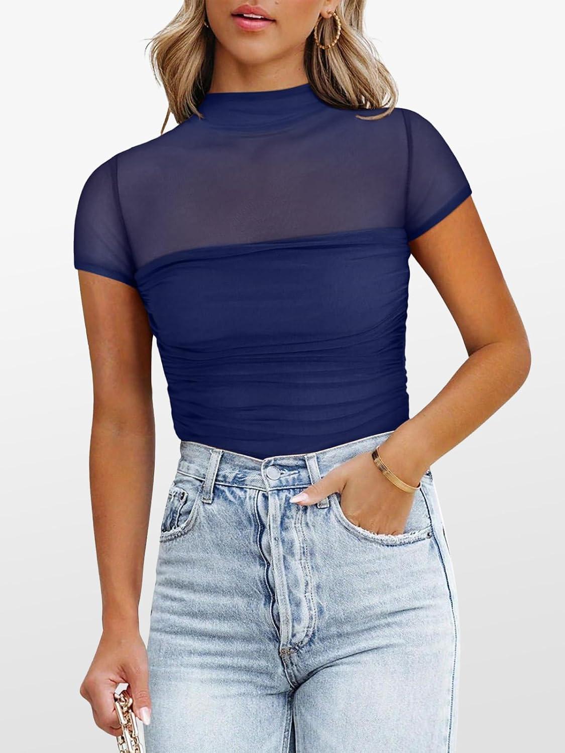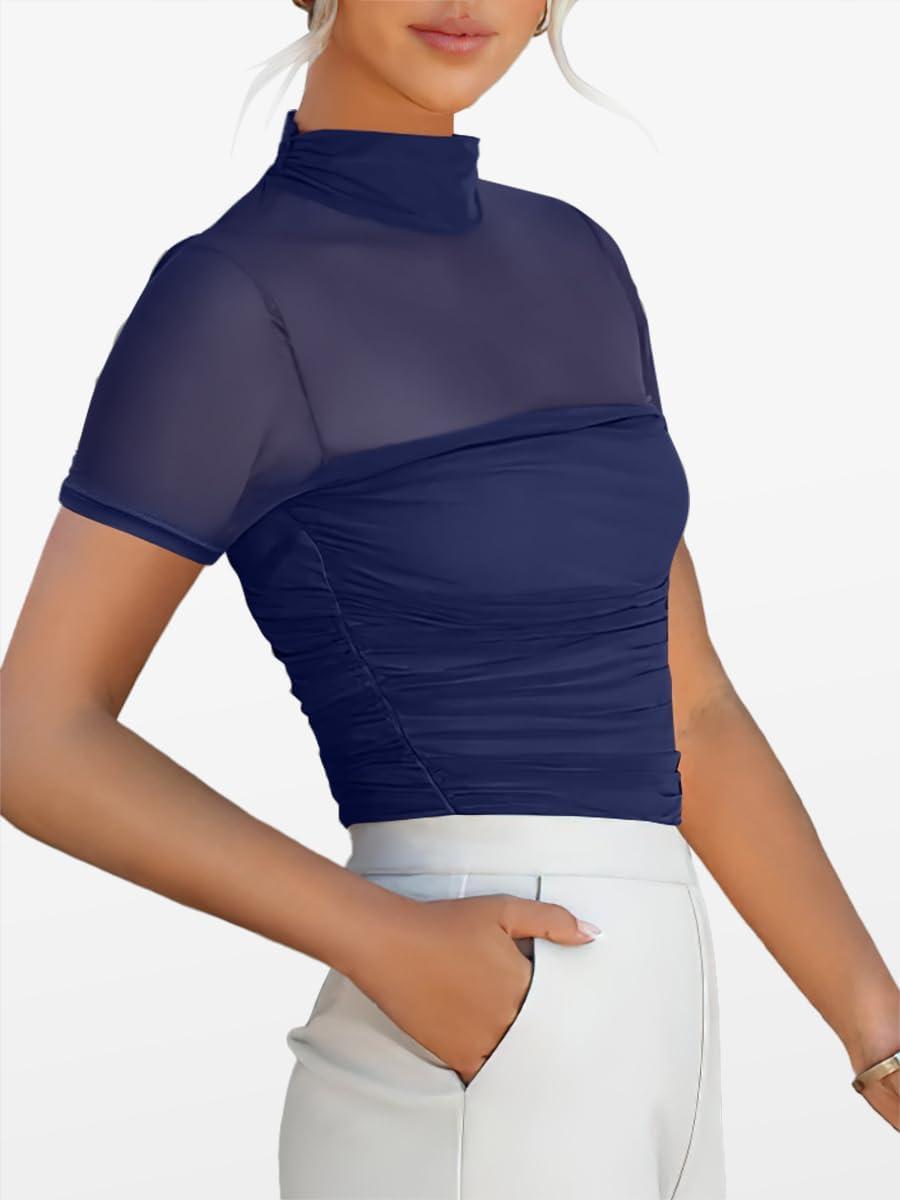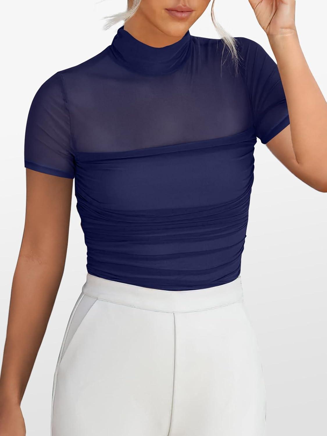 ANRABESS Womens Summer Sexy Mock Turtle Neck Short Sleeve Tops Sheer Mesh Shirts Slim Blouse Trendy Ruched Going Out Outfits(Navy Blue)