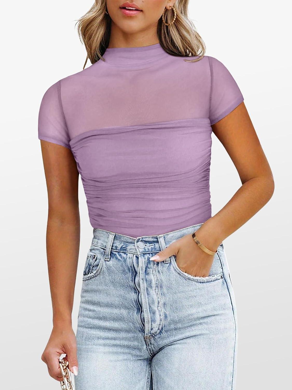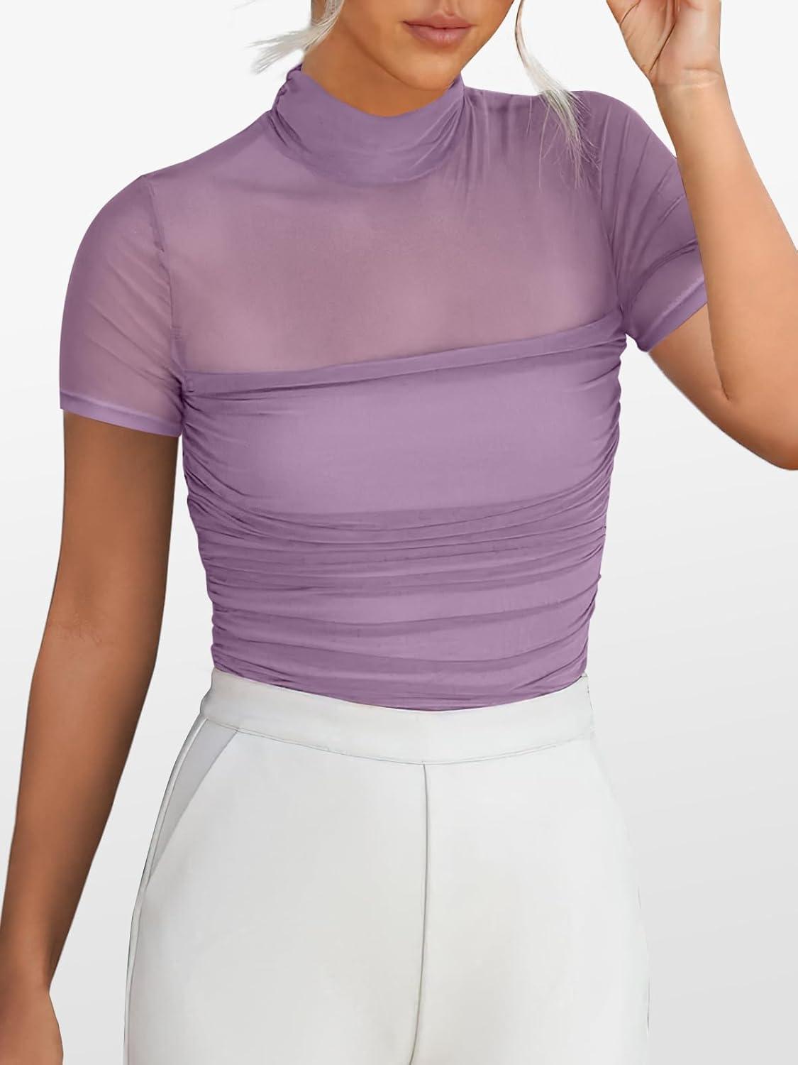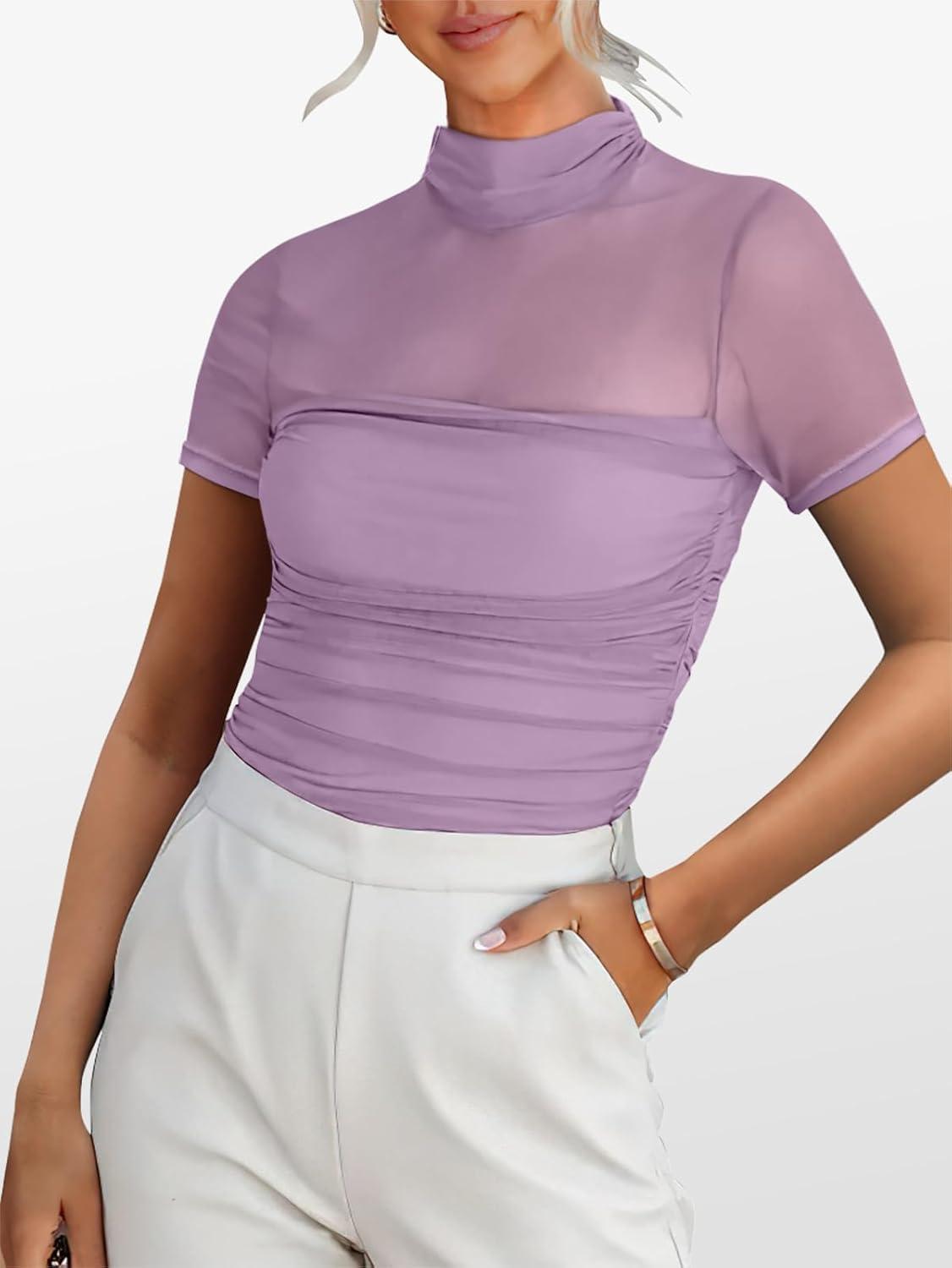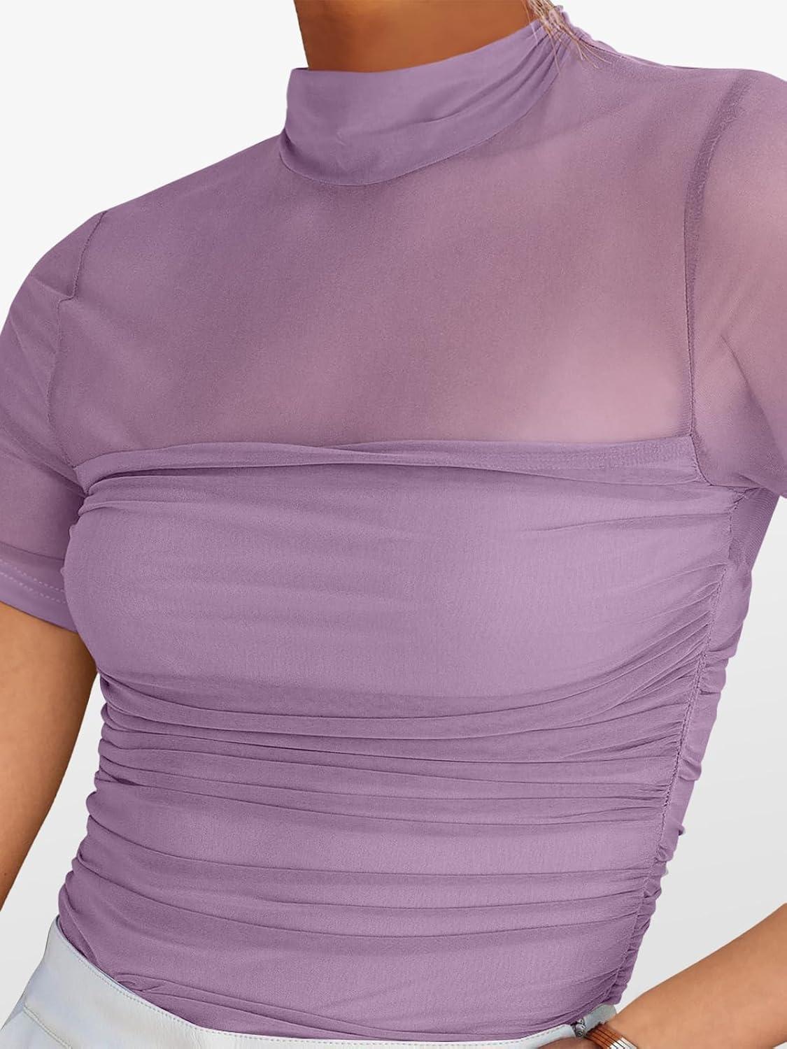 ANRABESS Womens Summer Sexy Mock Turtle Neck Short Sleeve Tops Sheer Mesh Shirts Slim Blouse Trendy Ruched Going Out Outfits(Purple)