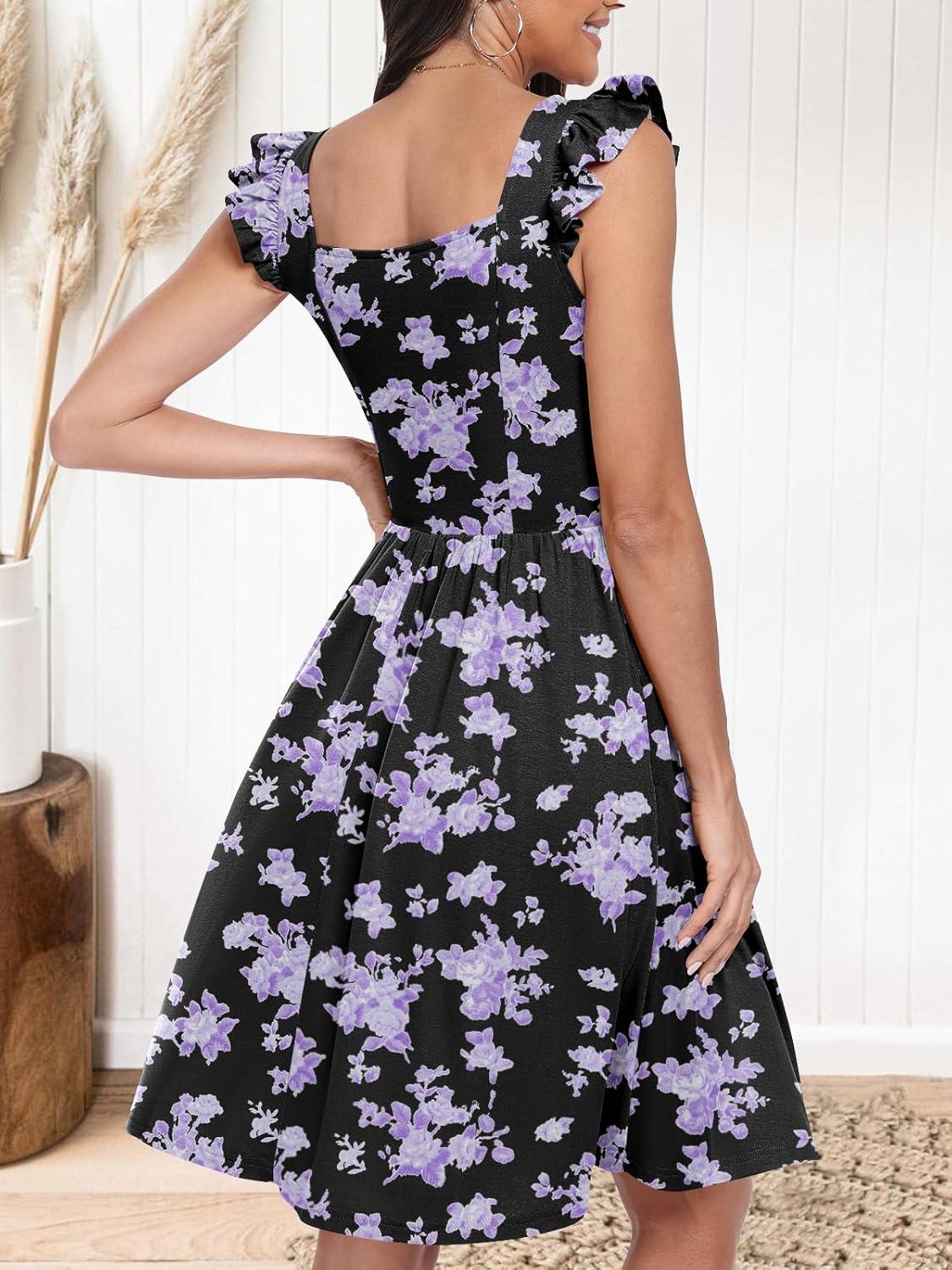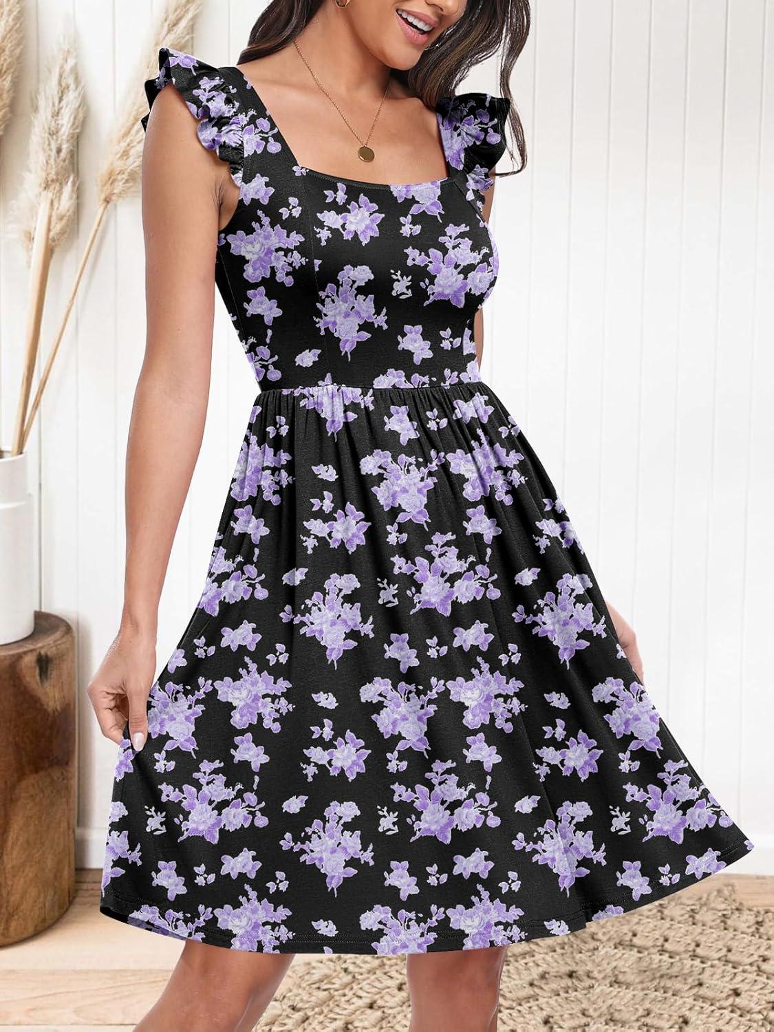 ANRABESS Womens Summer Short Dress 2026 Square Neck Sleeveless A Line Ruffled Wedding Casual Cute Teen Beach Mini Sundress(Purple Floral)