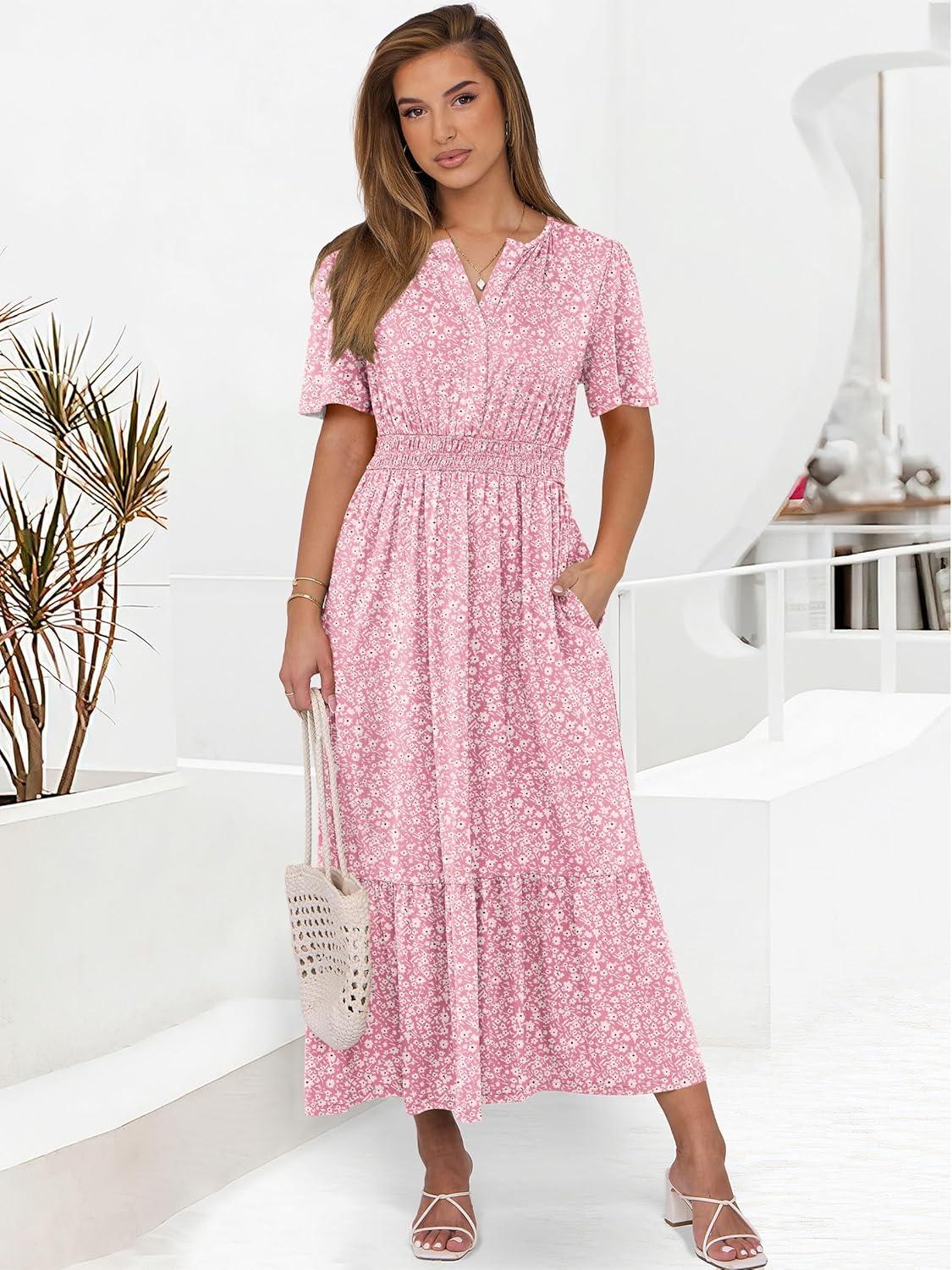 imageANRABESS Womens Summer Short Sleeve Maxi Dress 2025 Casual V Neck High Waist ALine Flowy Loose Tiered Boho Long DressesRed Pink Floral