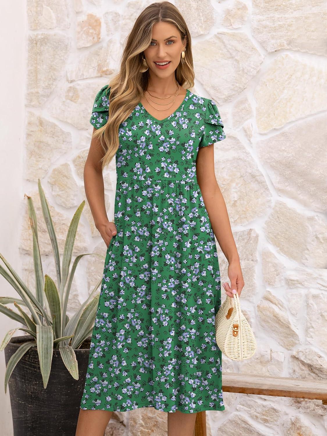 ANRABESS Women’s Summer Short Sleeve Midi Dresses Casual Floral T-Shirt Dress V Neck A-Line Flowy Beach Sundress with Pockets(Print Blue Yellow Floral)