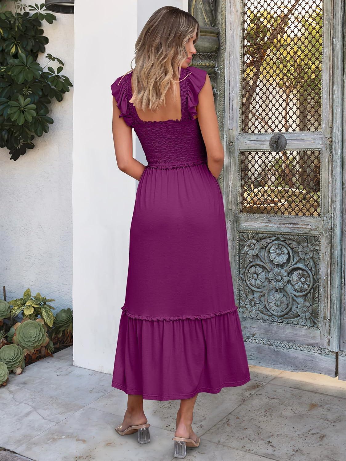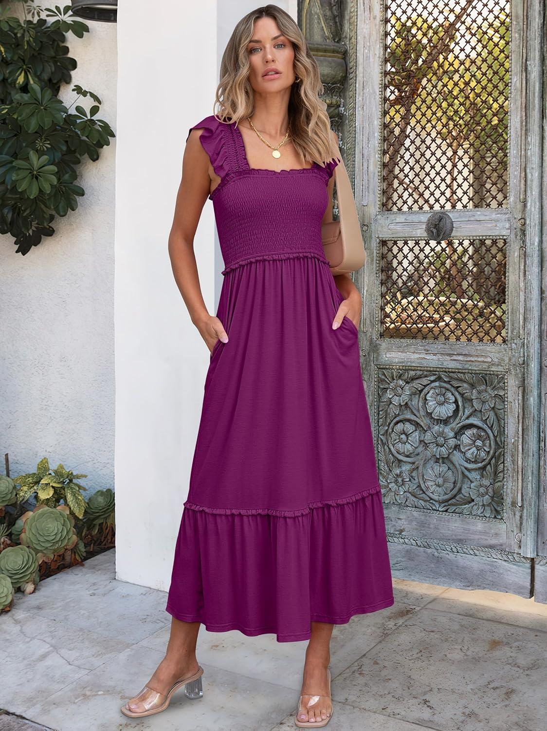 ANRABESS Womens Summer Sleeveless Maxi Dress Square Neck Smocked Boho Casual Ruffle Strap Flowy A-Line Long Beach Sundress(Dark Purple)