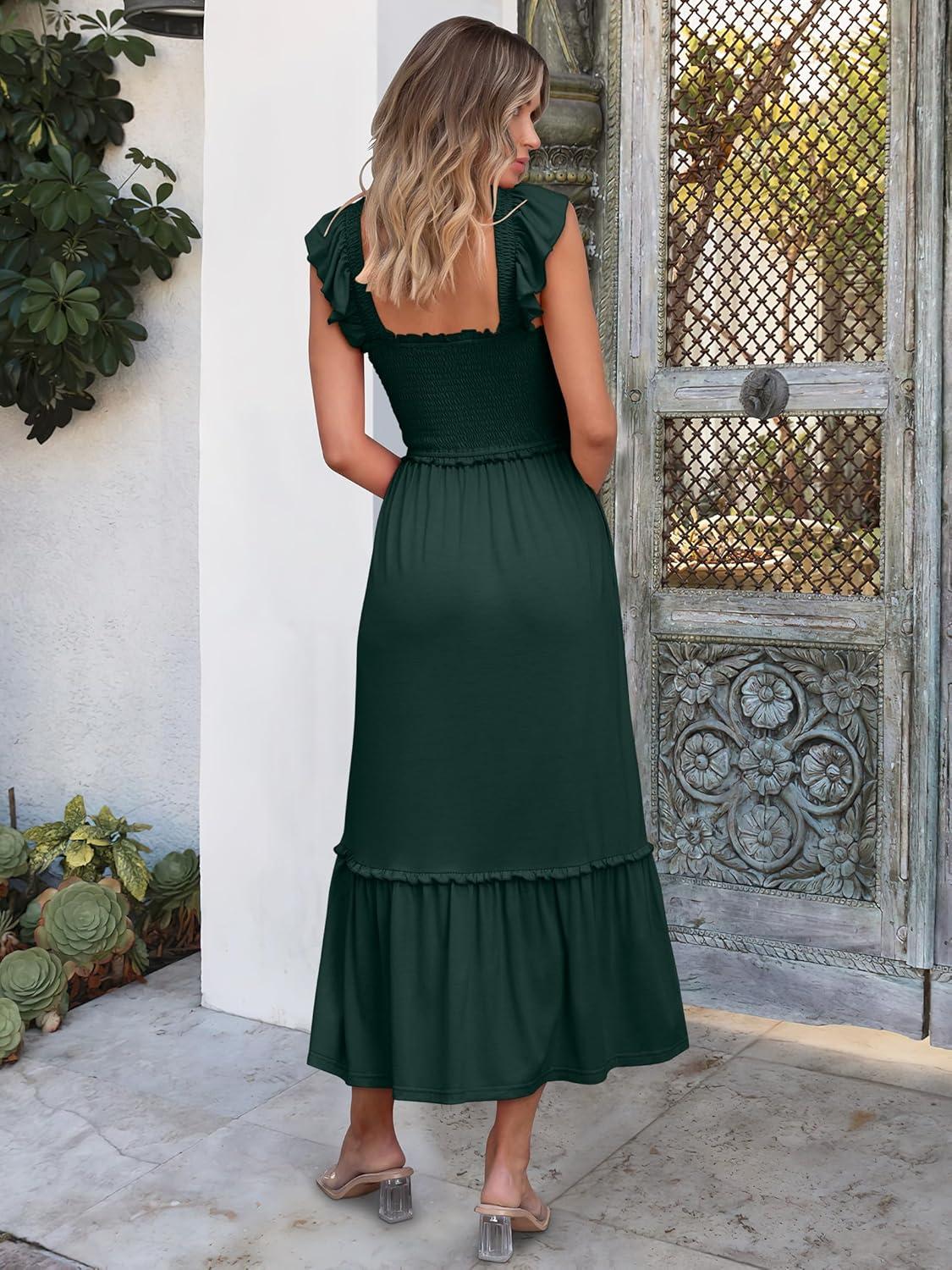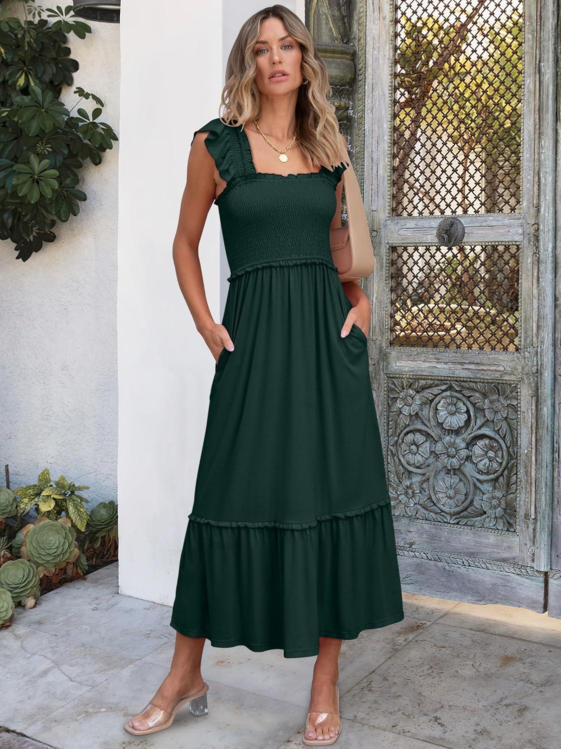 ANRABESS Womens Summer Sleeveless Maxi Dress Square Neck Smocked Boho Casual Ruffle Strap Flowy A-Line Long Beach Sundress(Deep Green)