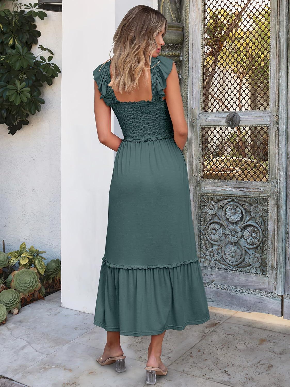 ANRABESS Womens Summer Sleeveless Maxi Dress Square Neck Smocked Boho Casual Ruffle Strap Flowy A-Line Long Beach Sundress(Green)