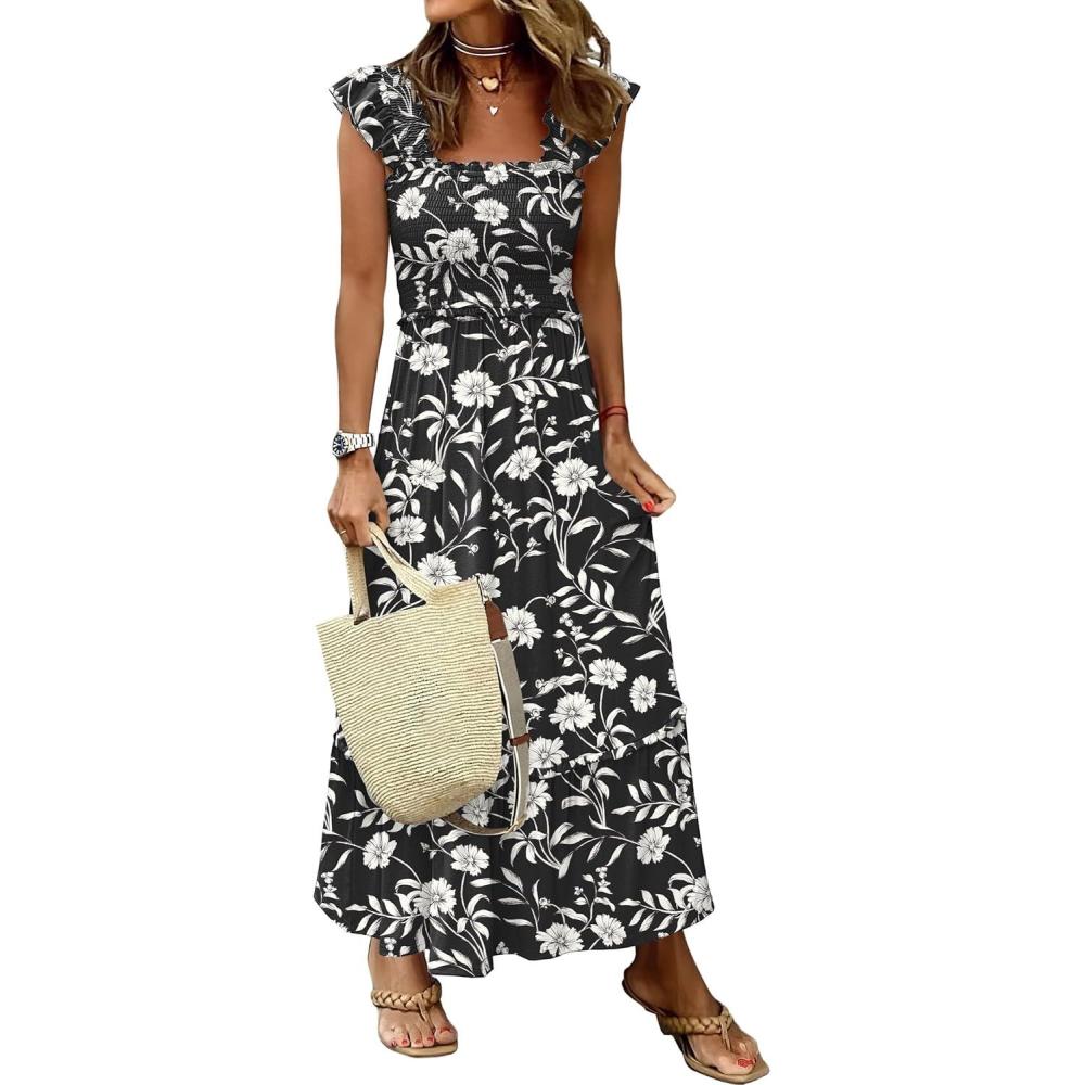 ANRABESS Womens Summer Sleeveless Maxi Dress Square Neck Smocked Boho Casual Ruffle Strap Flowy A-Line Long Beach Sundress(Print Black Floral)