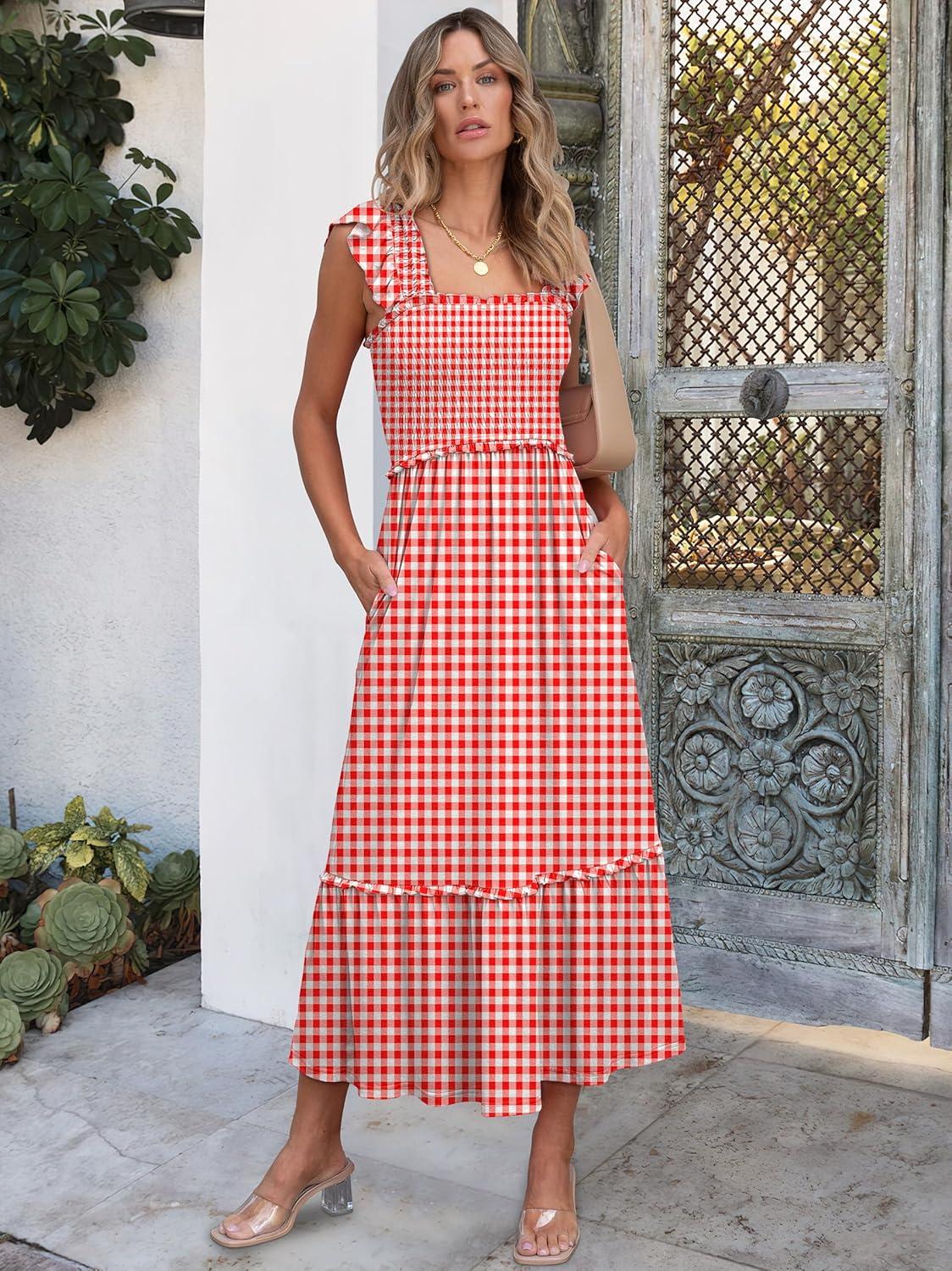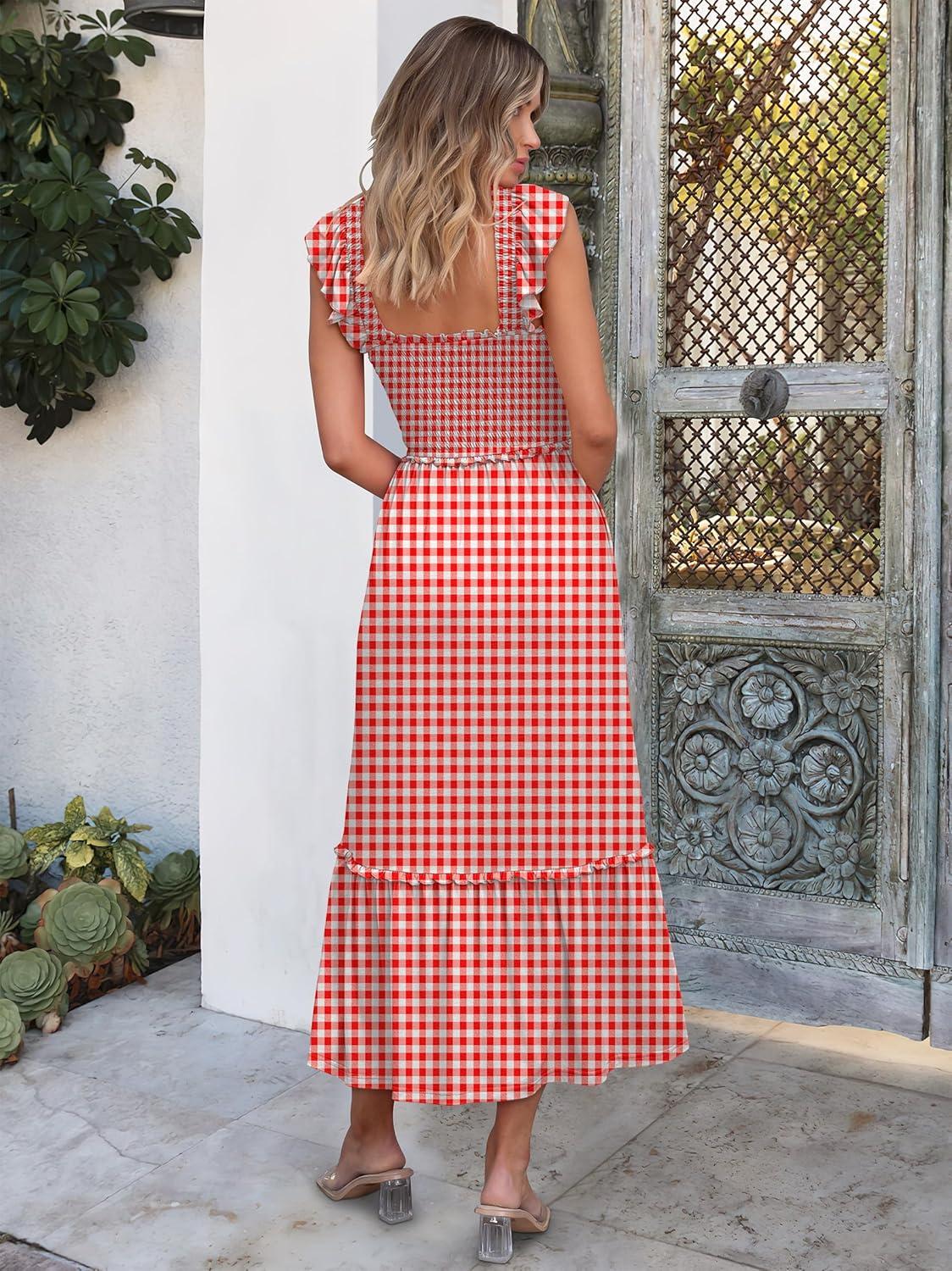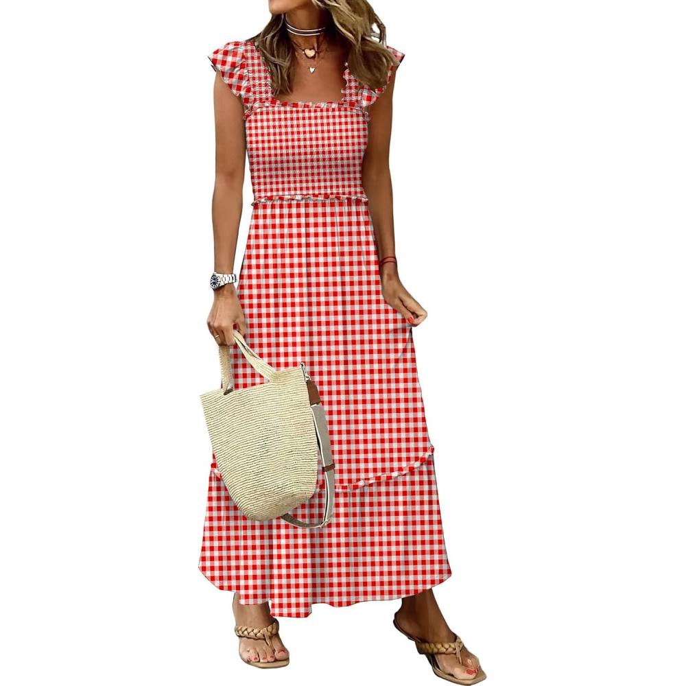 ANRABESS Womens Summer Sleeveless Maxi Dress Square Neck Smocked Boho Casual Ruffle Strap Flowy A-Line Long Beach Sundress(Red Plaid)
