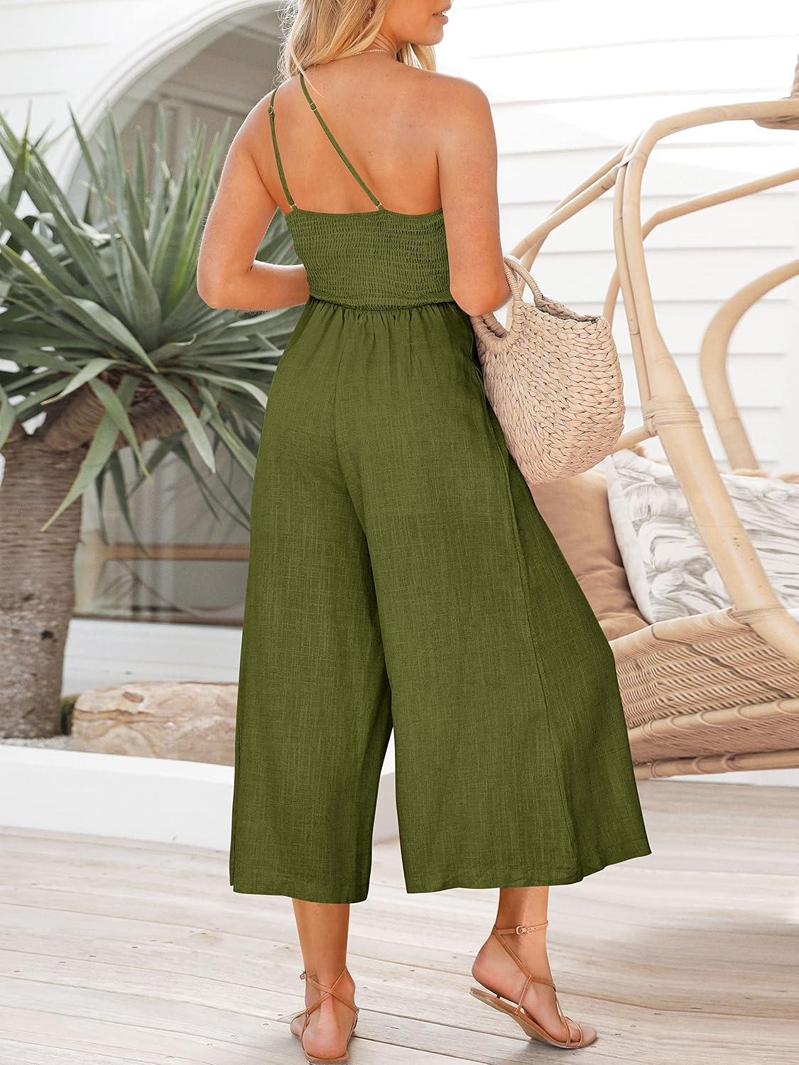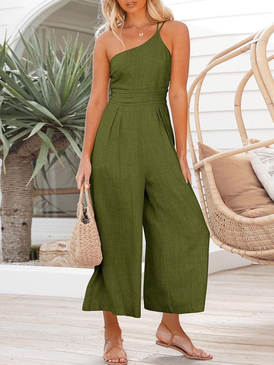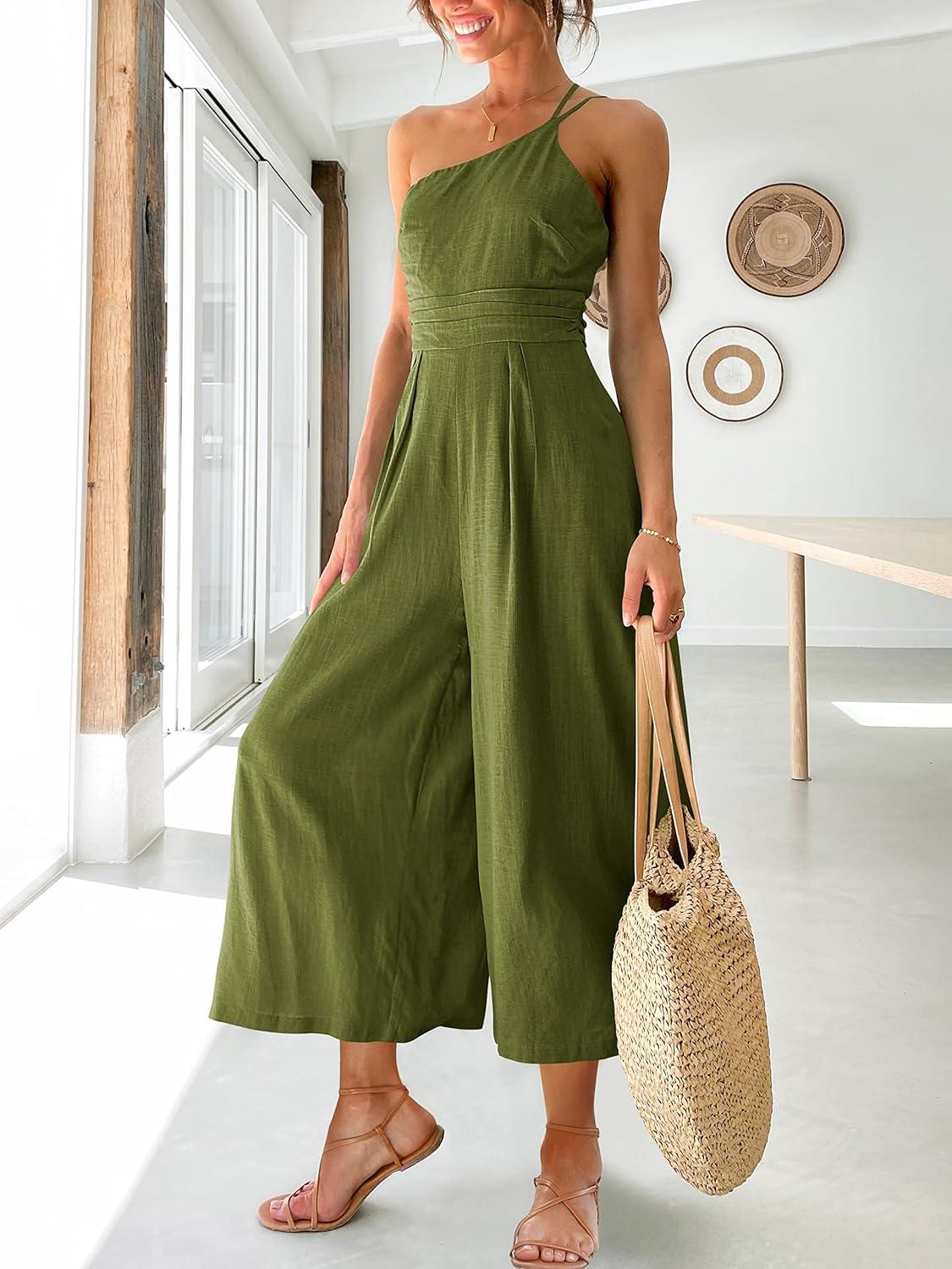 ANRABESS Women’s Summer Straps One Shoulder High Waist Dressy Casual Wide Leg Linen Jumpsuit Romper Beach Travel Outfits(Army Green)