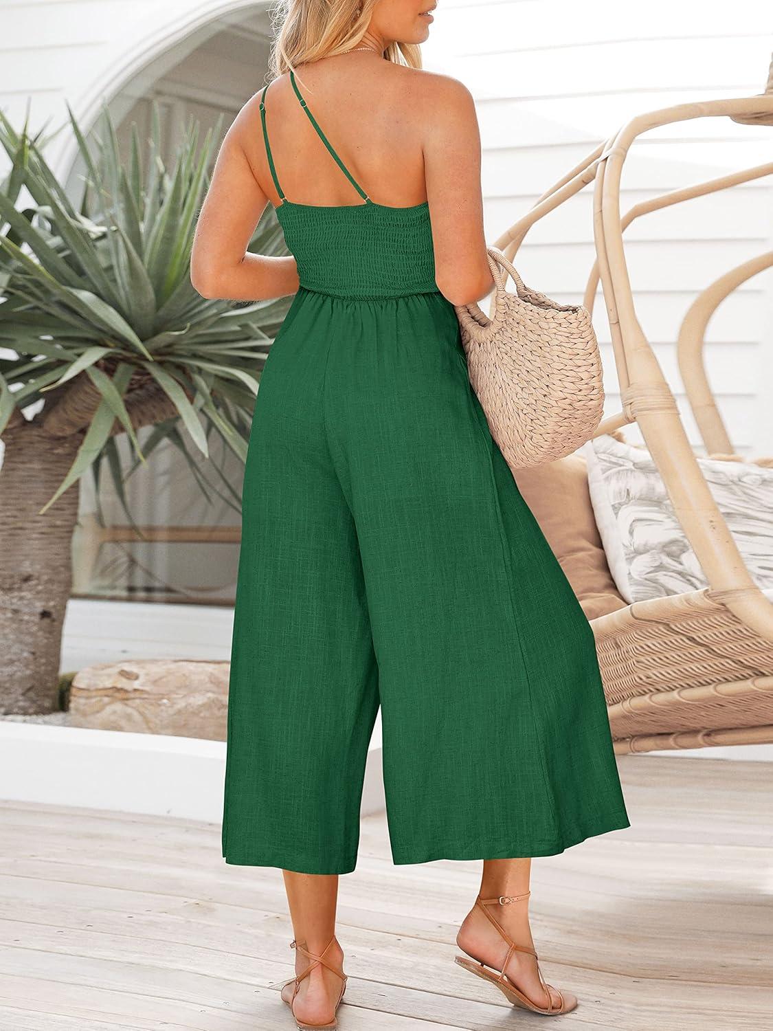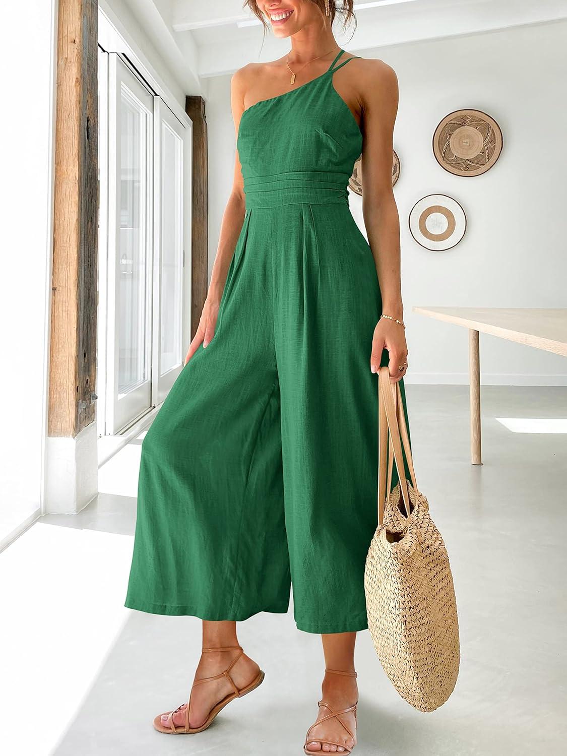 imageANRABESS Womens Summer Straps One Shoulder High Waist Dressy Casual Wide Leg Linen Jumpsuit Romper Beach Travel OutfitsForest