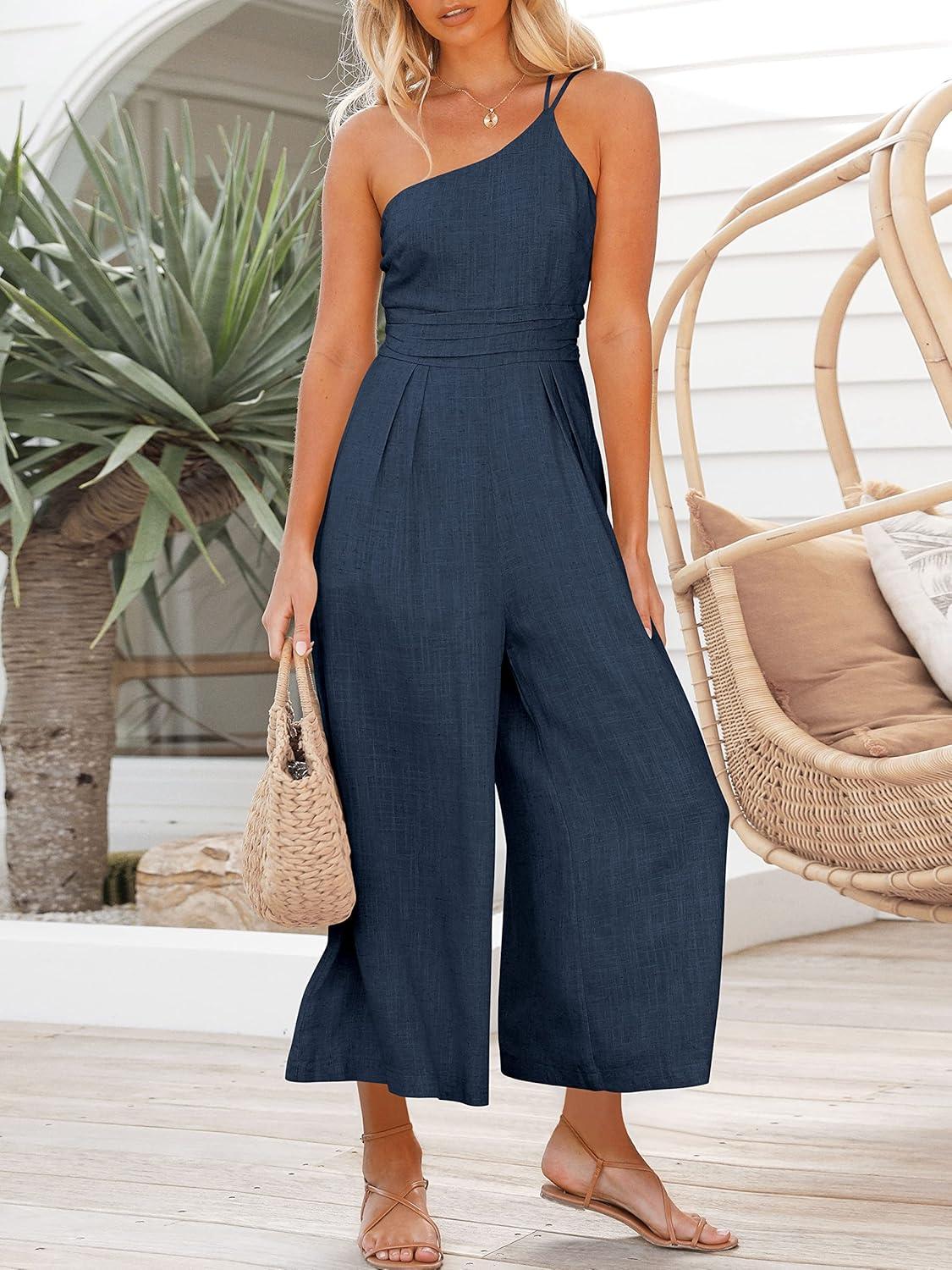 ANRABESS Women’s Summer Straps One Shoulder High Waist Dressy Casual Wide Leg Linen Jumpsuit Romper Beach Travel Outfits(Navy Blue)