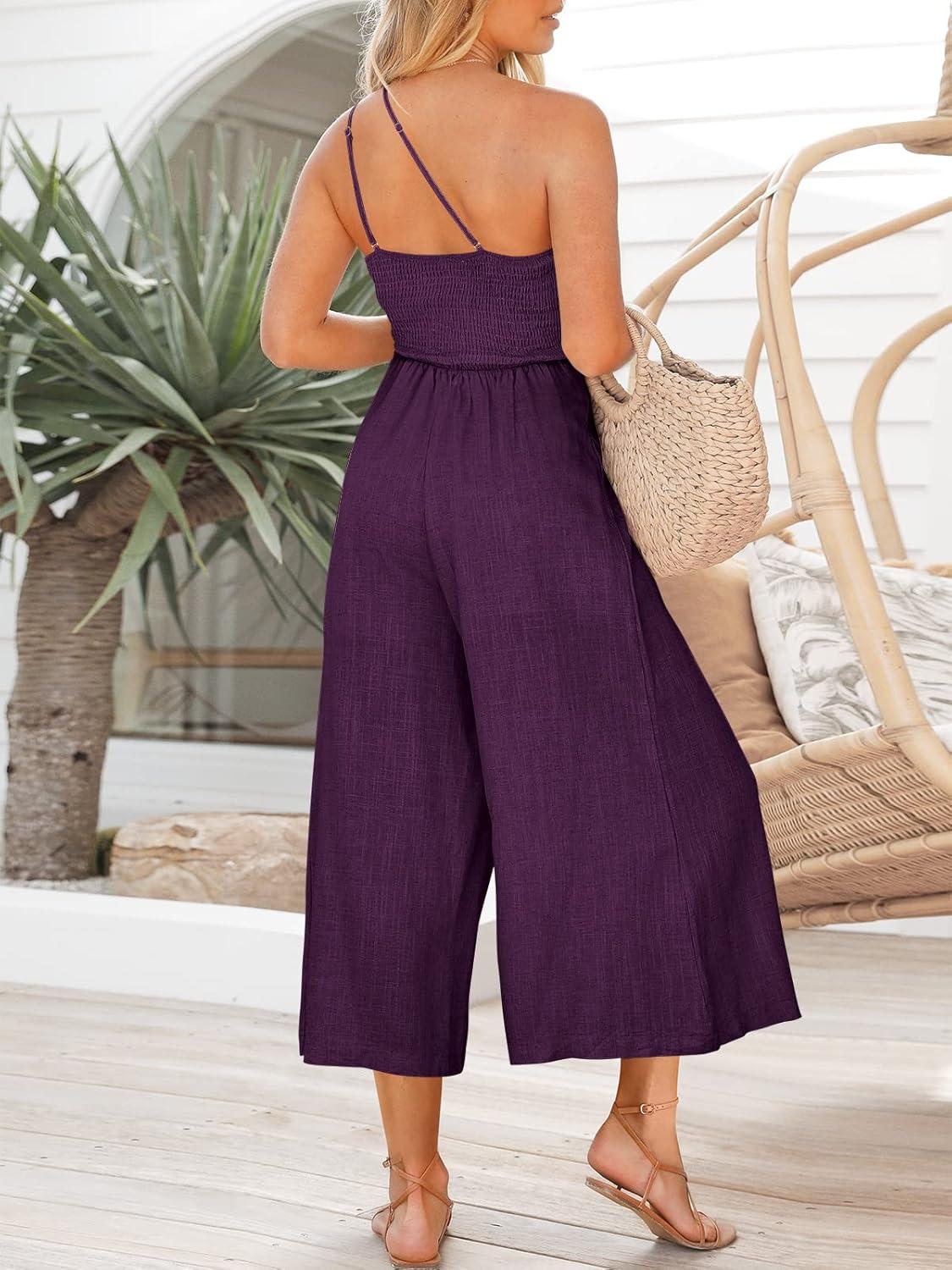 ANRABESS Women's Summer Straps One Shoulder High Waist Dressy Casual Wide Leg Linen Jumpsuit Romper Beach Travel Outfits(Purple)