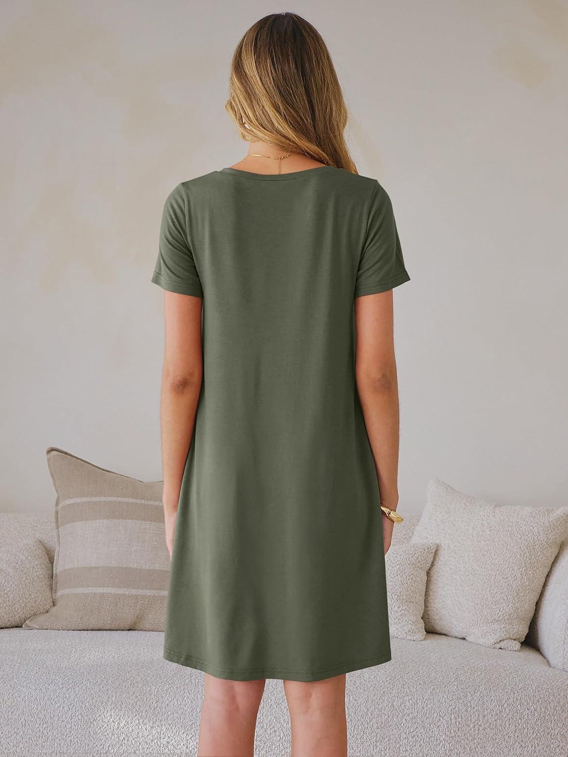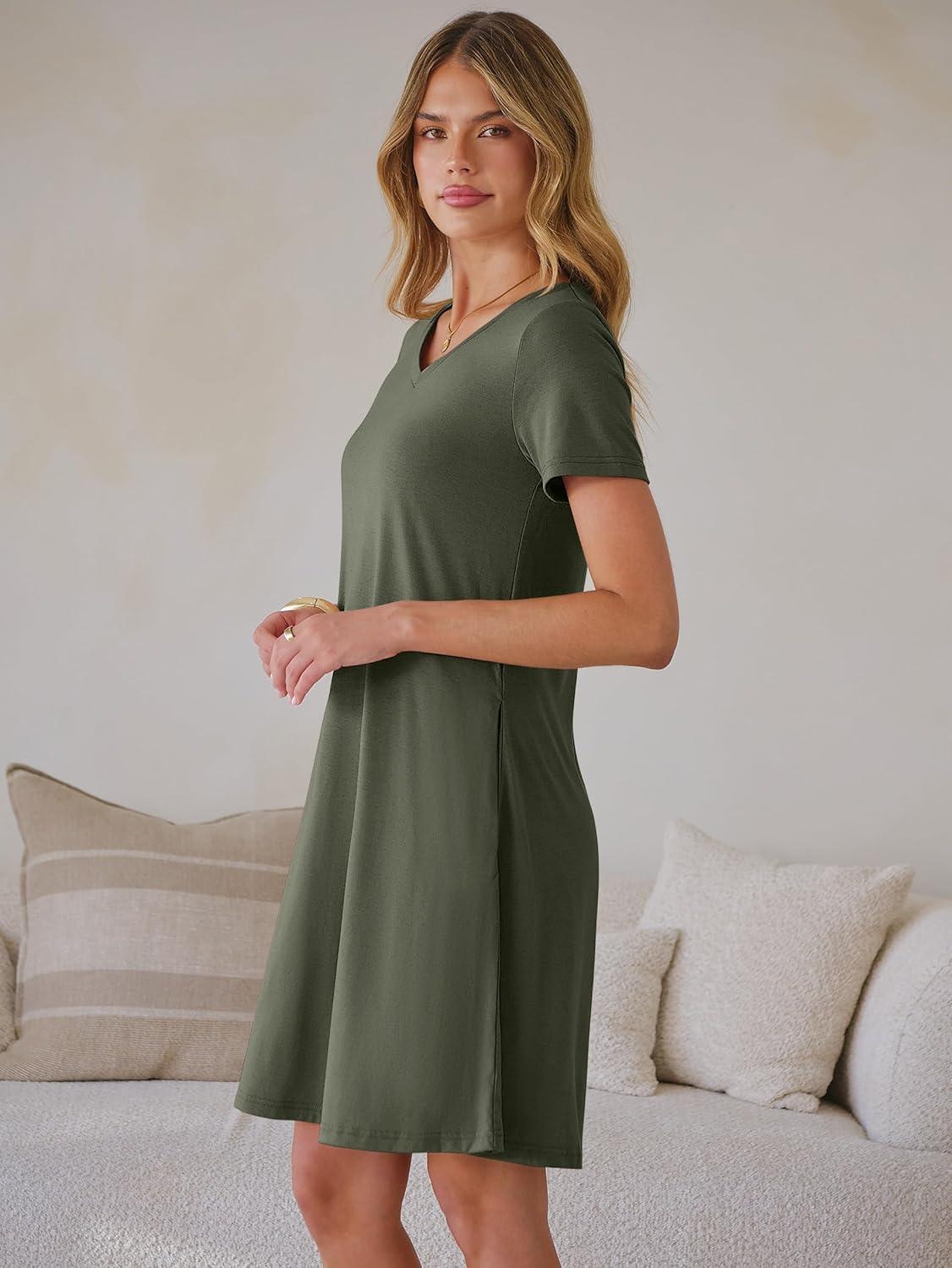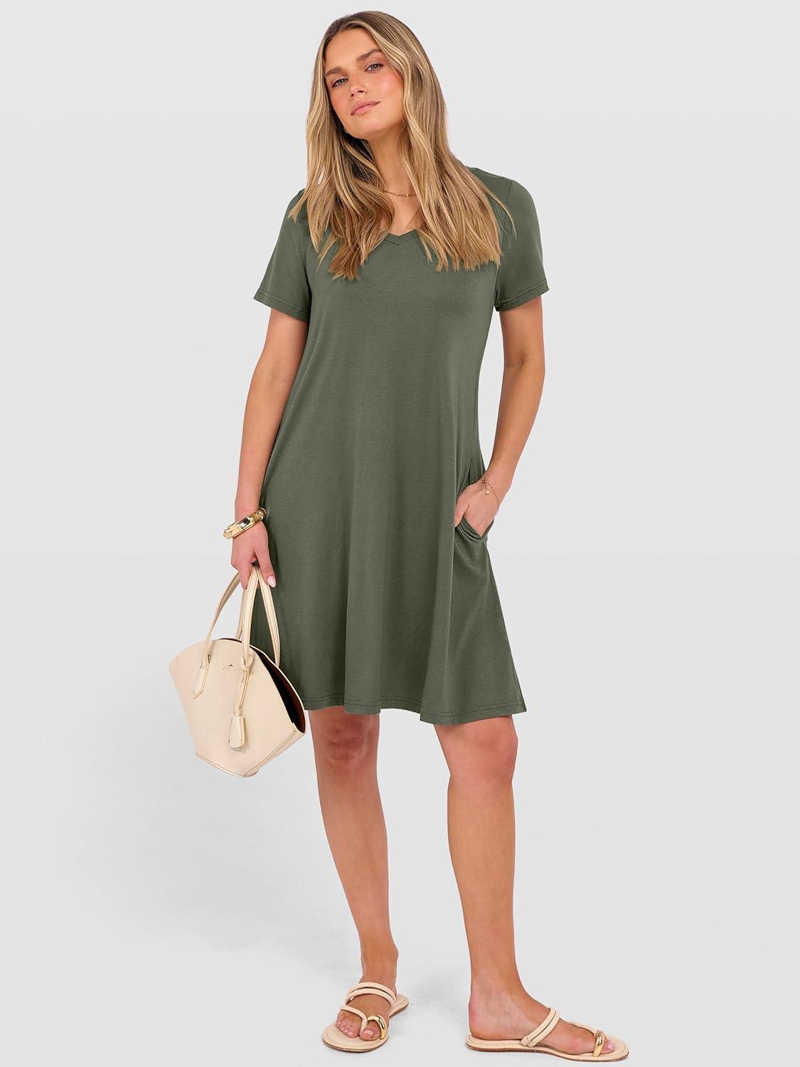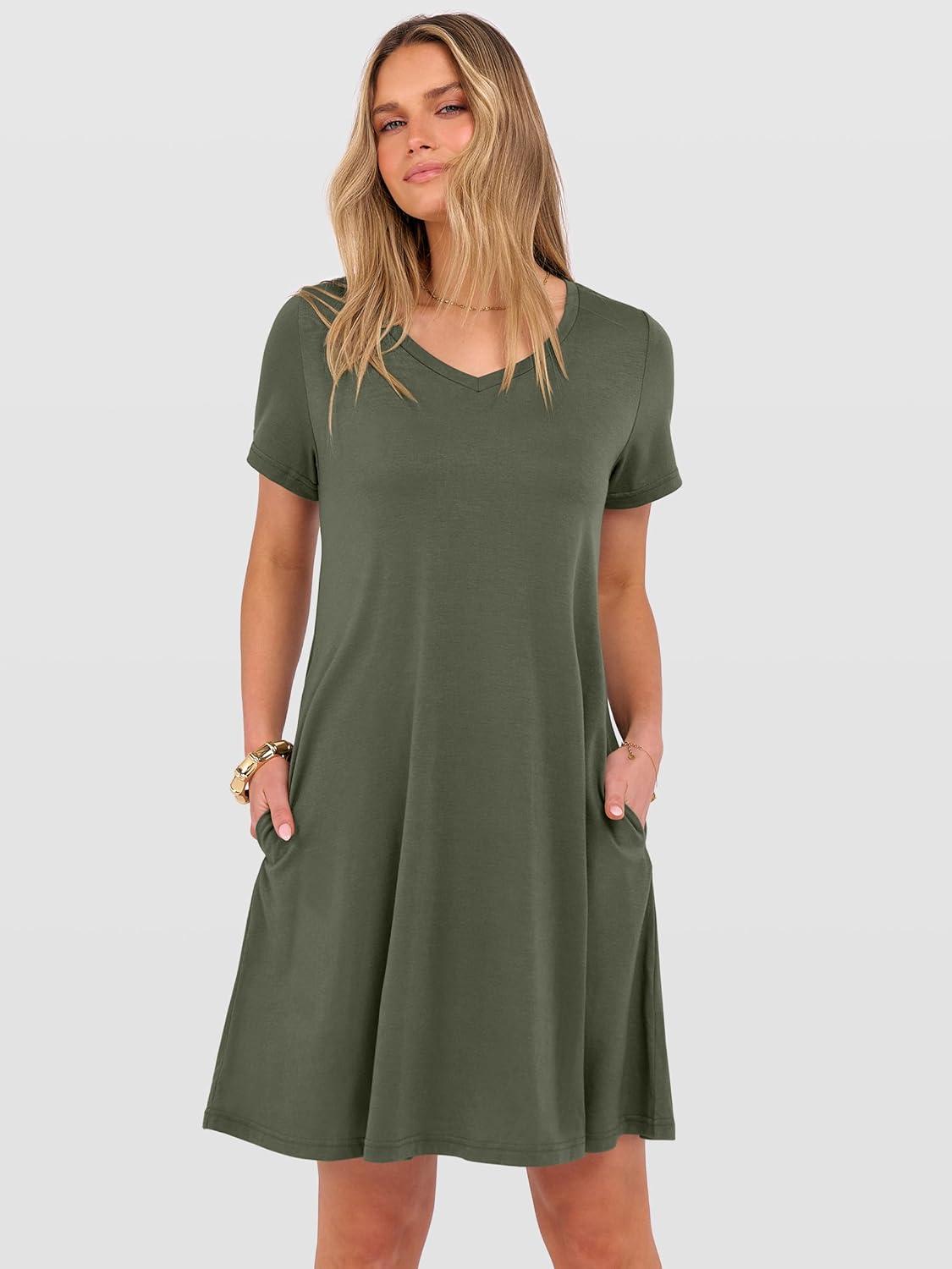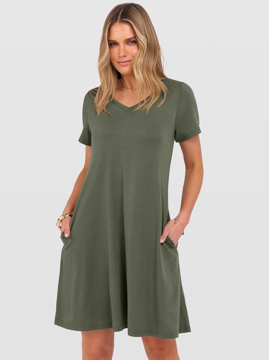 ANRABESS Women's Summer T Shirt Dress Casual V Neck Short Sleeve Floral Boho Flowy Mini Dresses 2026 Beach Vacation Clothes(Army Green)
