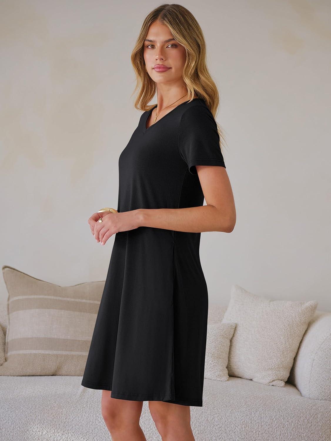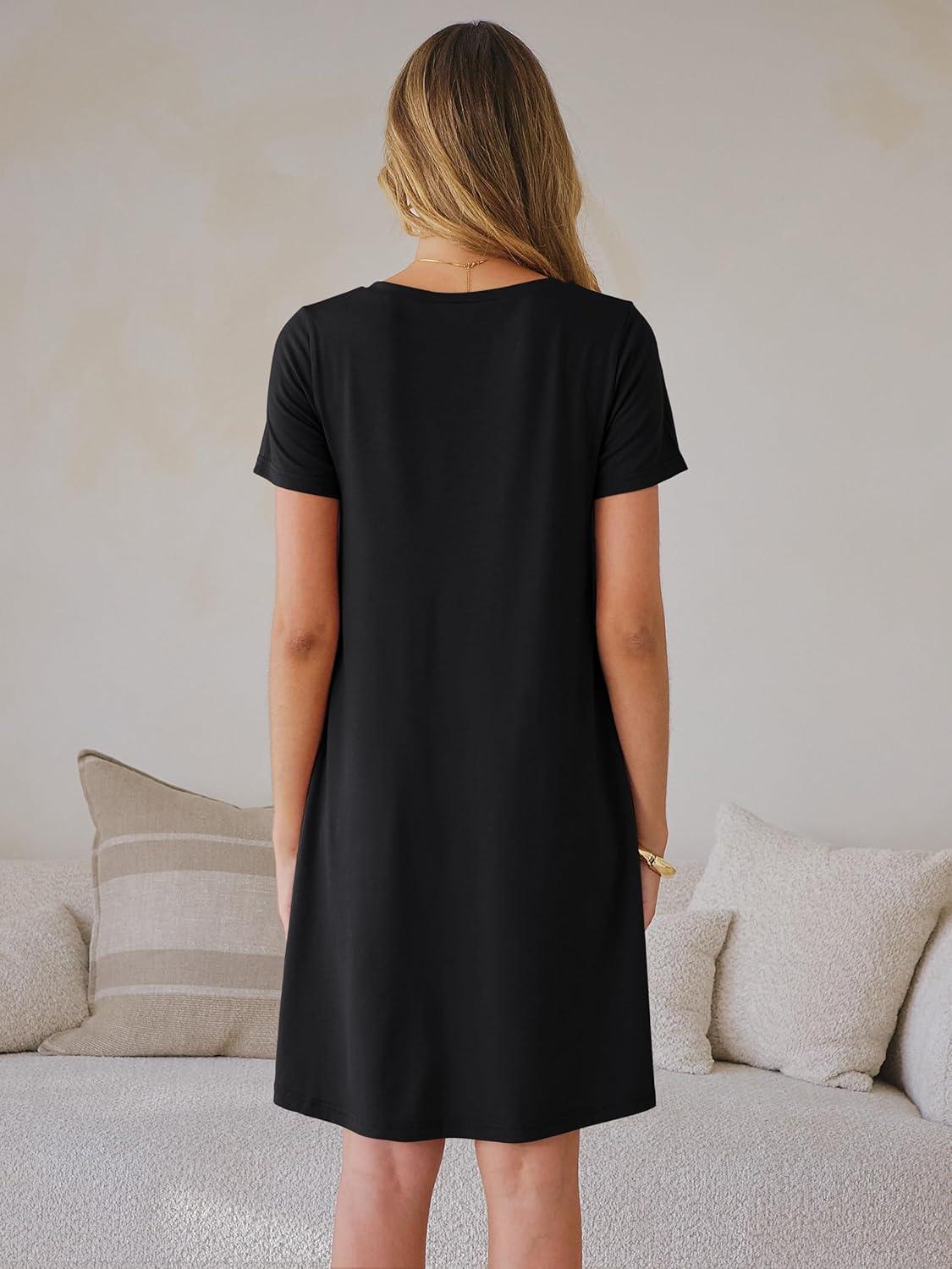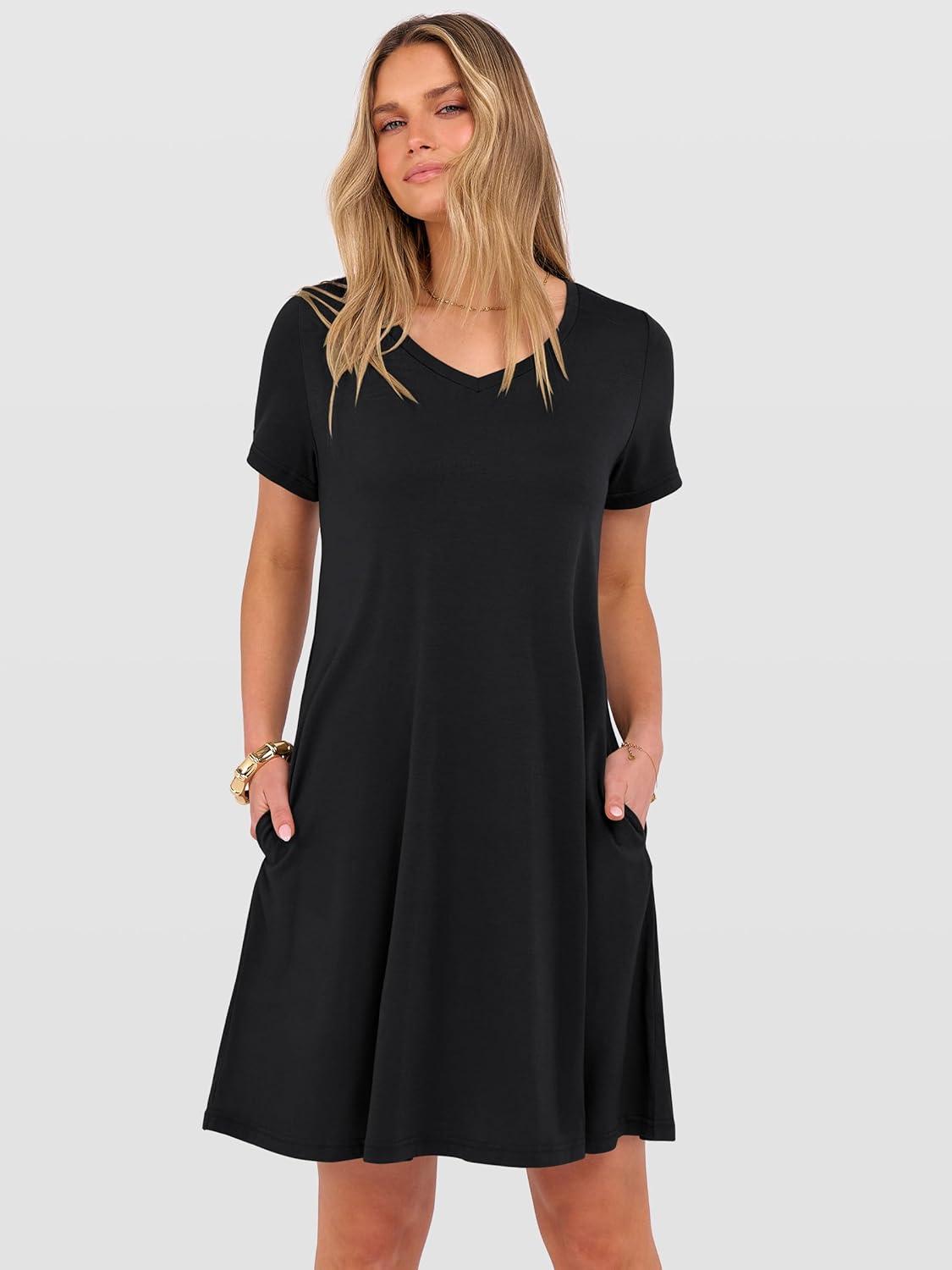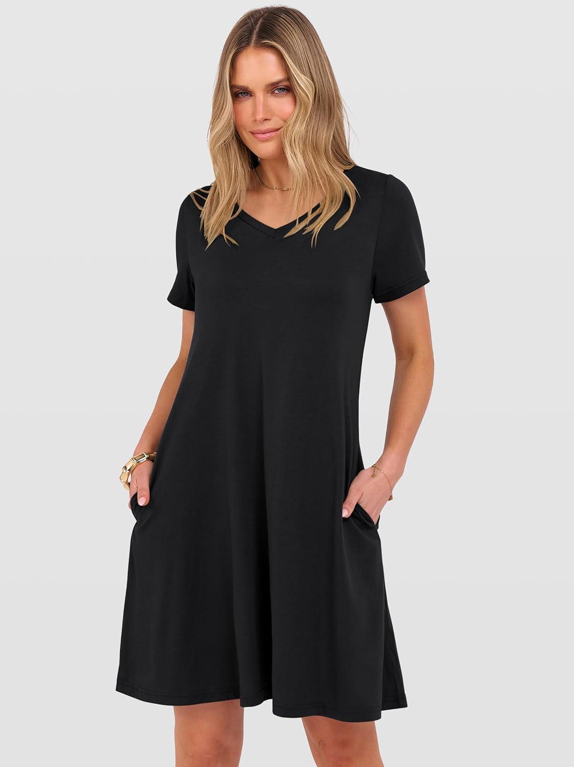 ANRABESS Women’s Summer T Shirt Dress Casual V Neck Short Sleeve Floral Boho Flowy Mini Dresses 2026 Beach Vacation Clothes(Black)