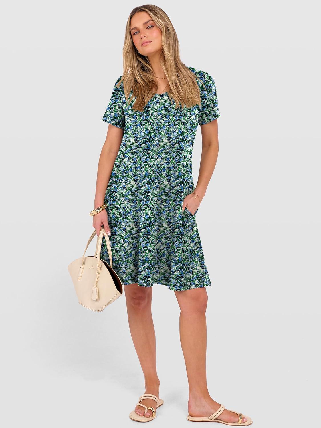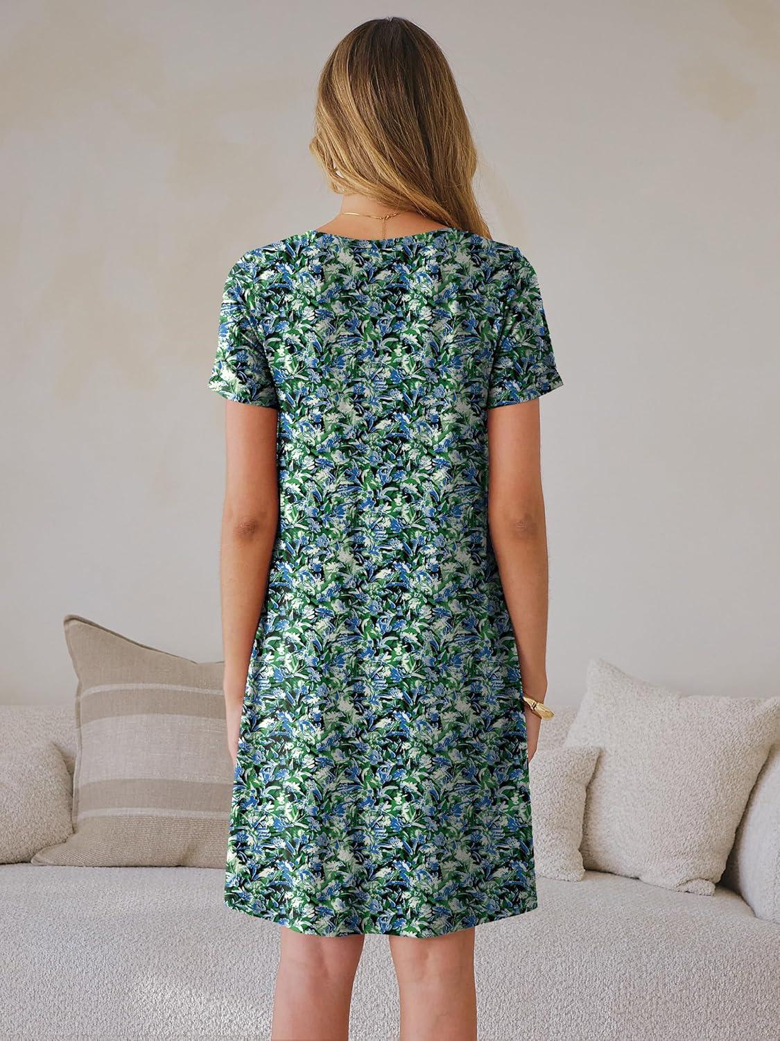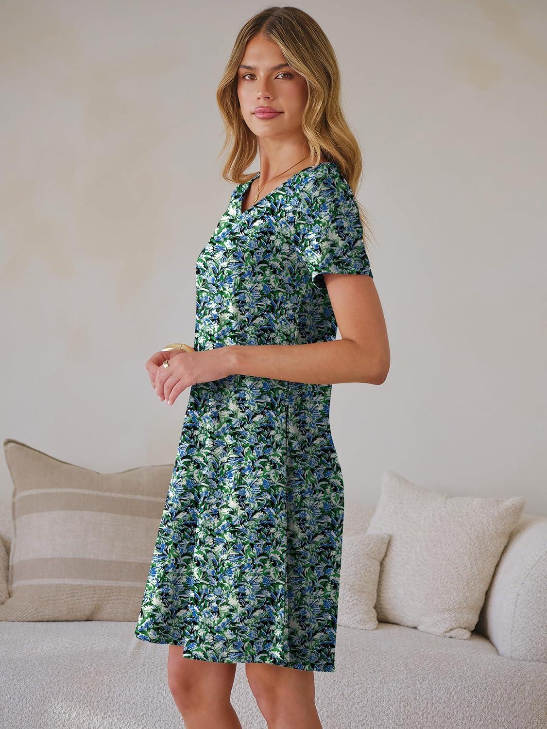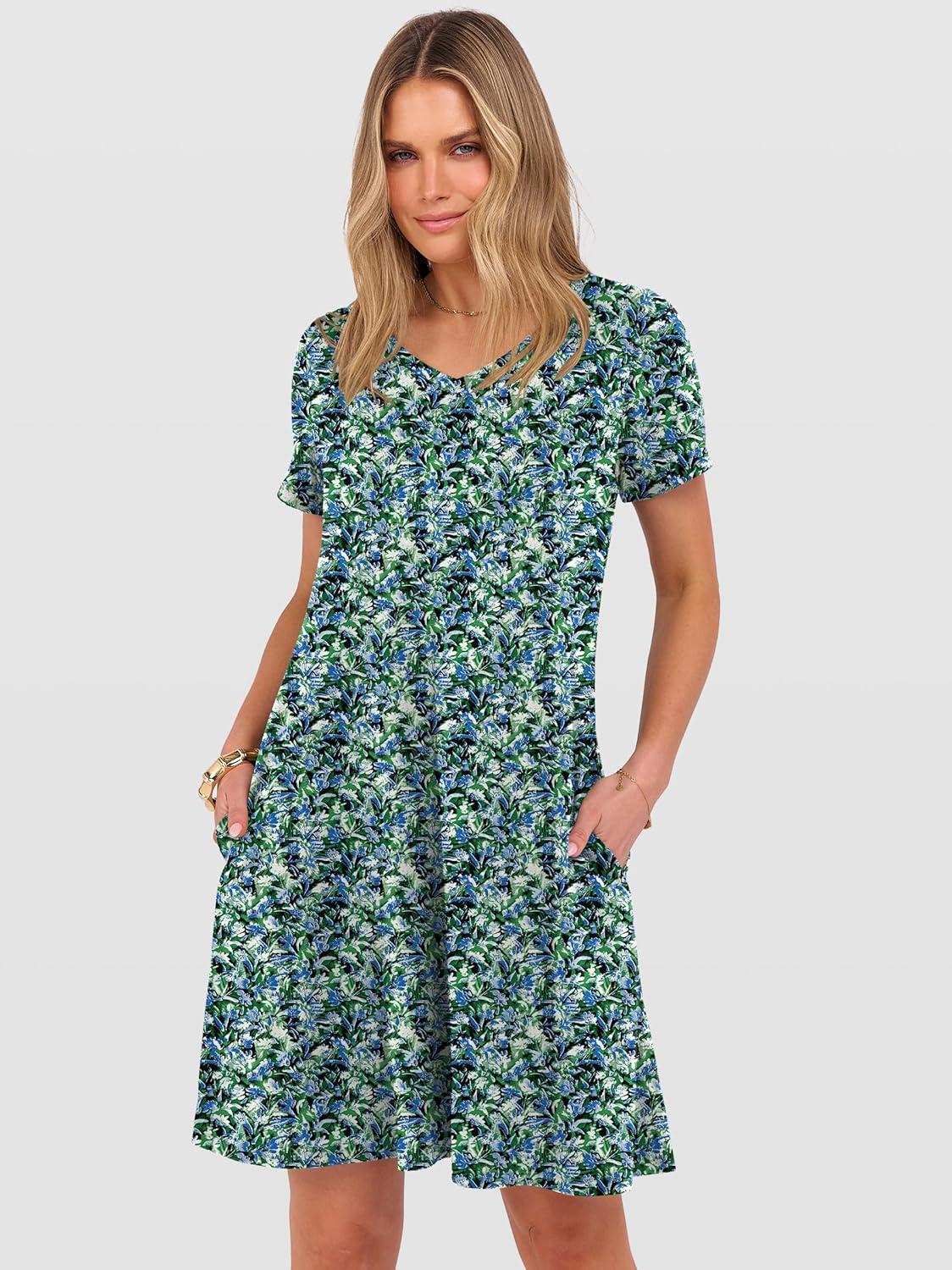 ANRABESS Women’s Summer T Shirt Dress Casual V Neck Short Sleeve Floral Boho Flowy Mini Dresses 2026 Beach Vacation Clothes(Floral Blue Green)