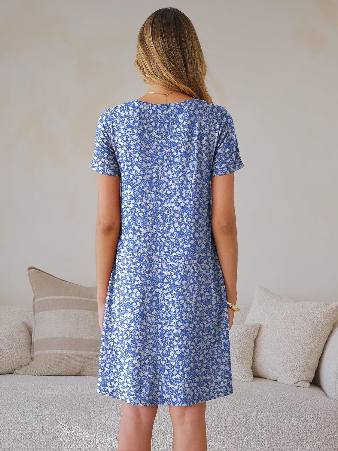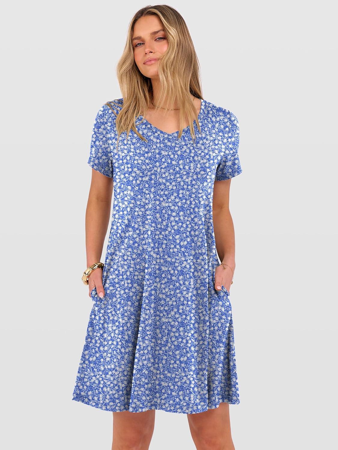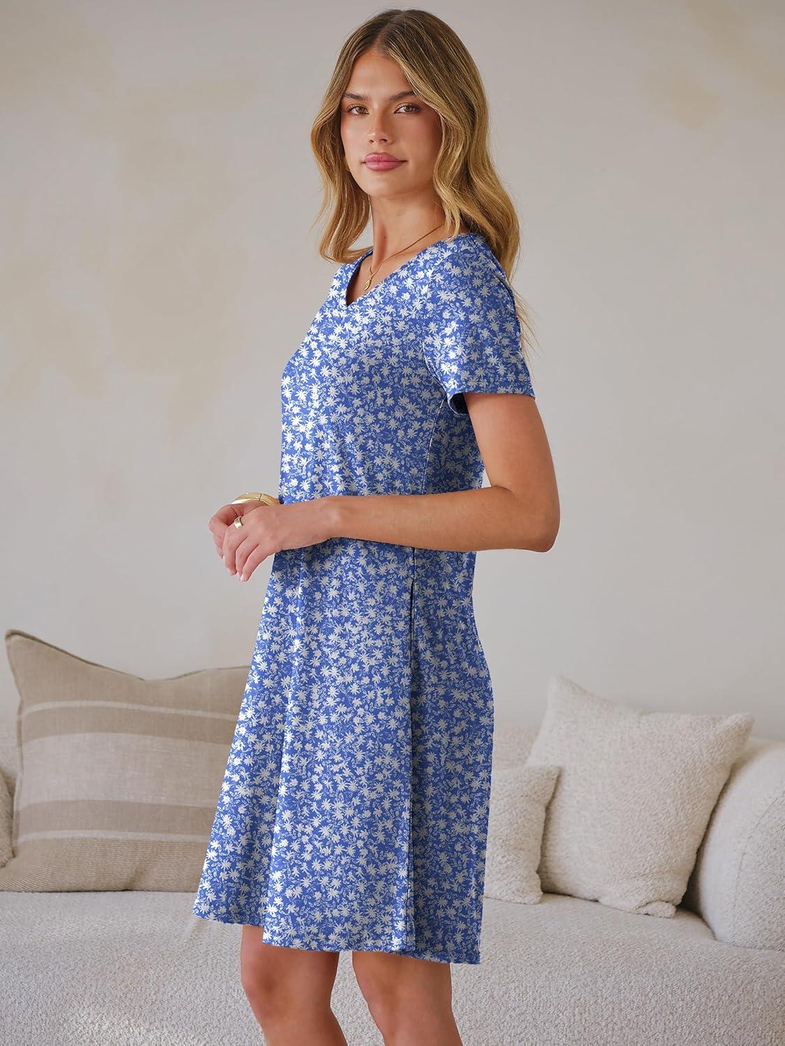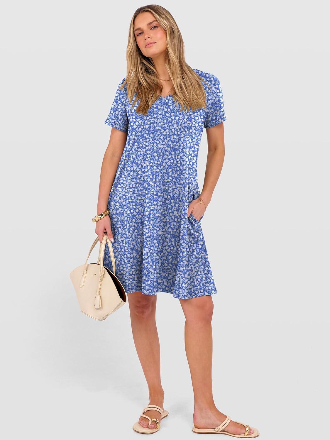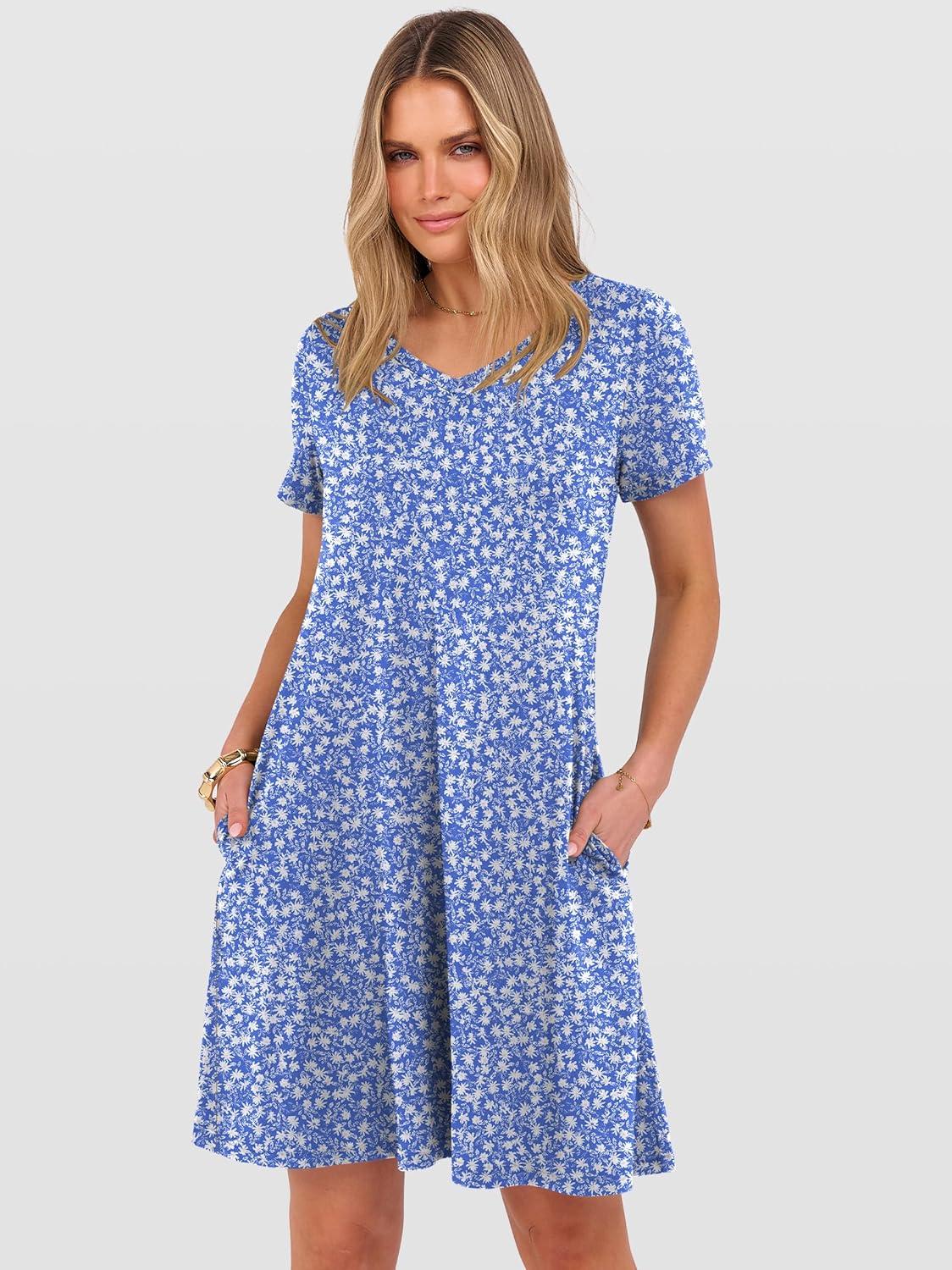 ANRABESS Women’s Summer T Shirt Dress Casual V Neck Short Sleeve Floral Boho Flowy Mini Dresses 2026 Beach Vacation Clothes(Floral Blue White)