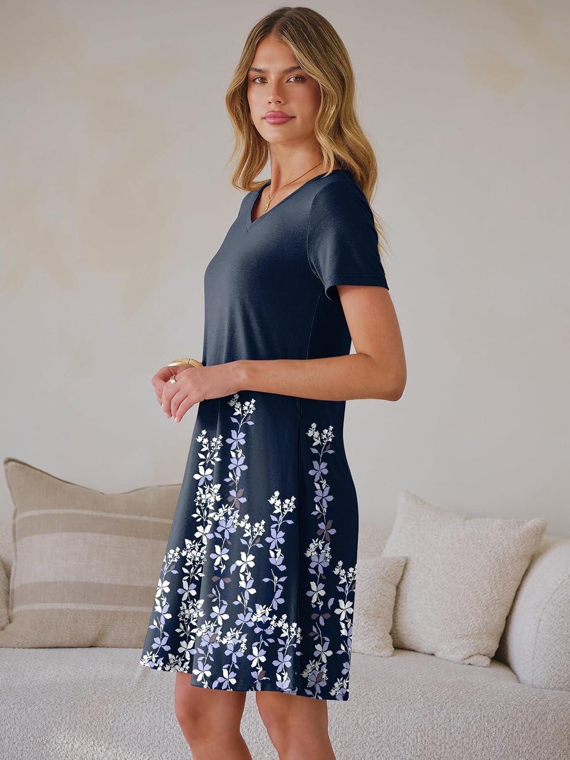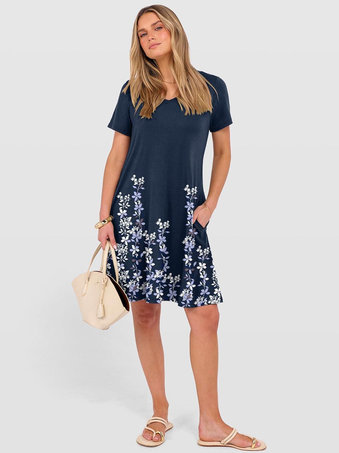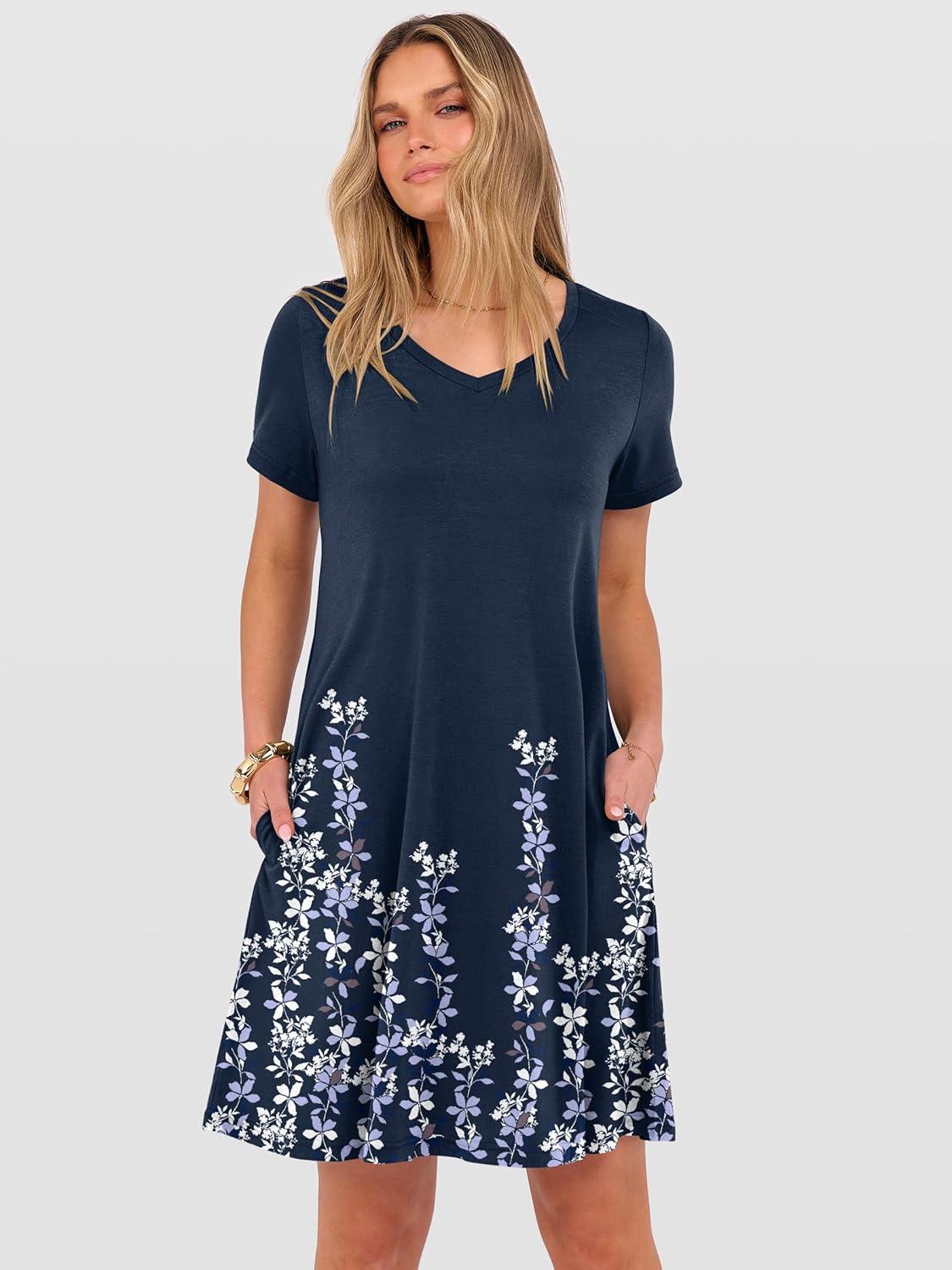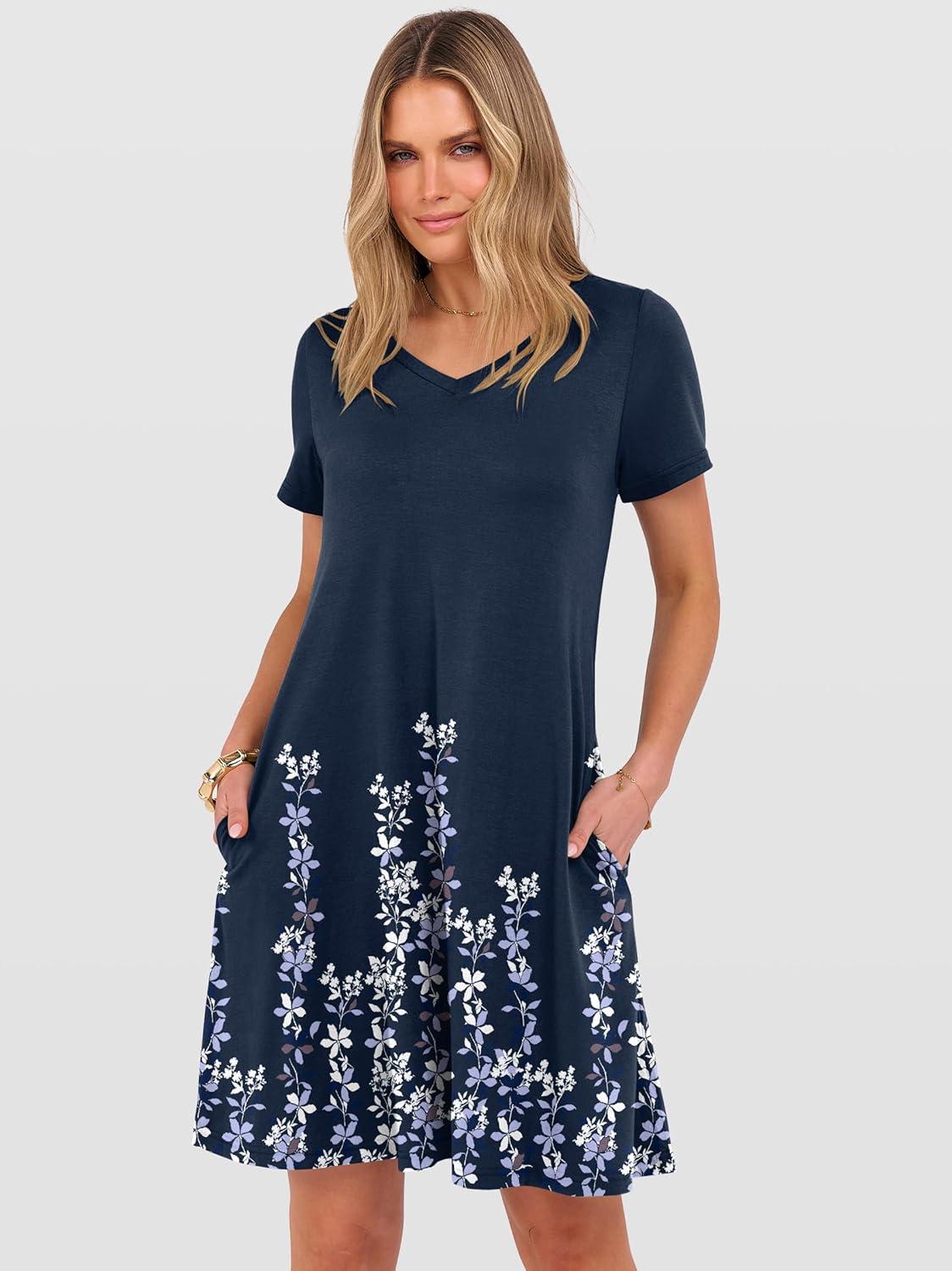 ANRABESS Women’s Summer T Shirt Dress Casual V Neck Short Sleeve Floral Boho Flowy Mini Dresses 2026 Beach Vacation Clothes(Floral Navy Blue Hem)