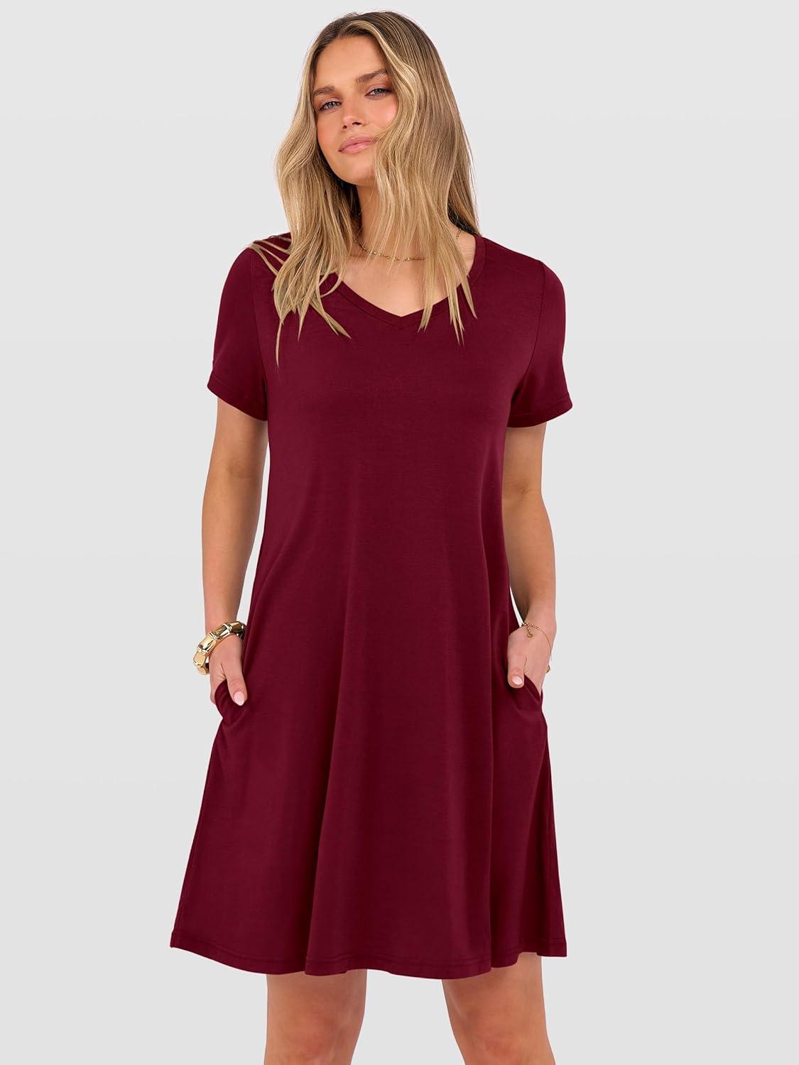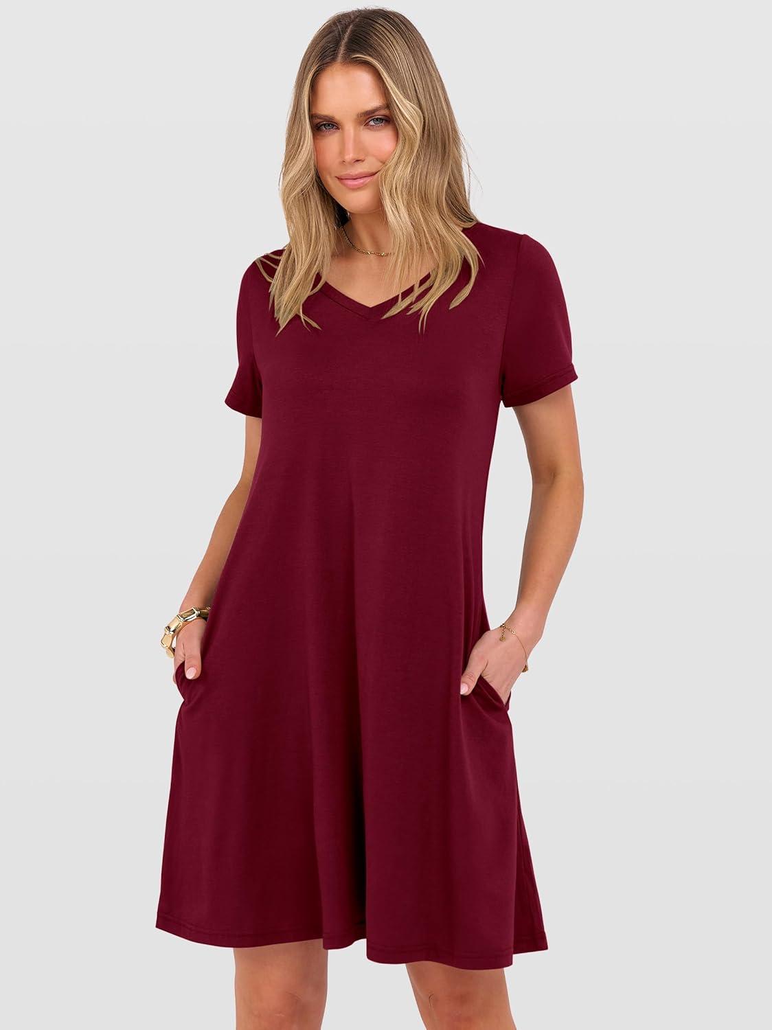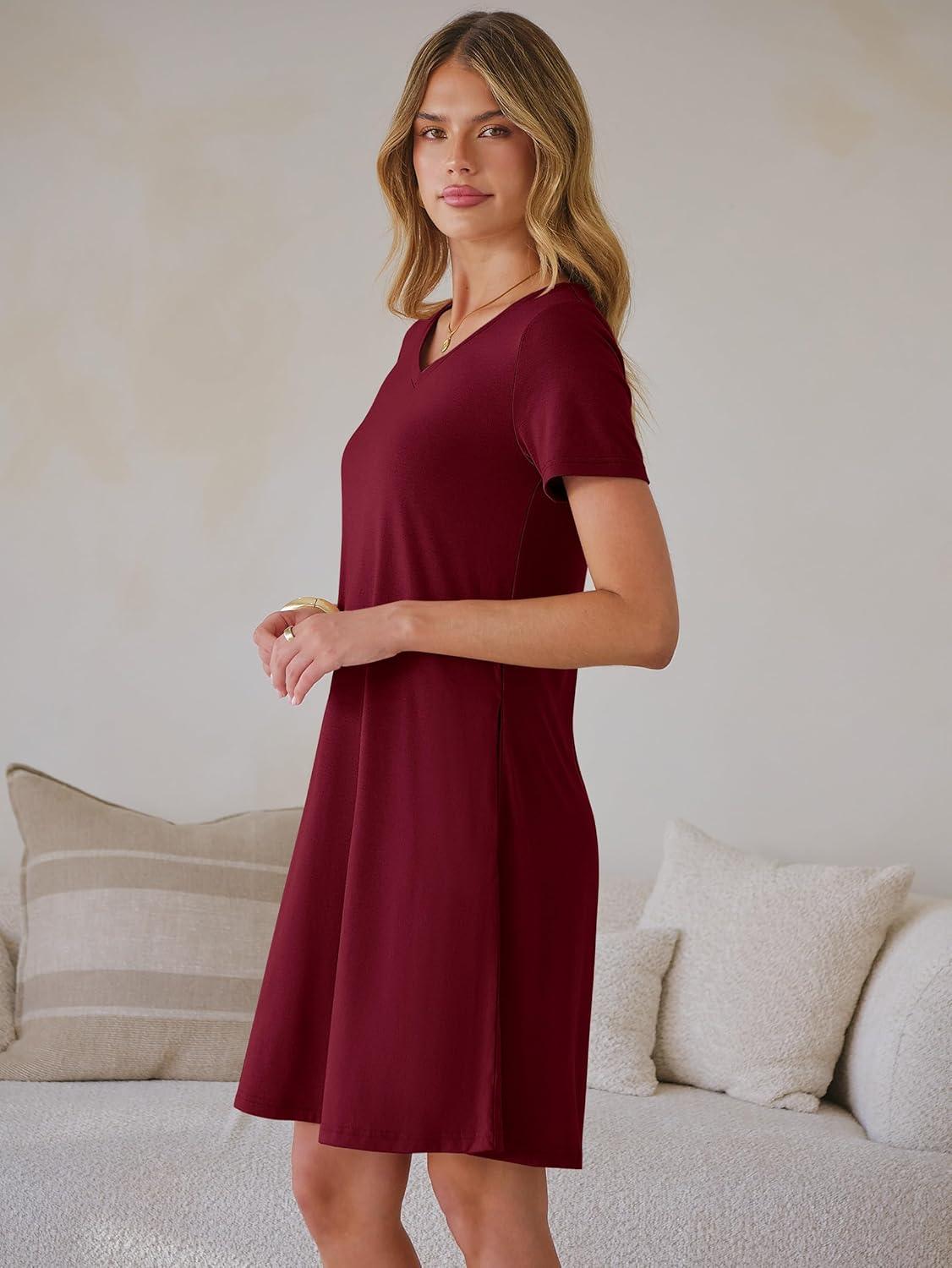 ANRABESS Women's Summer T Shirt Dress Casual V Neck Short Sleeve Floral Boho Flowy Mini Dresses 2026 Beach Vacation Clothes(Wine Red)