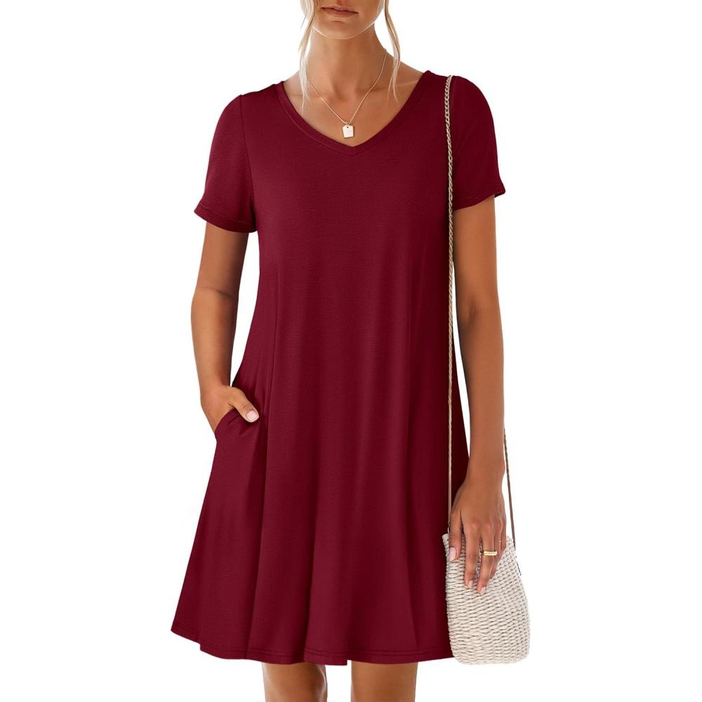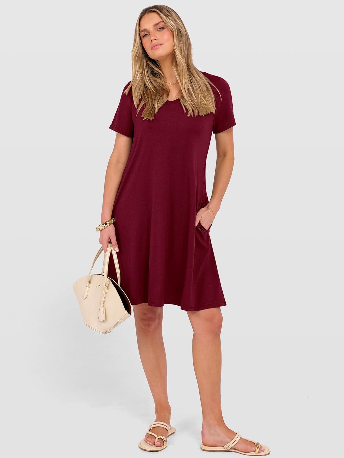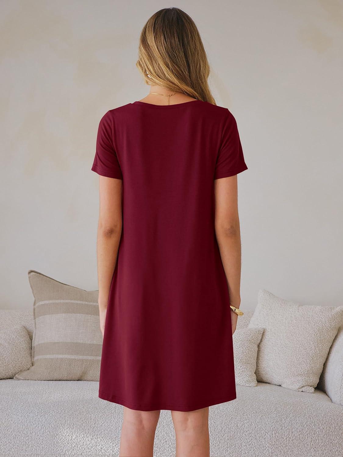 ANRABESS Women's Summer T Shirt Dress Casual V Neck Short Sleeve Floral Boho Flowy Mini Dresses 2026 Beach Vacation Clothes(Wine Red)