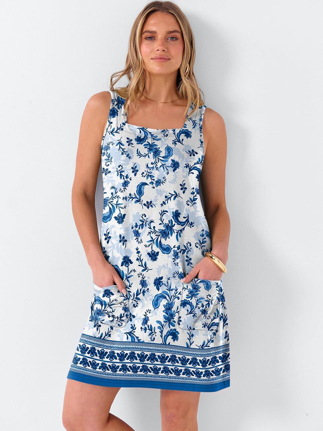 ANRABESS Womens Summer Tank Dress Square Neck Sleeveless Mini Sundress with Pocket 2026 Casual Floral Beach Vacation Outfits(Floral Blue White)