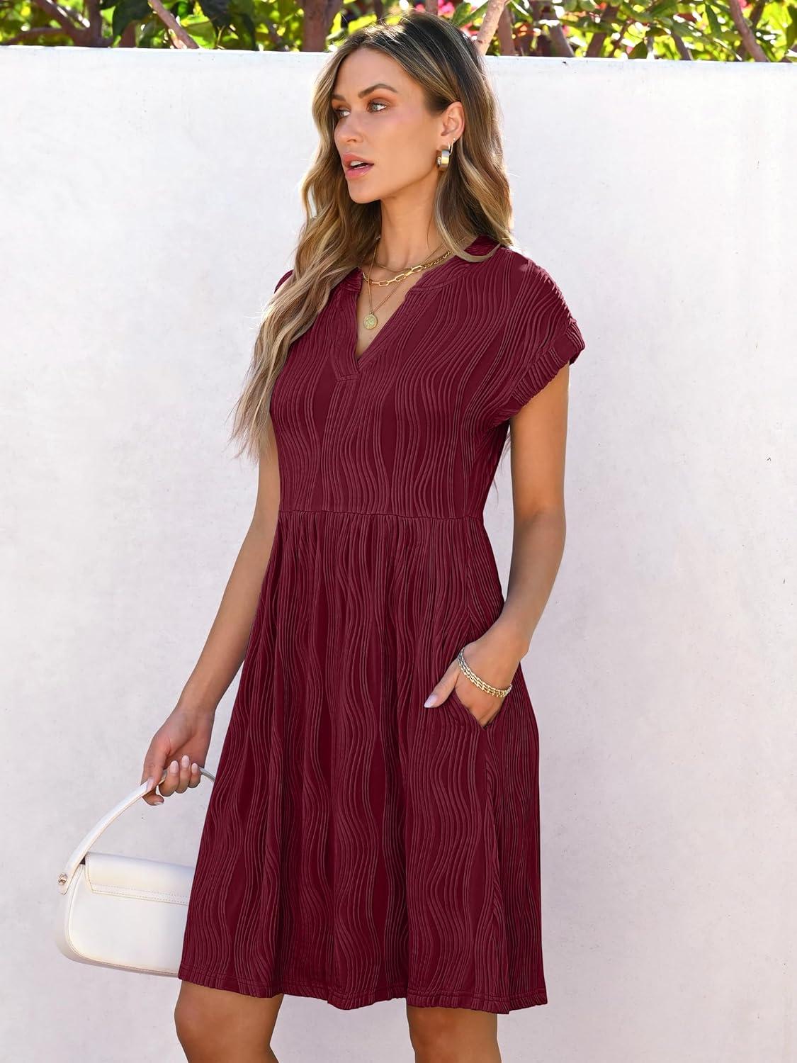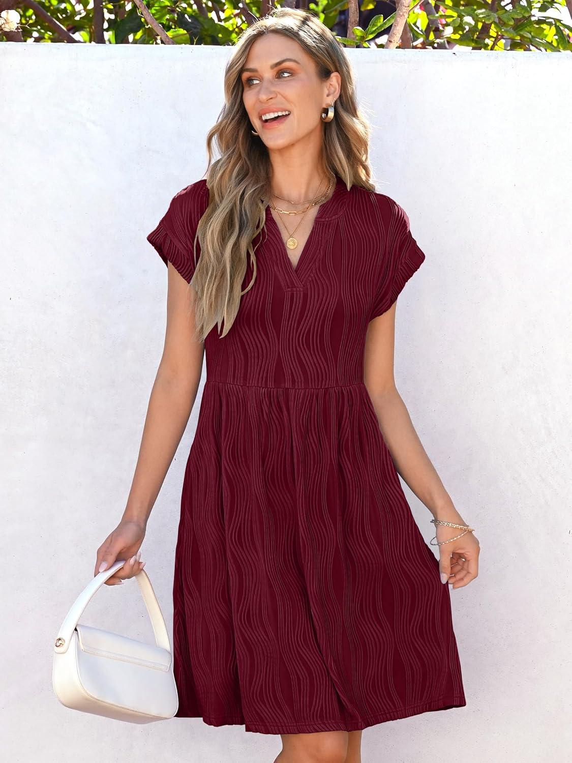 ANRABESS Womens Summer V Neck Cap Sleeve Tunic Short Dress 2025 Casual Fit Textured A-line Beach Vacation Sundress(Wine Red)