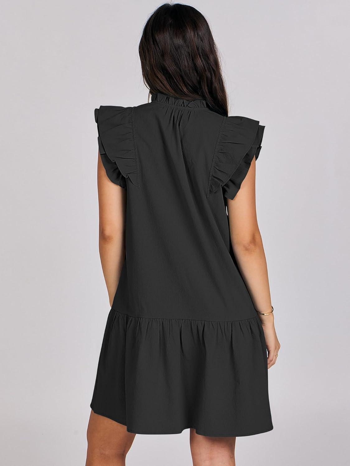 ANRABESS Womens Summer V-Neck Drawstring Ruffle Cap Short Sleeve Casual Shift Mini Dress with Pockets(Black)