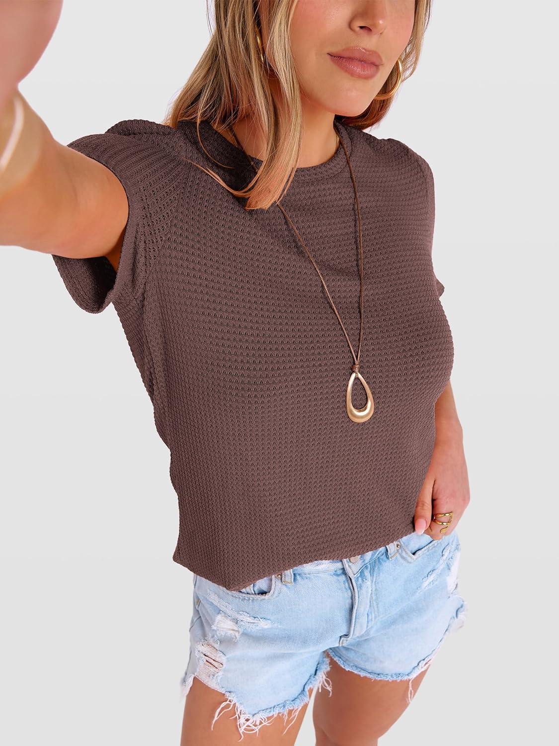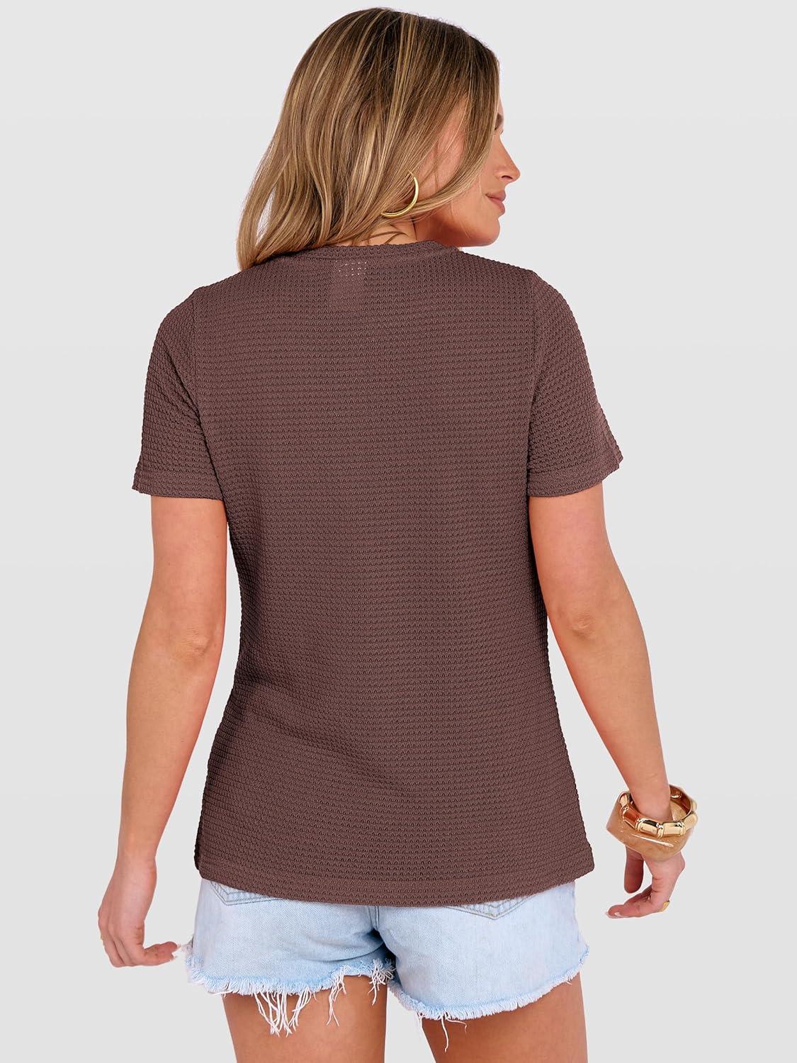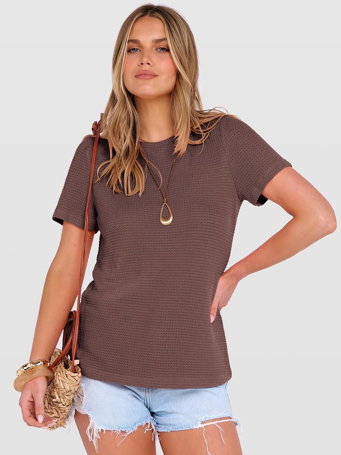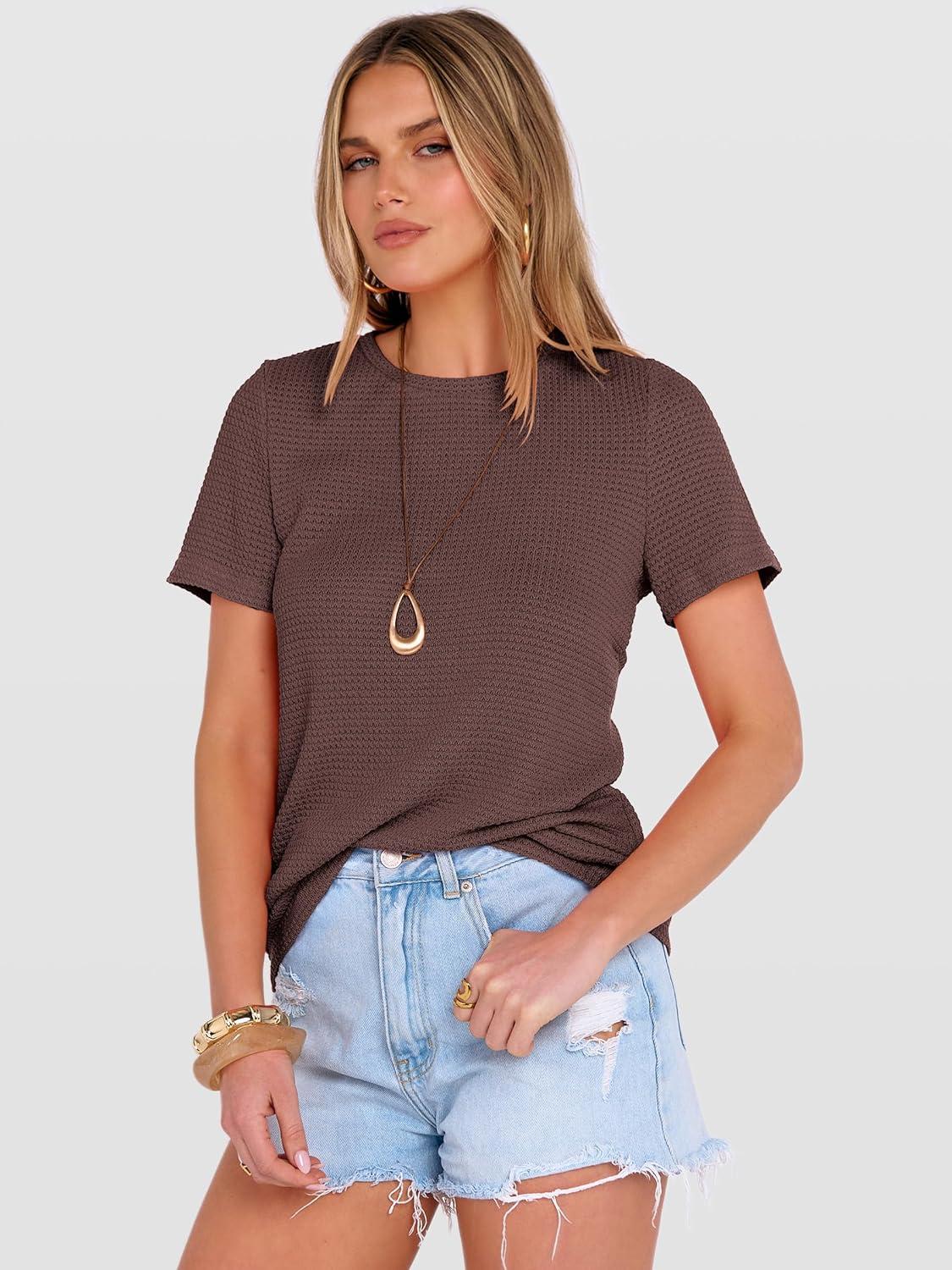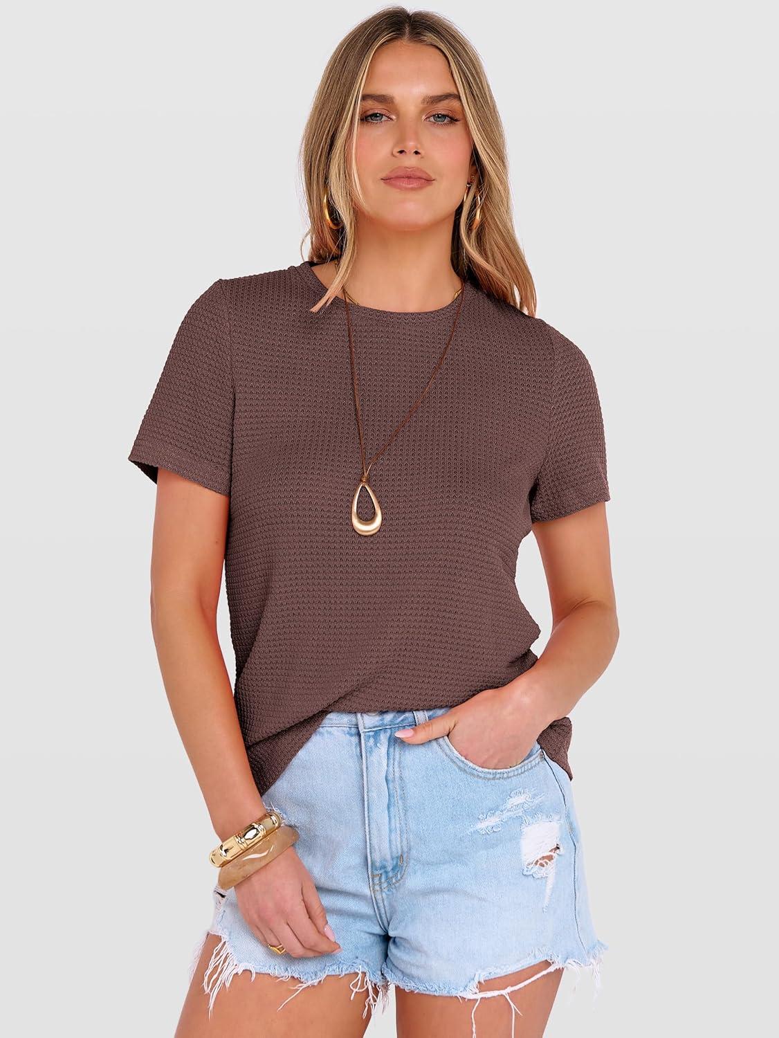 ANRABESS Women’s Summer Waffle Knit Tops Crew Neck Short Sleeve Casual Trendy Shirts Basic Tee Blouses 2026 Spring Outfits(Brown)