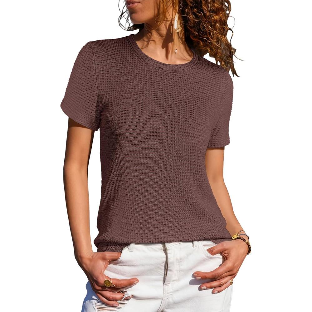ANRABESS Women's Summer Waffle Knit Tops Crew Neck Short Sleeve Casual Trendy Shirts Basic Tee Blouses 2026 Spring Outfits(Brown)