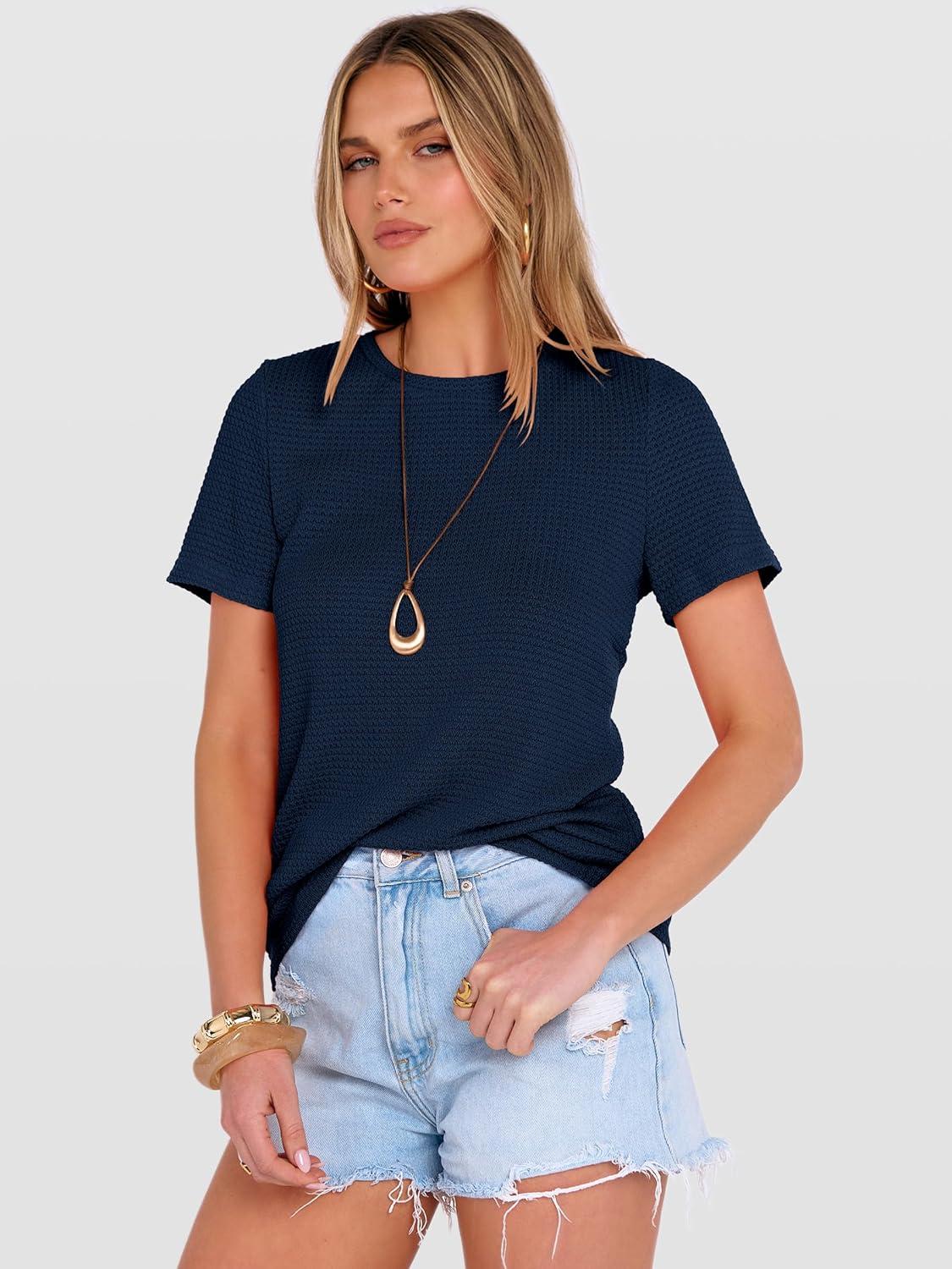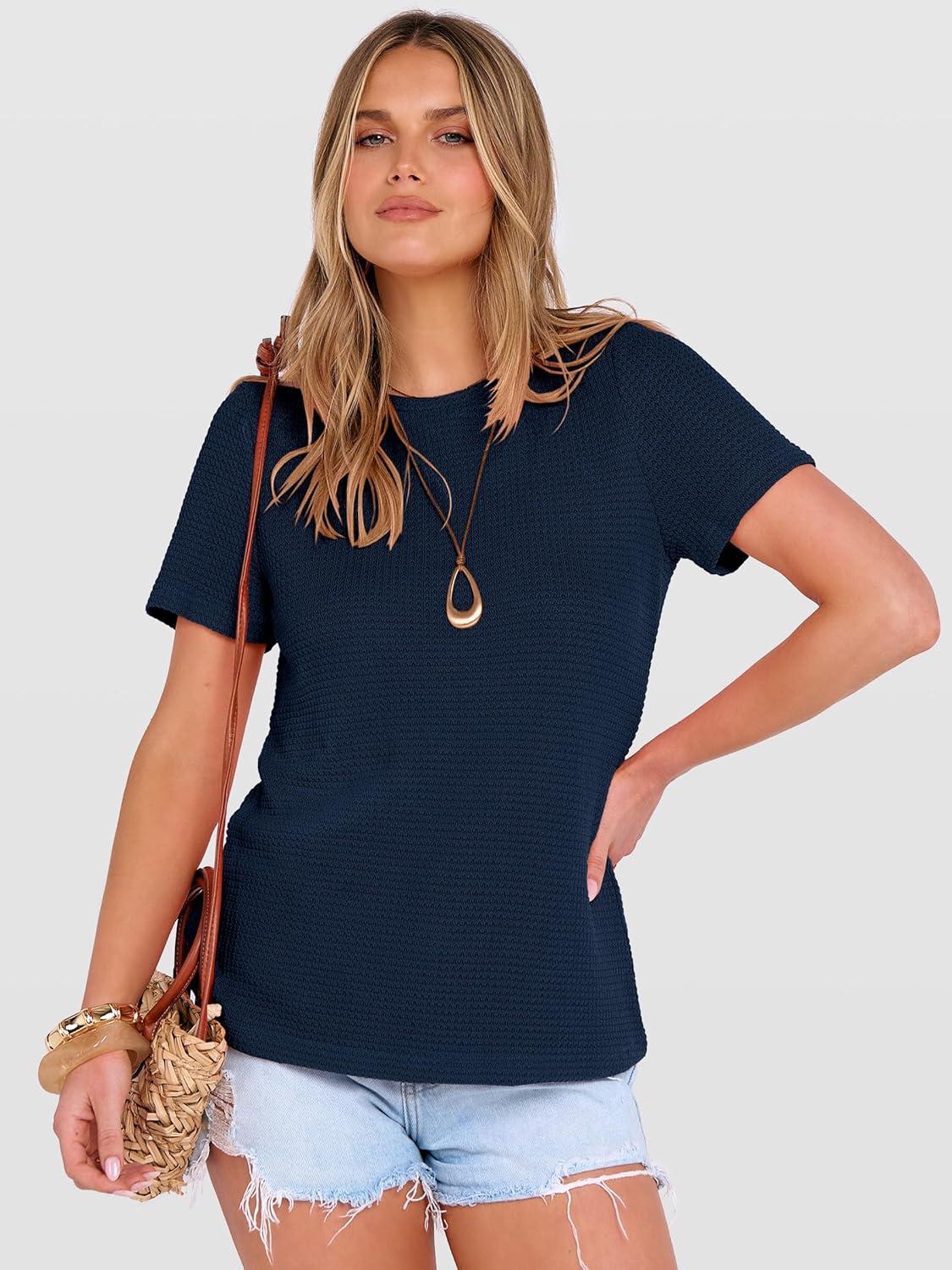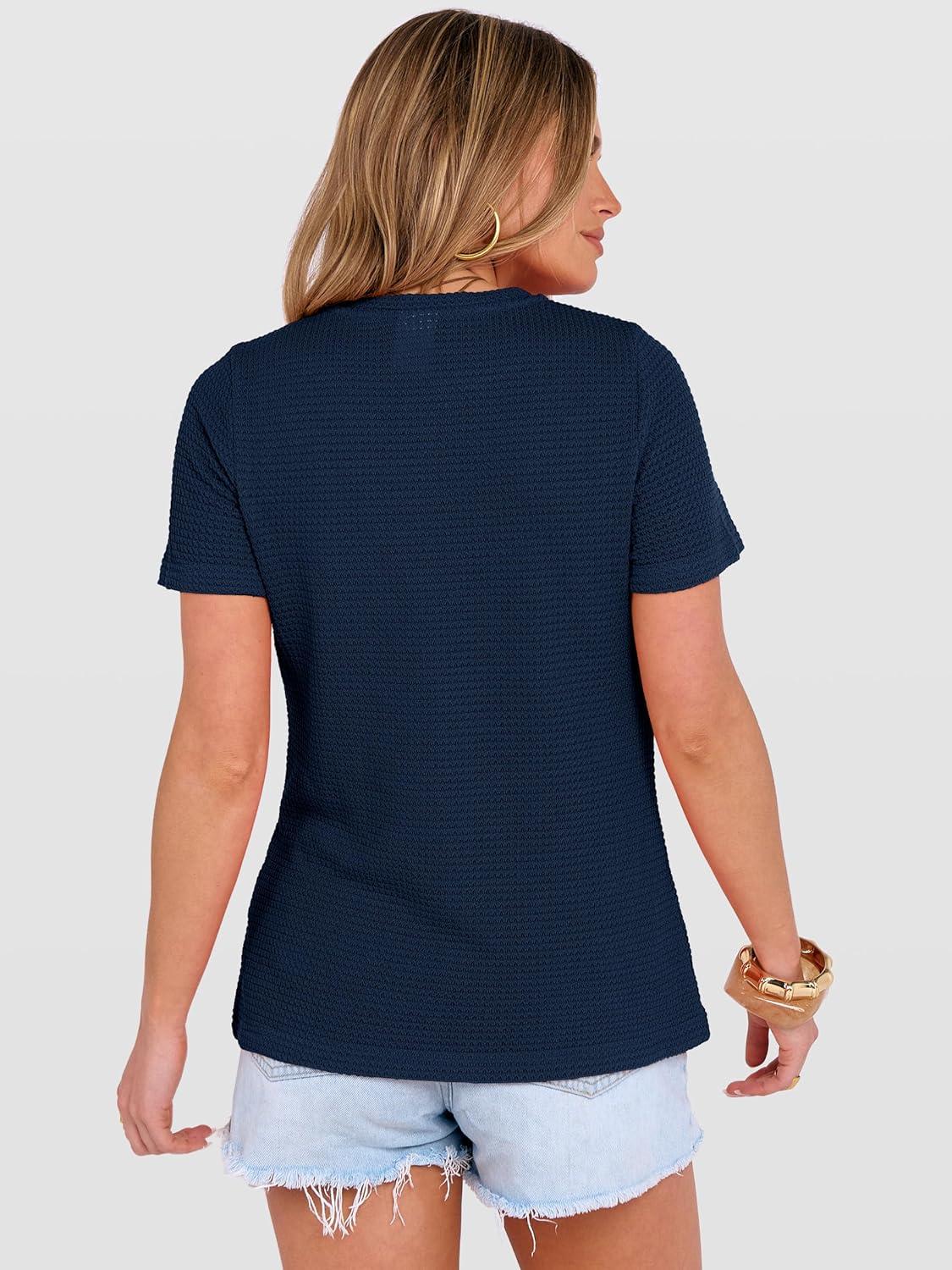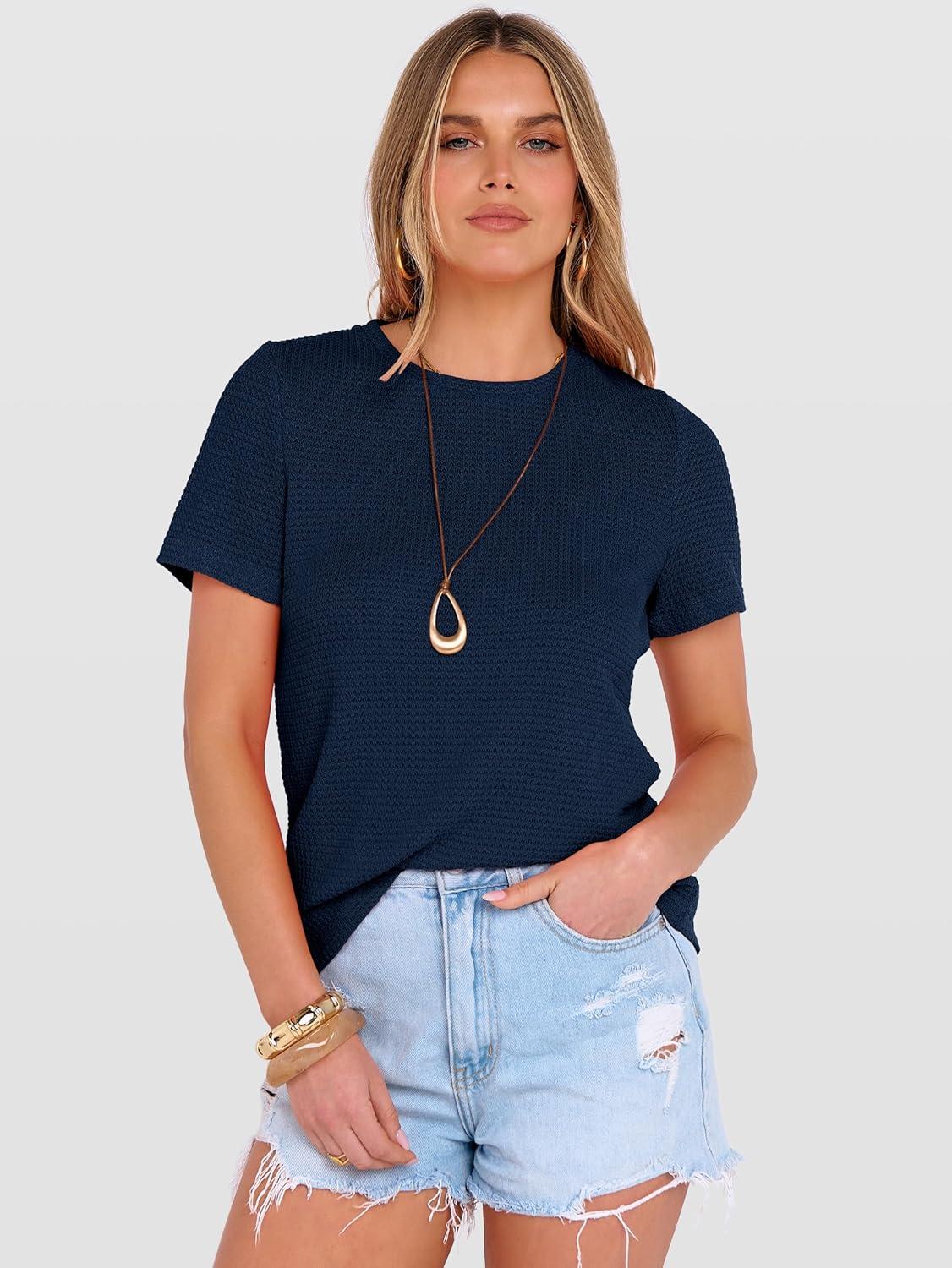 ANRABESS Women’s Summer Waffle Knit Tops Crew Neck Short Sleeve Casual Trendy Shirts Basic Tee Blouses 2026 Spring Outfits(Navy Blue)