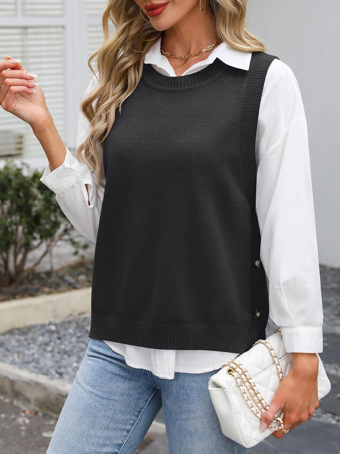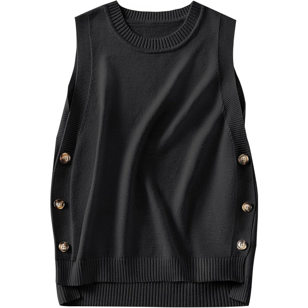 ANRABESS Womens Sweater Vest Summer Sleeveless Crewneck Ribbed Knit Side Button Loose Pullover Tank Tops 2025 Fall Outfits(Black)