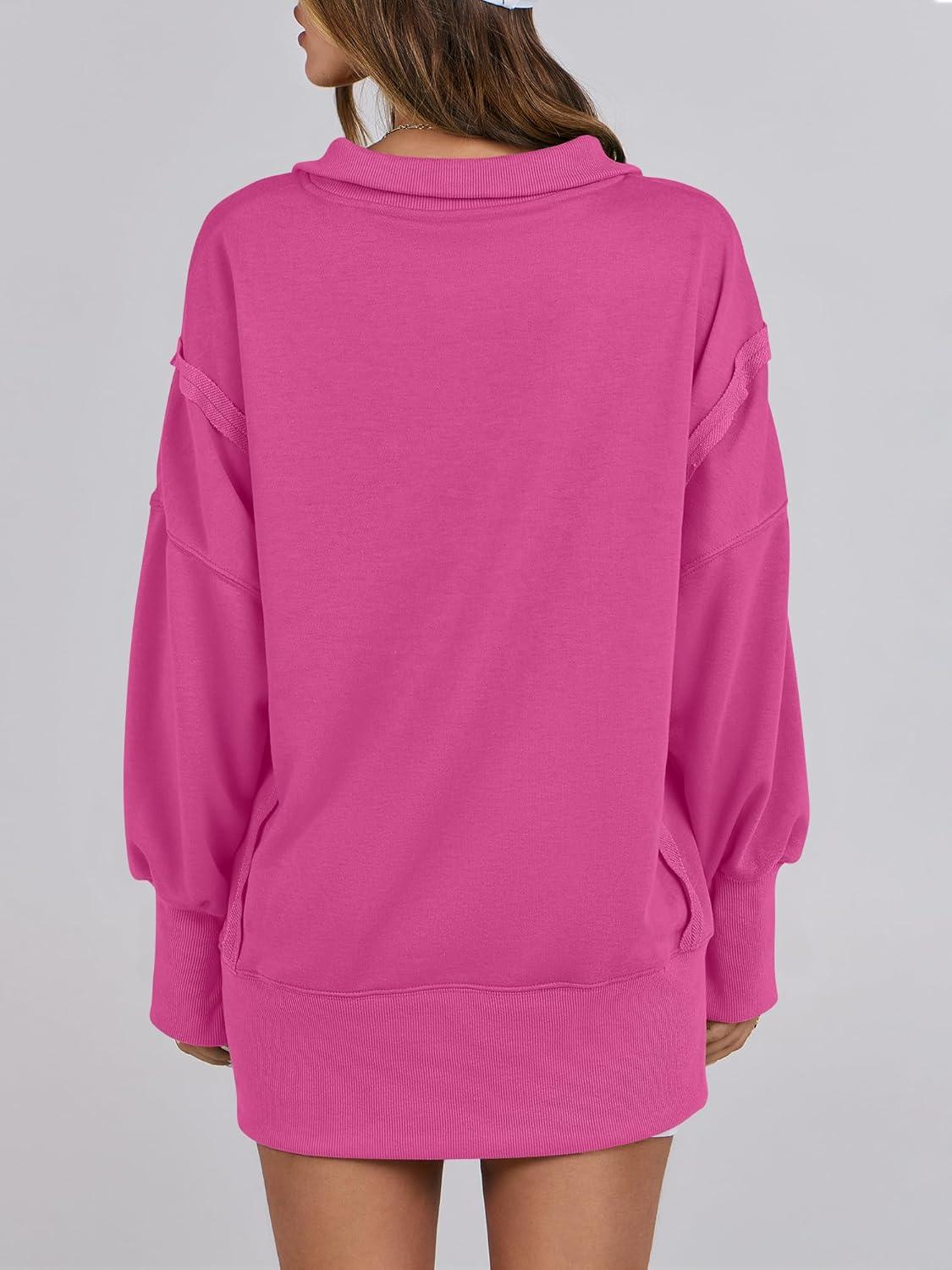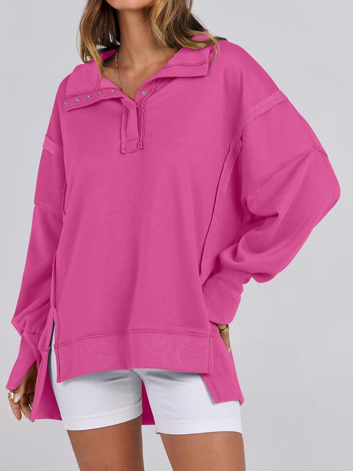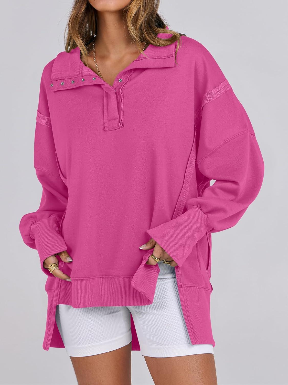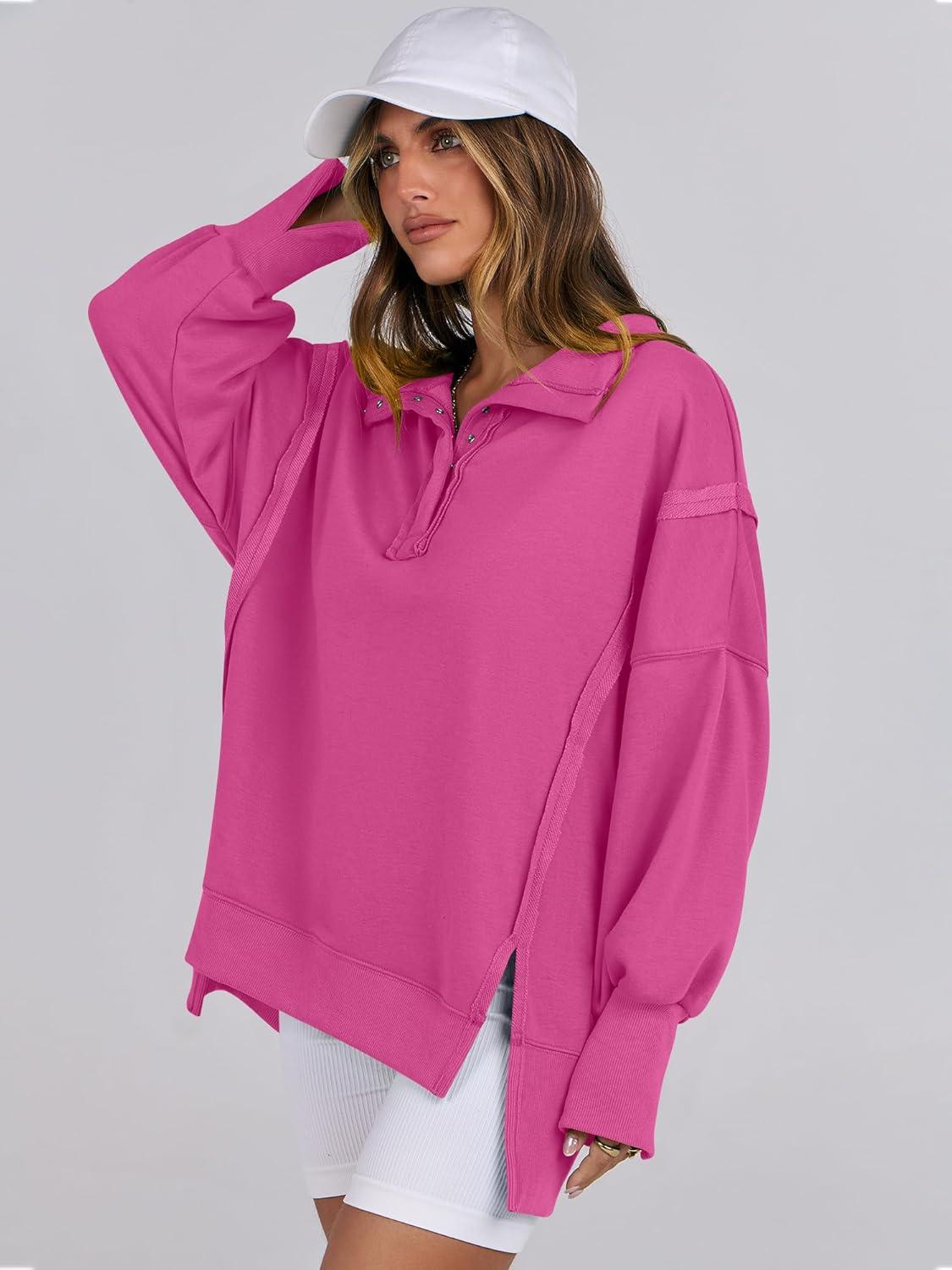 ANRABESS Women’s Sweatshirts Oversized Casual Loose Button Up Henley Pullover Top High Low Split 2025 Fall Fashion Outfits(Hot Pink)