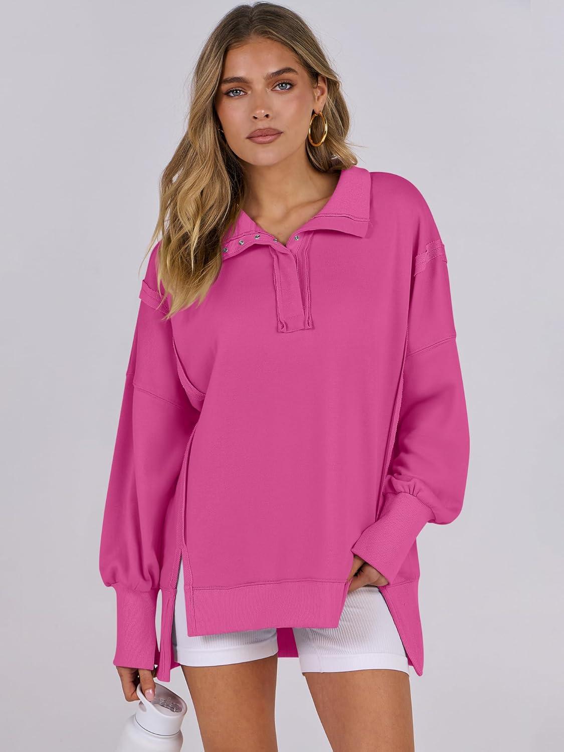 imageANRABESS Womens Sweatshirts Oversized Casual Loose Button Up Henley Pullover Top High Low Split 2025 Fall Fashion OutfitsHot Pink