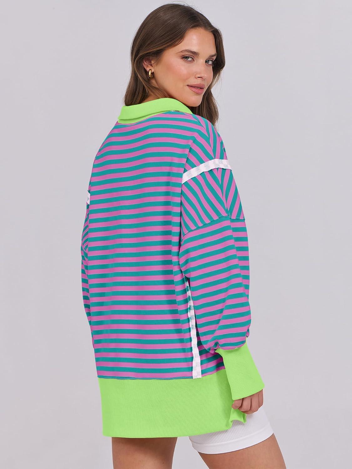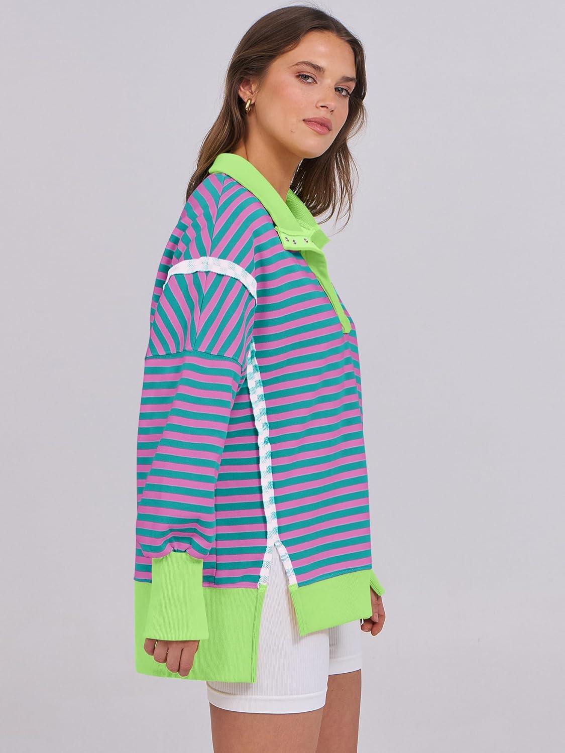 ANRABESS Women's Sweatshirts Oversized Casual Loose Button Up Henley Pullover Top High Low Split 2025 Fall Fashion Outfits(Pink Green)