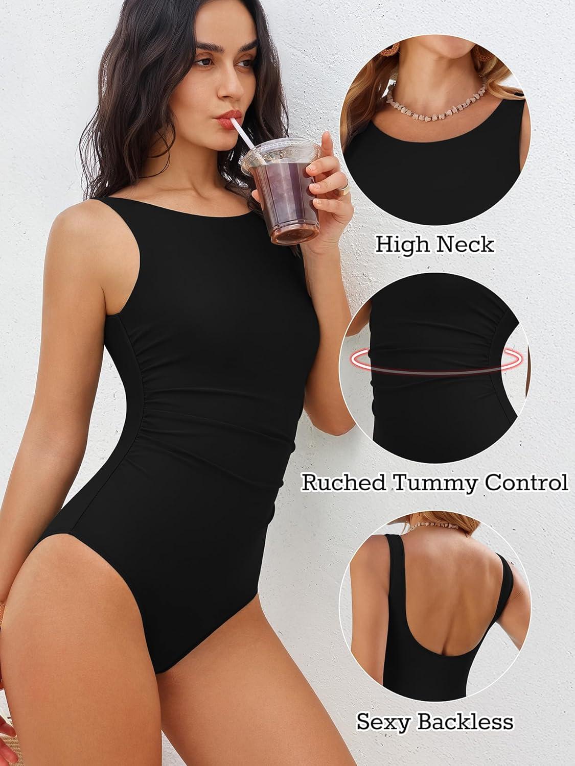 ANRABESS One Piece Swimsuit: skinny-fit, S=US(4-6)-XL=US(16-18) (details in full description), Material: 82% nylon 18% elastane/80% polyester 20% elastane; Lining: 90% polyester 10% elastane, medium stretch, softness & thickness, ruched high waist tummy control, cute high neckline, low back, full coverage, spring/summer essential for tropical vacations, beaches, pools & water activities, cold machine wash in laundry bag (like colors); no bleach, dry flat; color varies in natural light (D65); max steam 110℃.