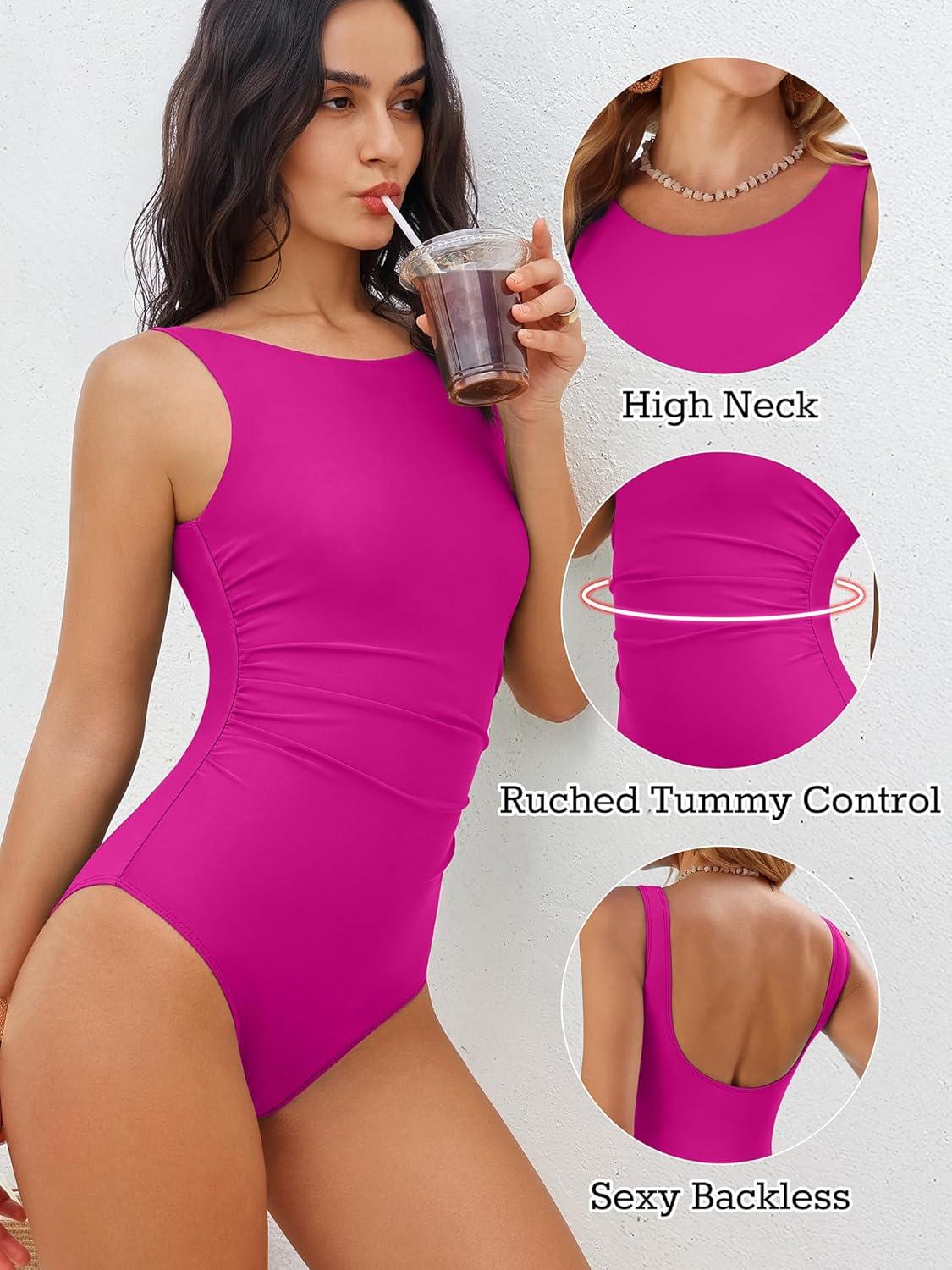 ANRABESS Womens Swimsuits One Piece Tummy Control Full Coverage Bathing Suit Ruched Modest Swim Suit Beach Vacation Swimwear(Hot Pink)