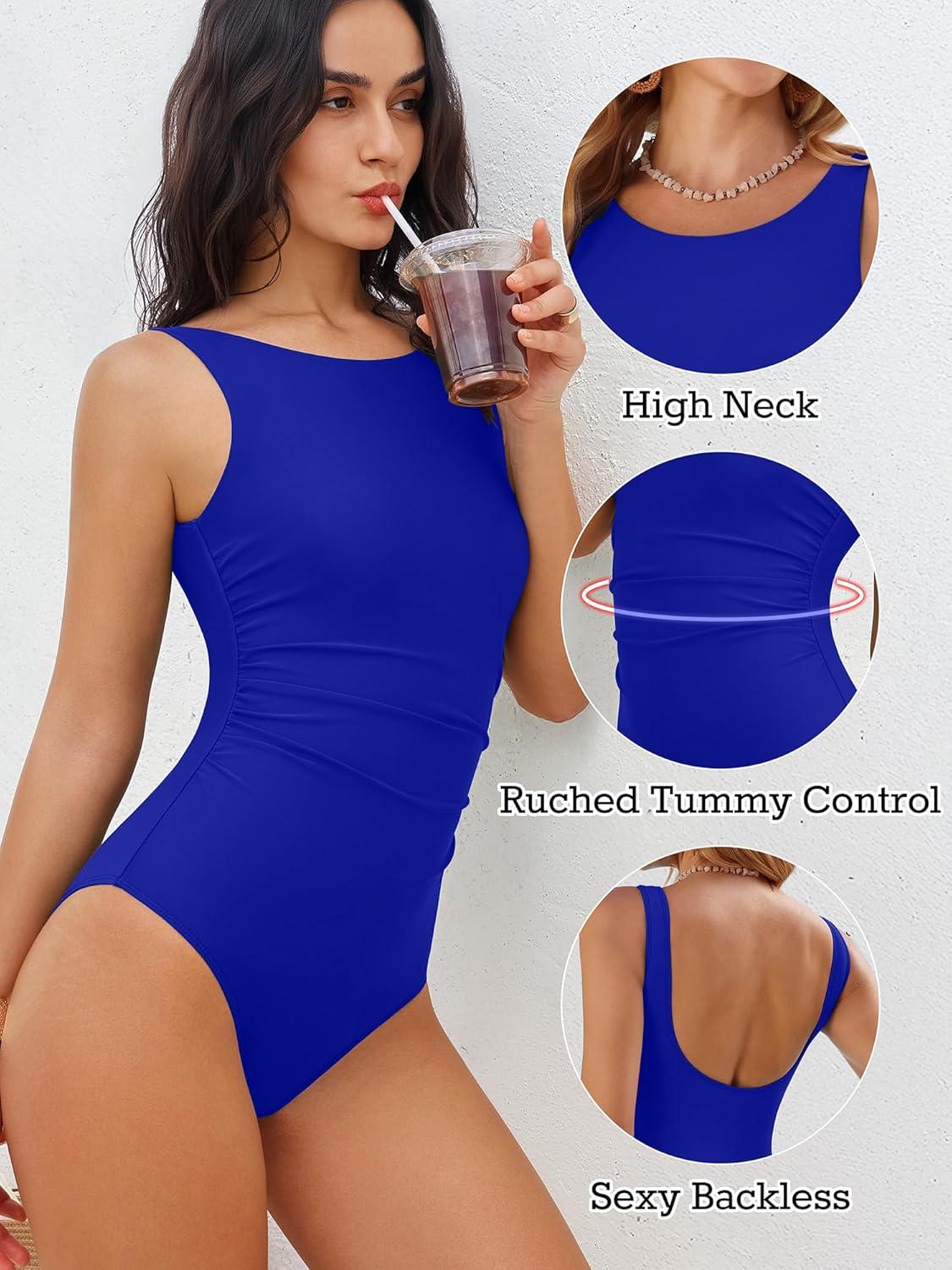 ANRABESS Womens Swimsuits One Piece Tummy Control Full Coverage Bathing Suit Ruched Modest Swim Suit Beach Vacation Swimwear(Royal Blue)