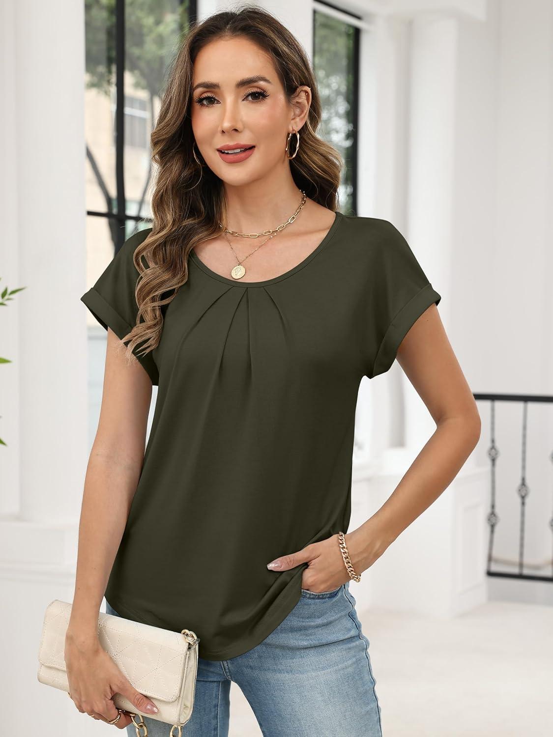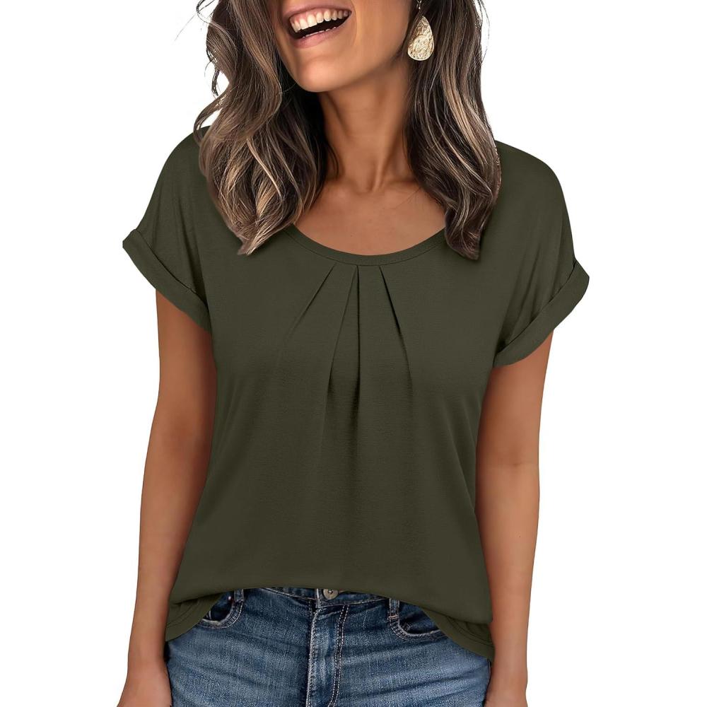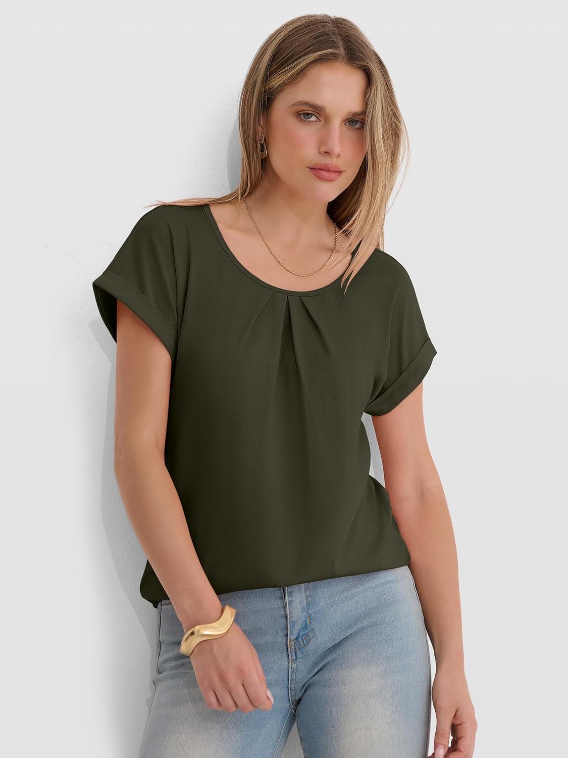 ANRABESS Womens T Shirts Pleated Short Sleeve Tops Summer Business Casual Dressy Blouses 2026 Cute Fashion Clothes(Army Green)
