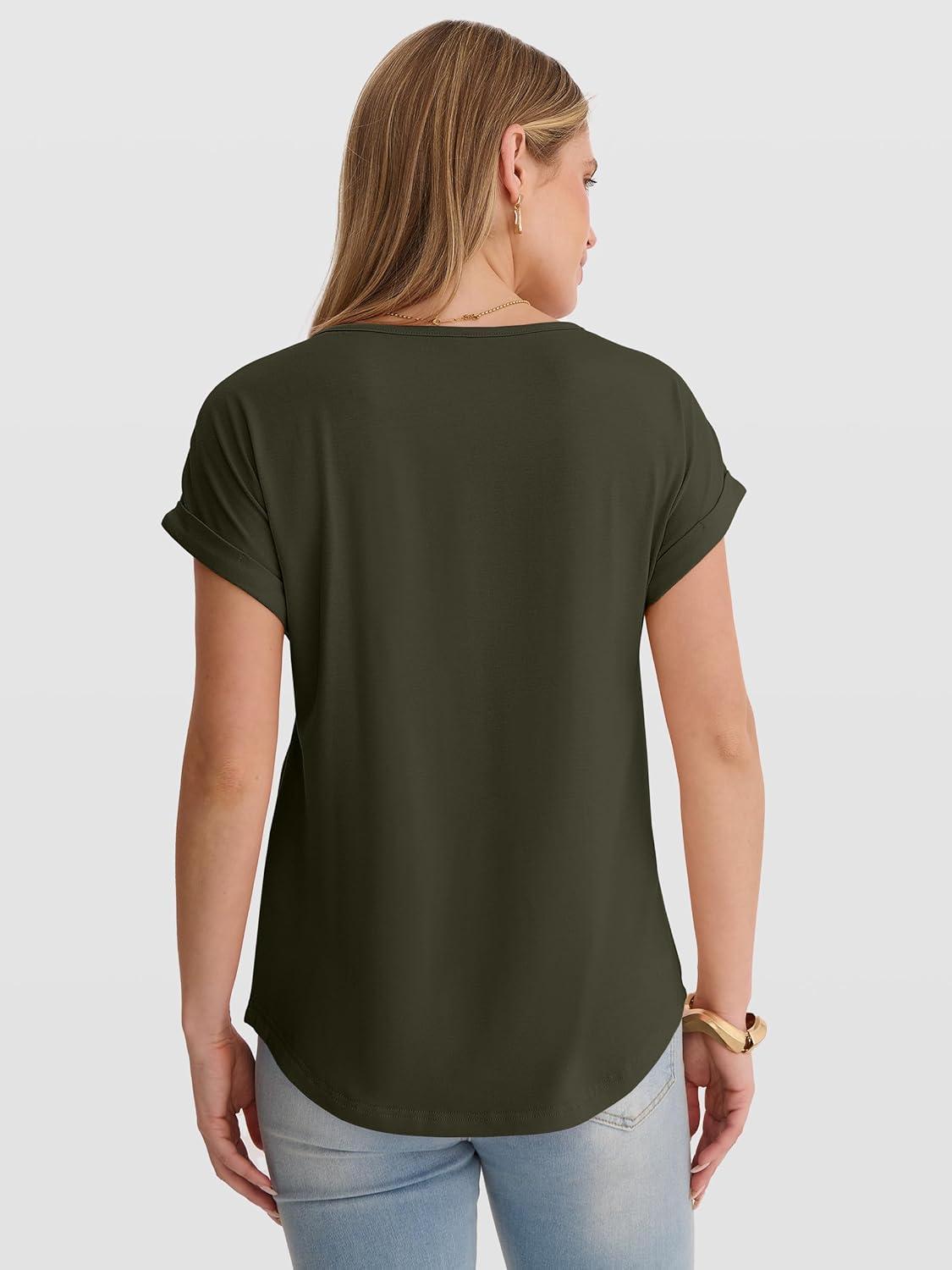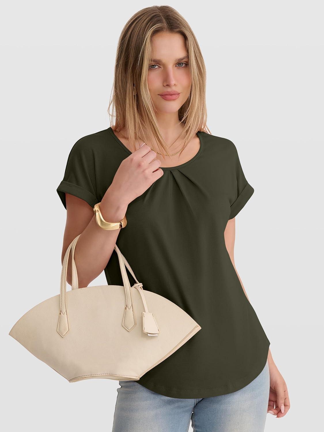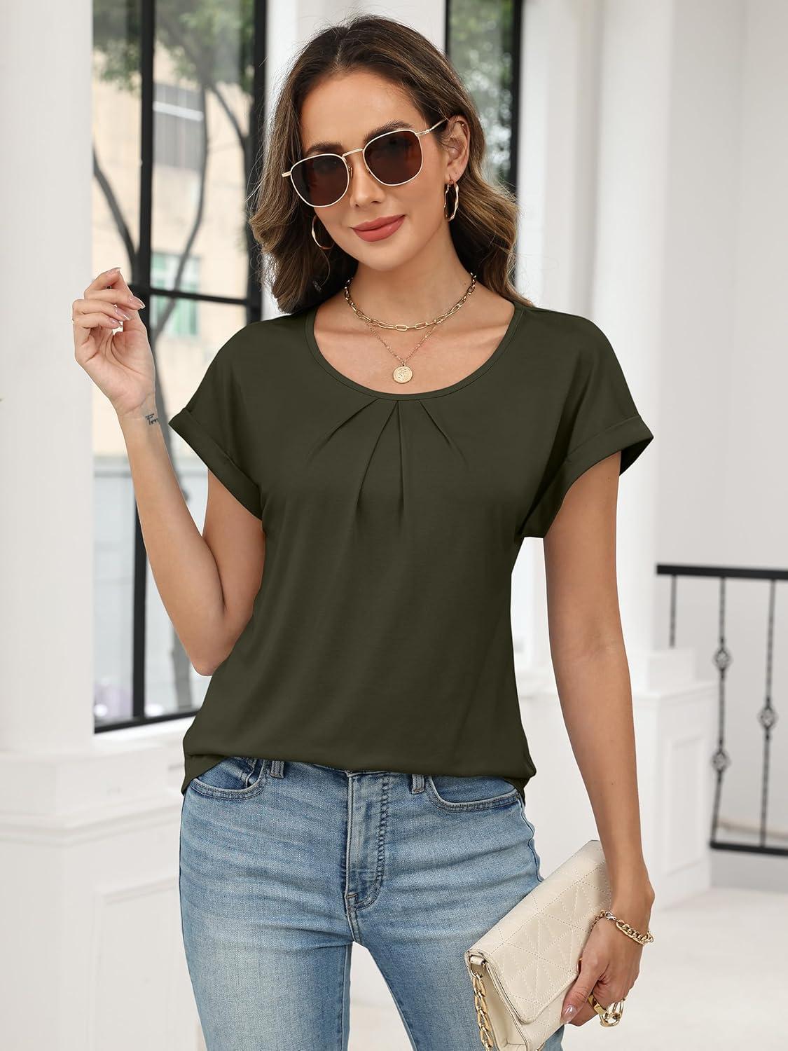ANRABESS Womens T Shirts Pleated Short Sleeve Tops Summer Business Casual Dressy Blouses 2026 Cute Fashion Clothes(Army Green)