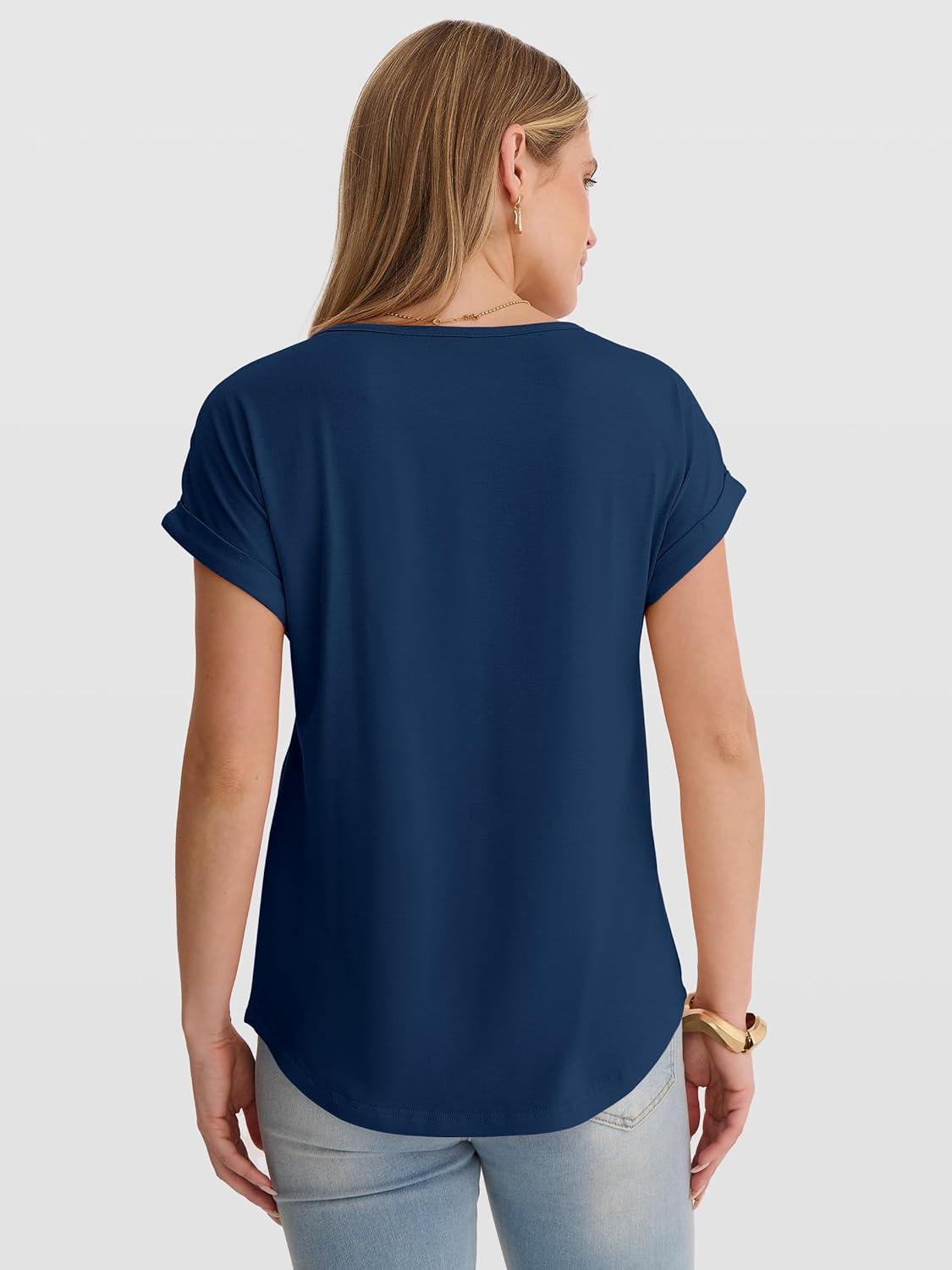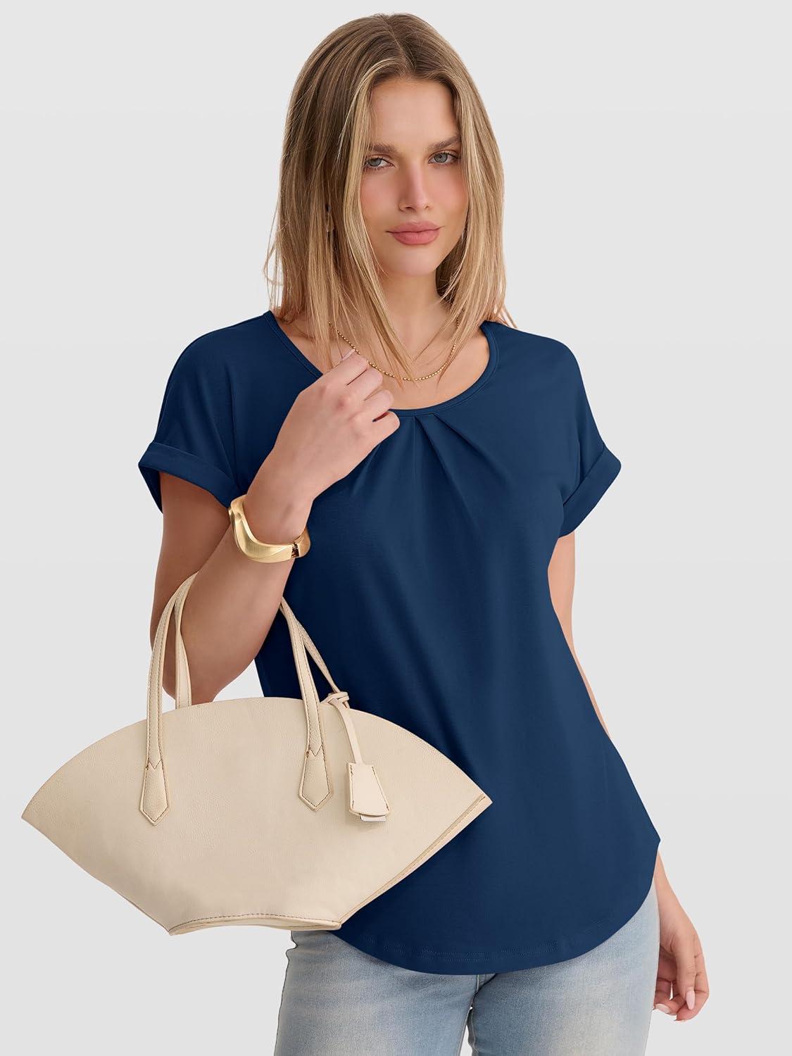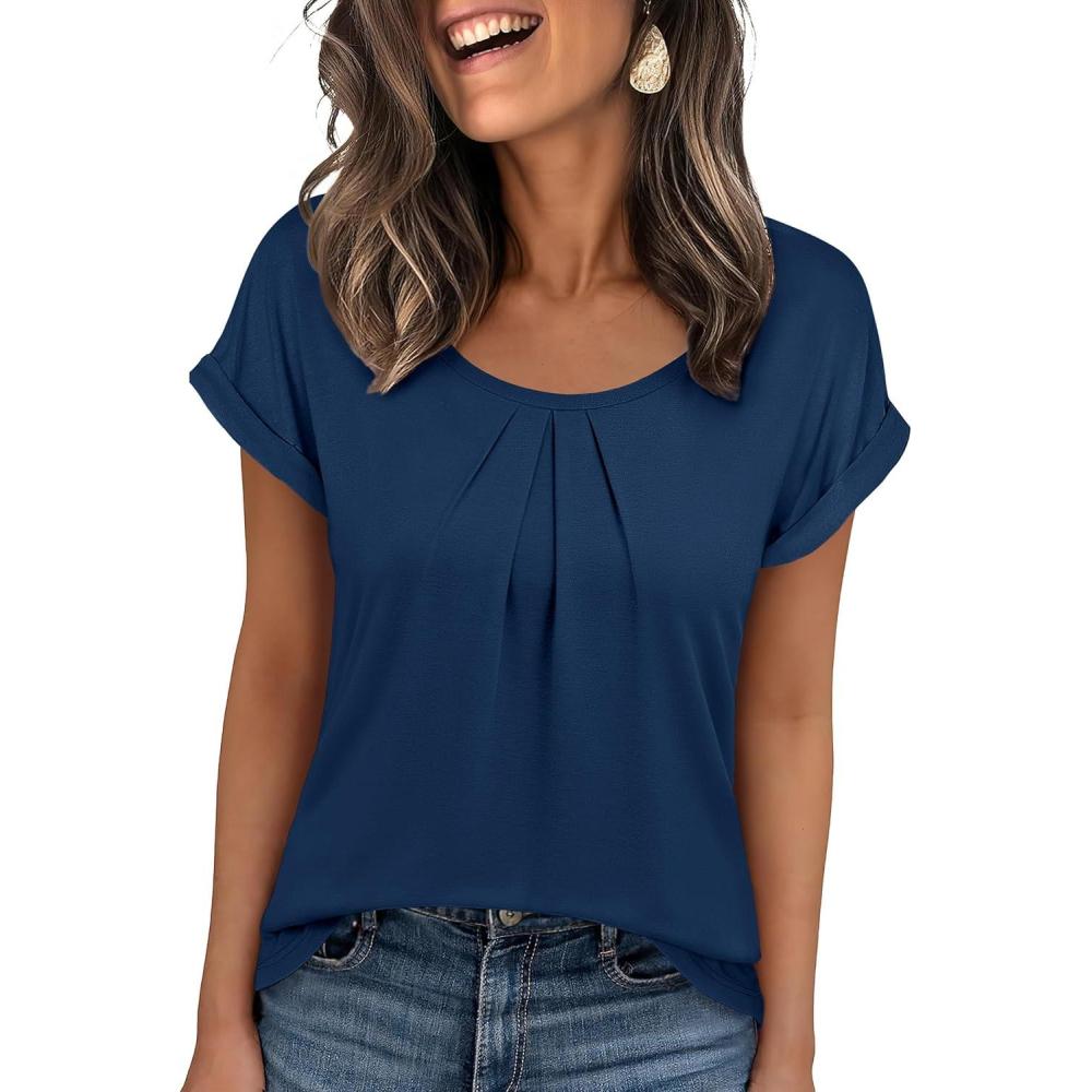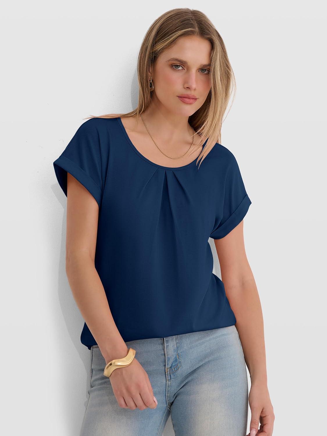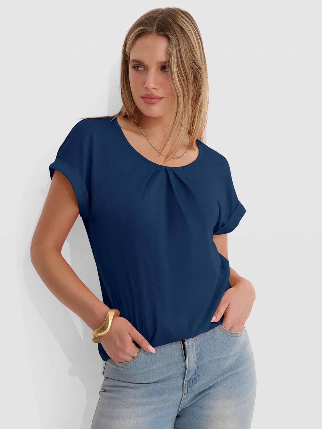 ANRABESS Womens T Shirts Pleated Short Sleeve Tops Summer Business Casual Dressy Blouses 2026 Cute Fashion Clothes(Blue)