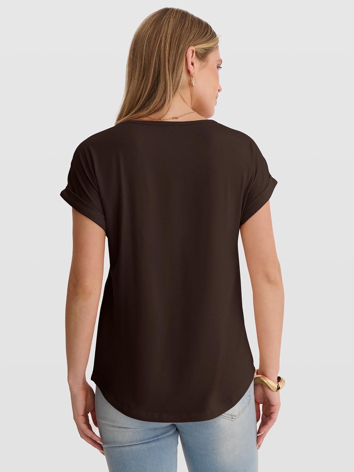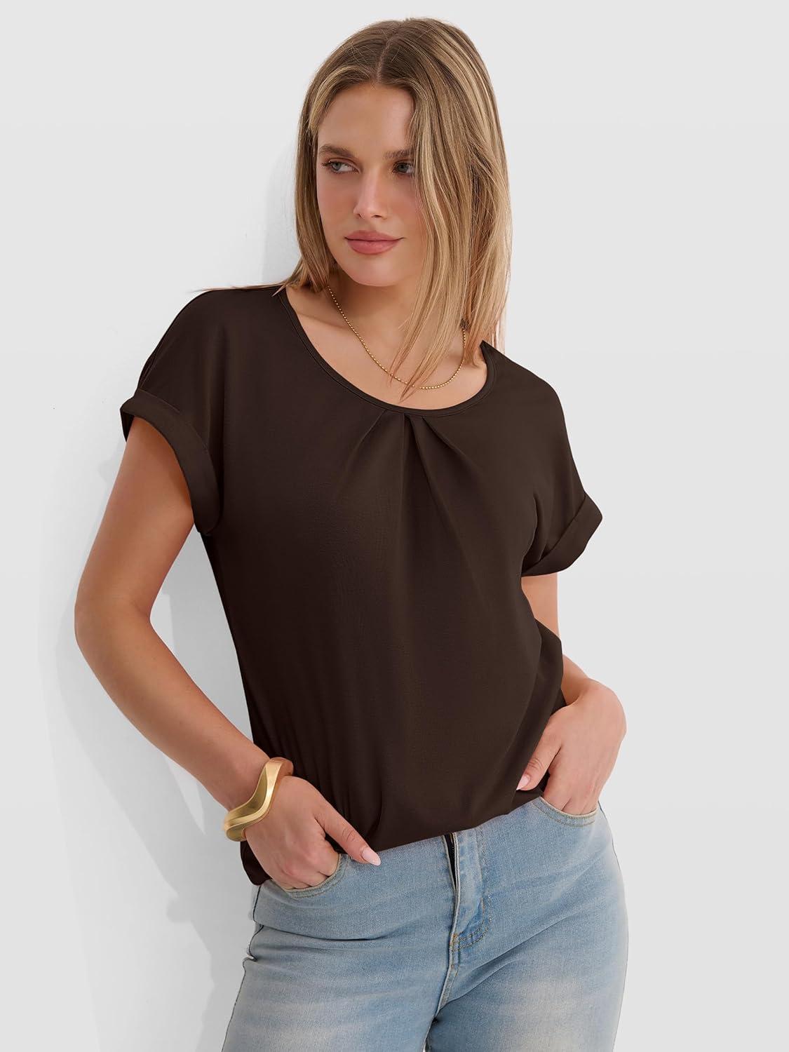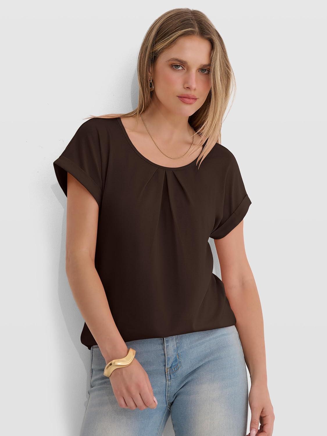 ANRABESS Womens T Shirts Pleated Short Sleeve Tops Summer Business Casual Dressy Blouses 2026 Cute Fashion Clothes(Brown)
