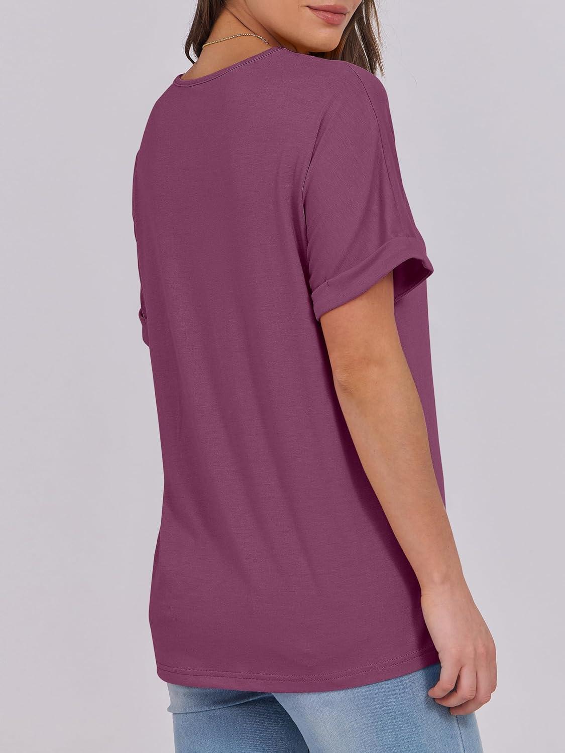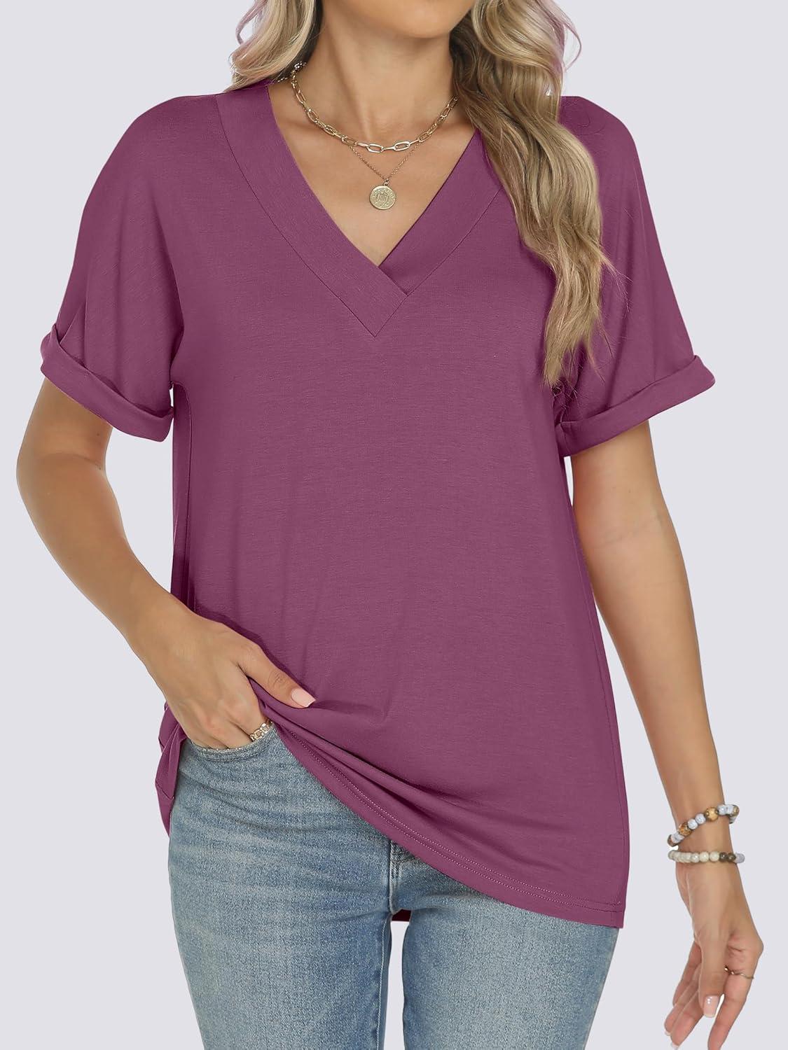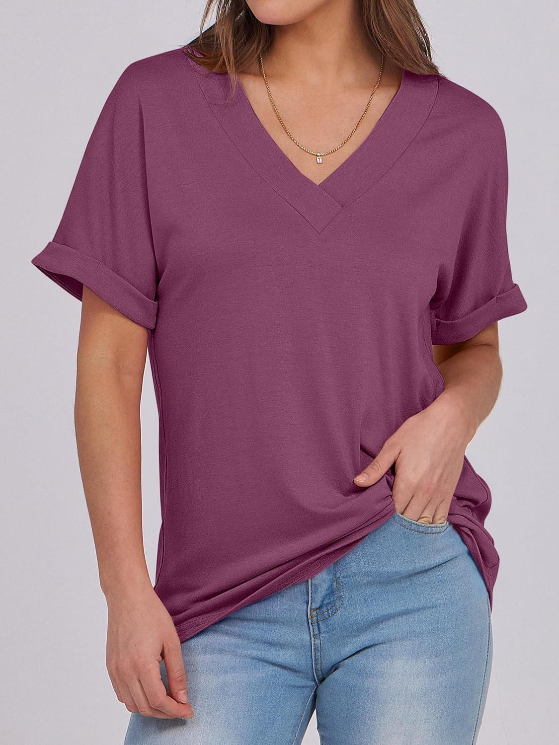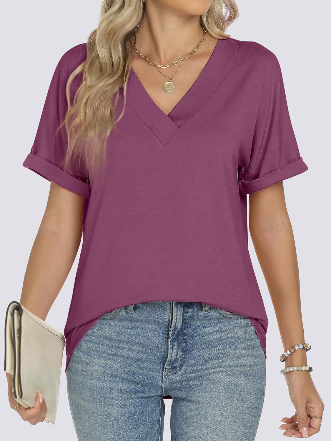 ANRABESS Womens T Shirts Short Sleeve V Neck Shirts Summer Loose Fit Dressy Tops Business Casual Blouses 2025 Basic Tees(Wine Red)