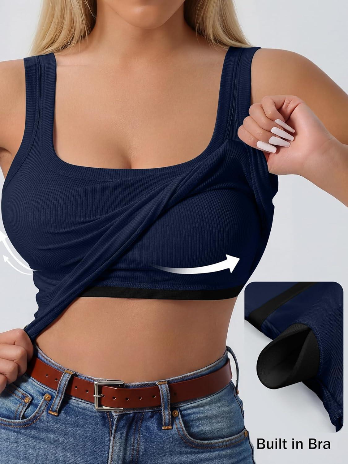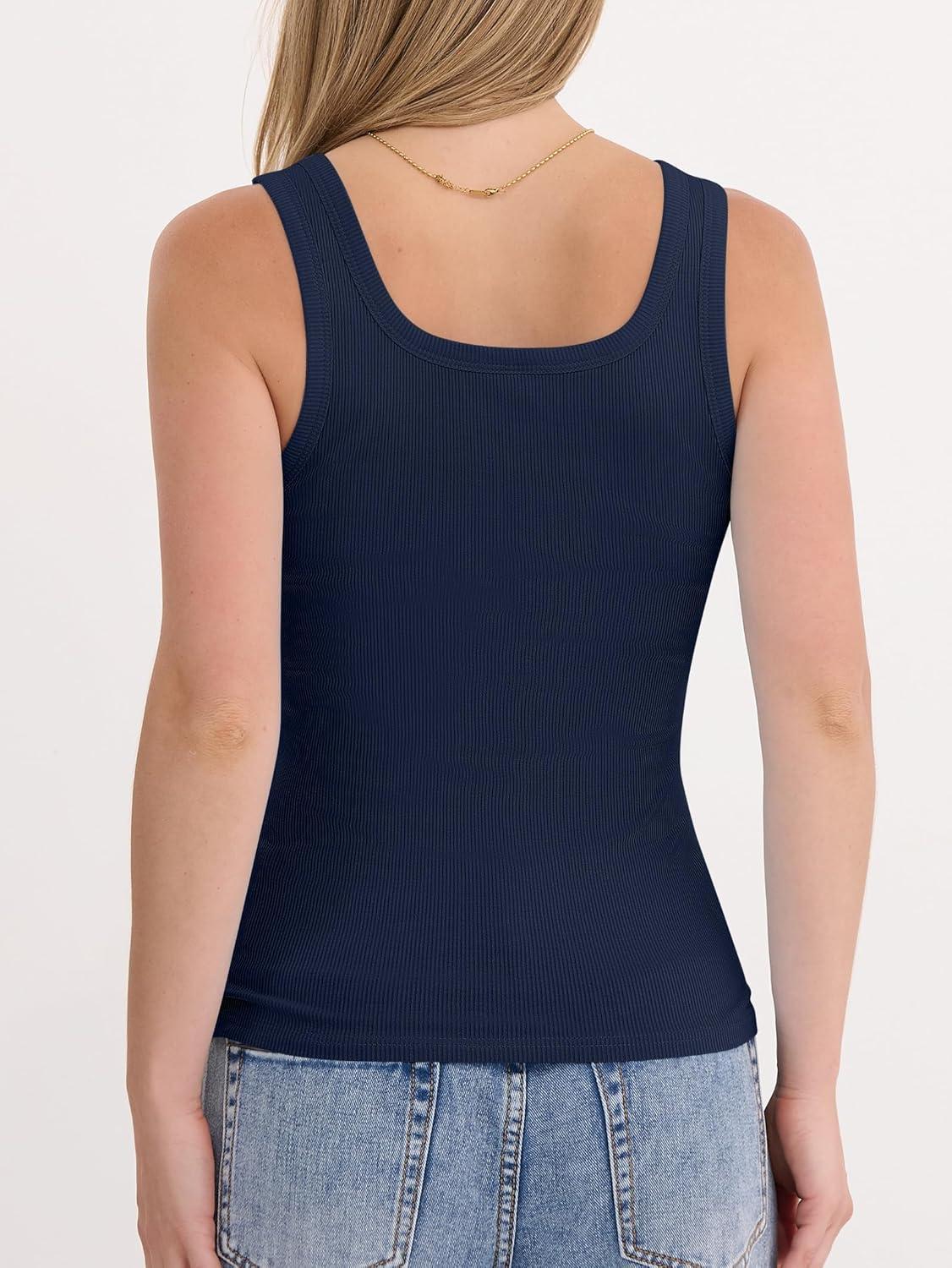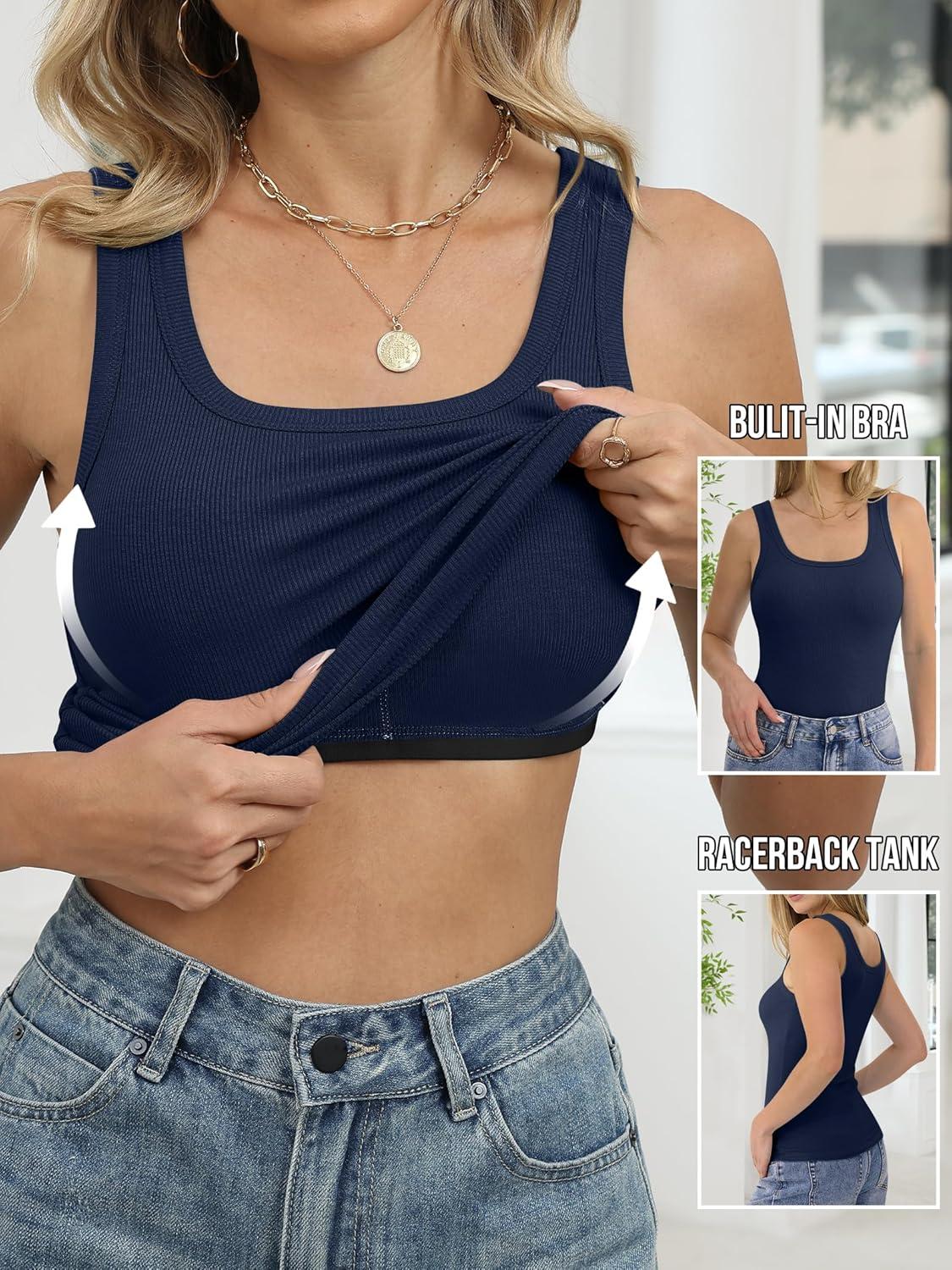 ANRABESS Womens Tank Tops Built in Bra Summer Scoop Neck Sleeveless Basic Tee Ribbed Fitted Casual Shirts 2026 Trendy Clothes(Navy Blue)