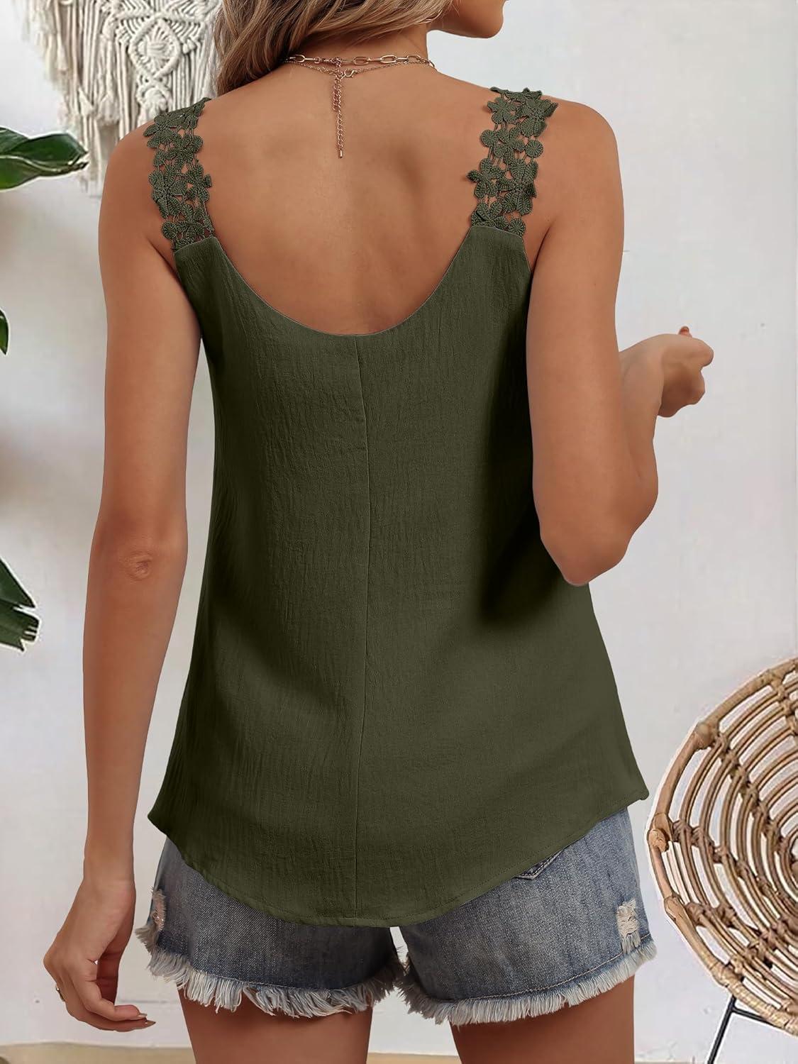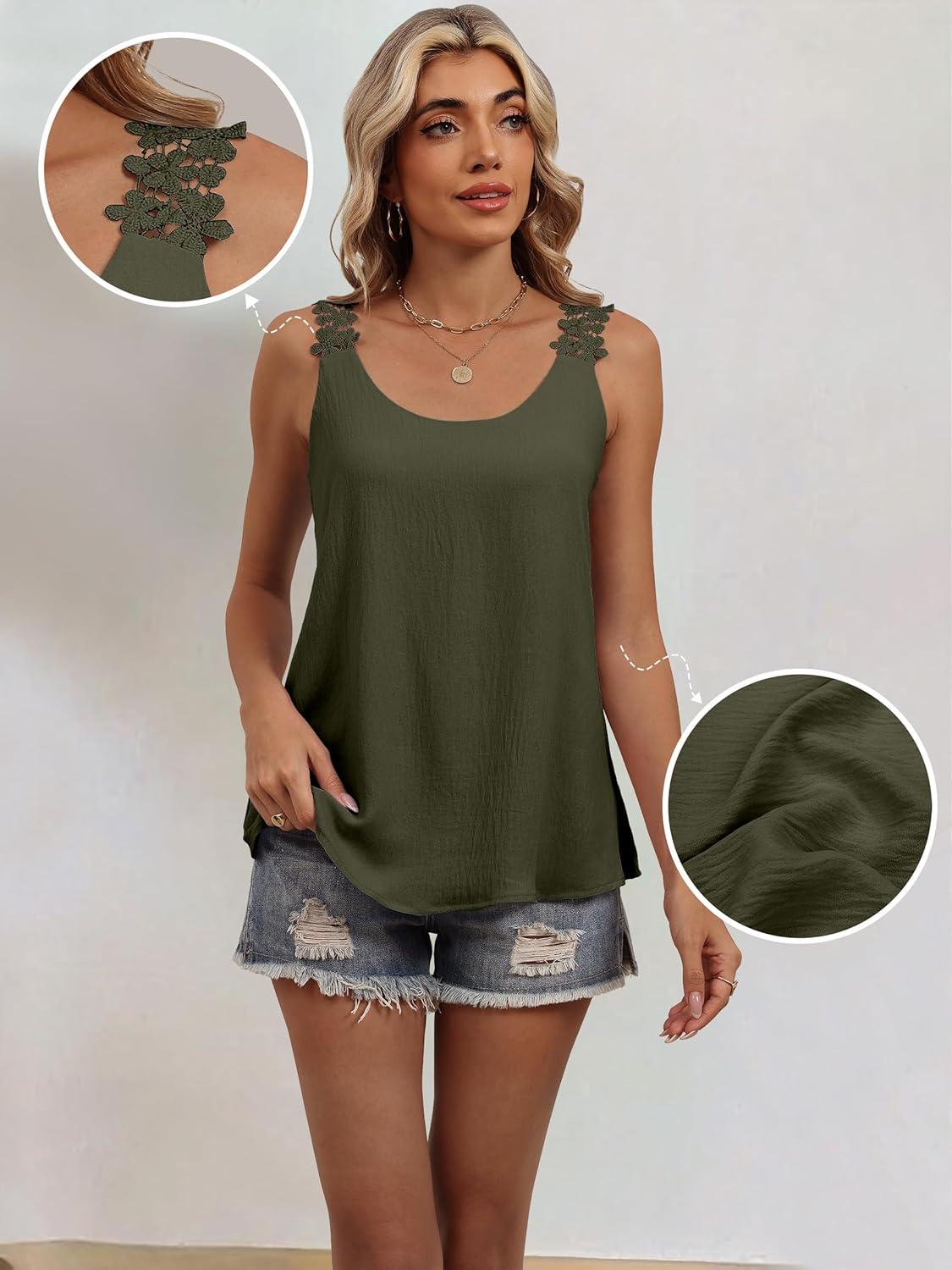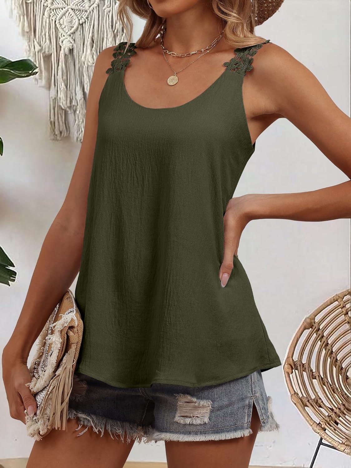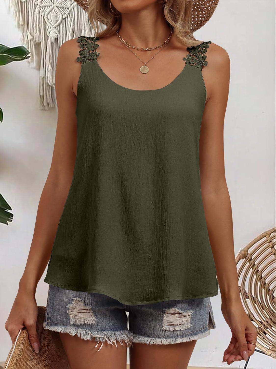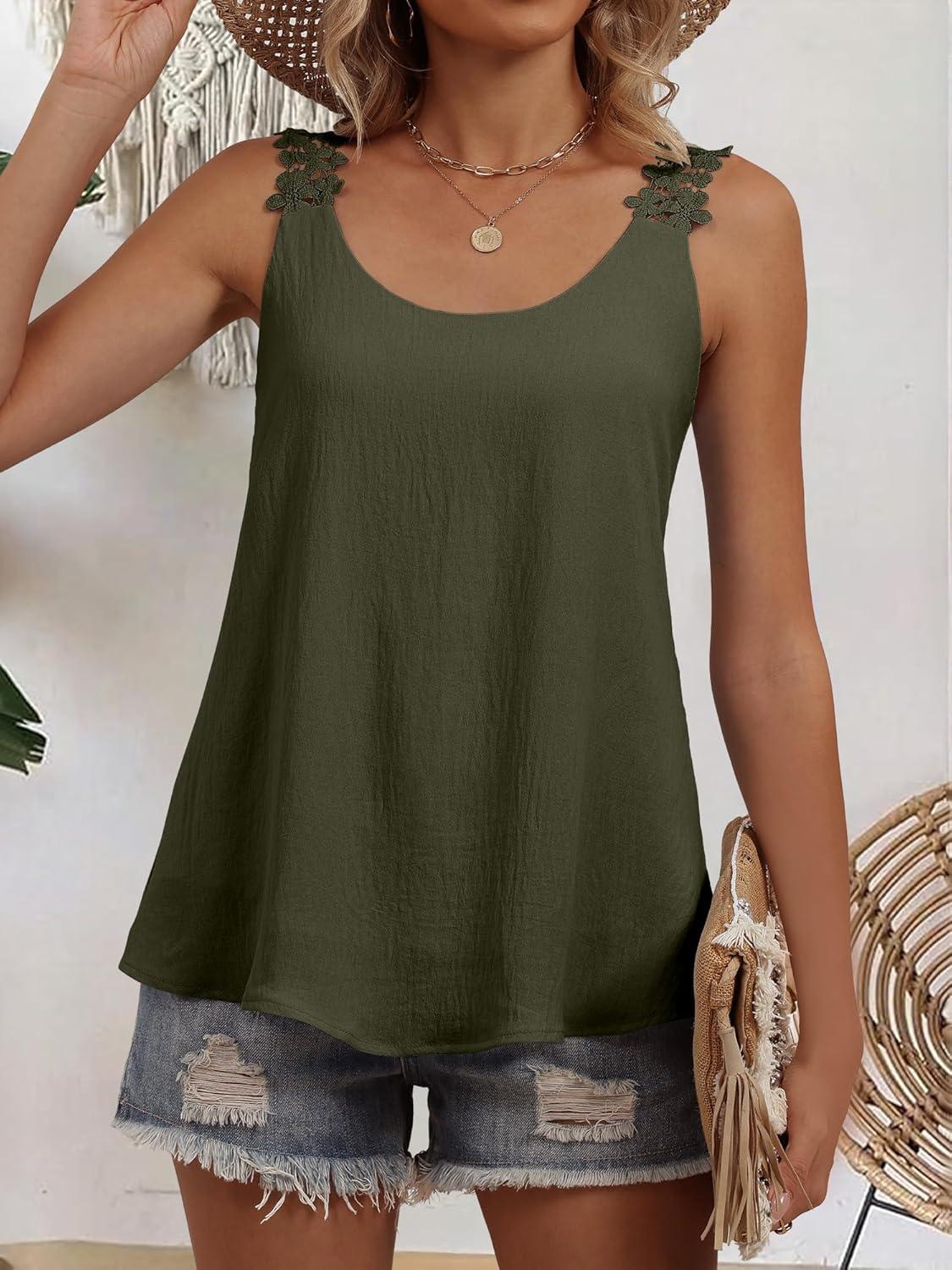 ANRABESS Womens Tank Tops Lace Shoulder Scoop Neck Flowy Sleeveless Tops Casual Cute Tanks Summer Outfits Beach Vacation 2026(Army Green)
