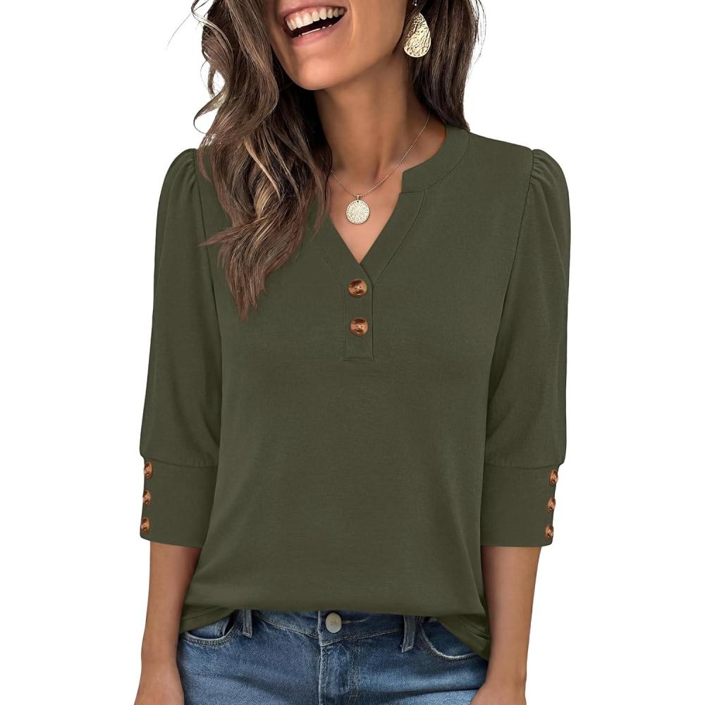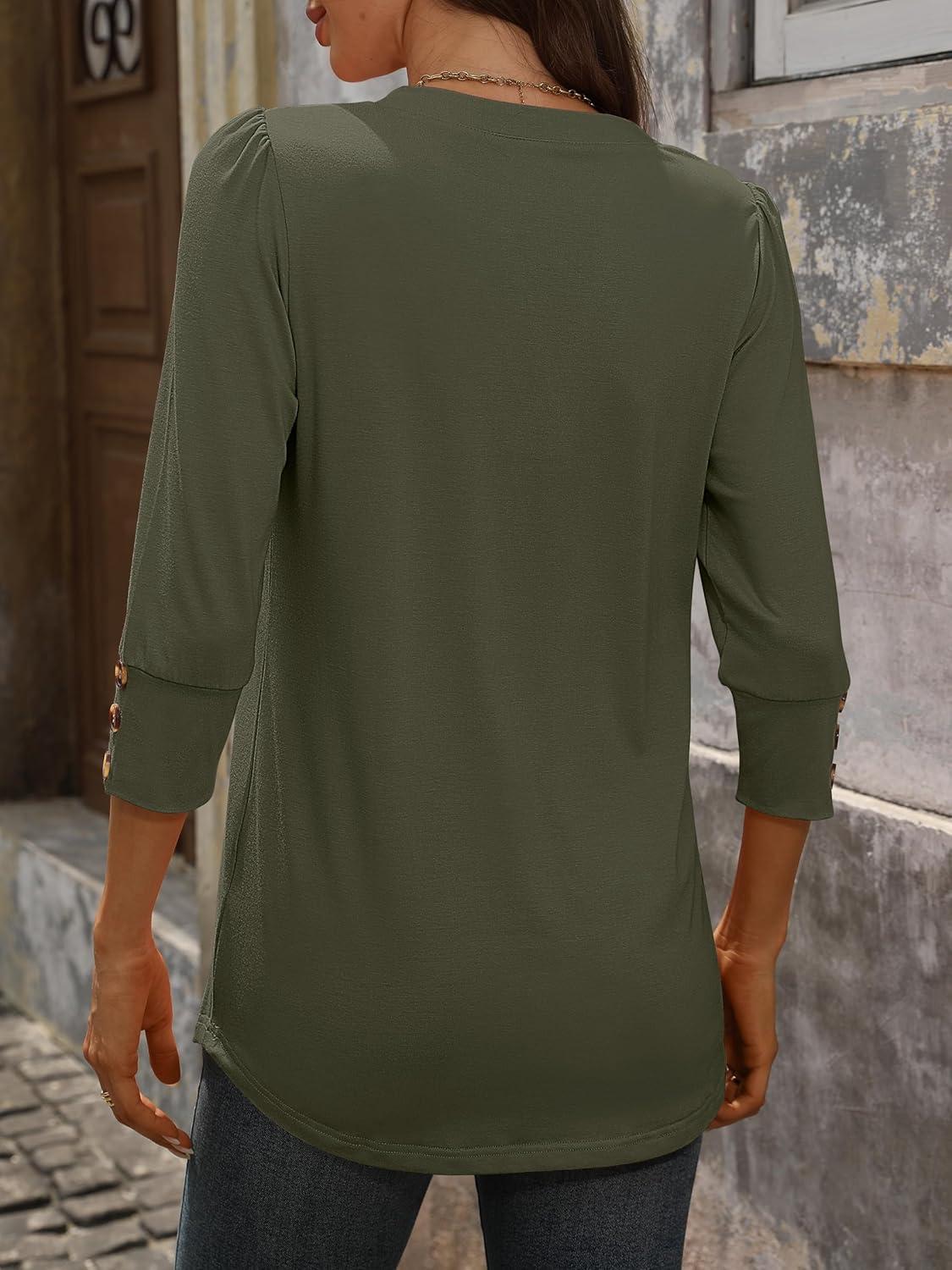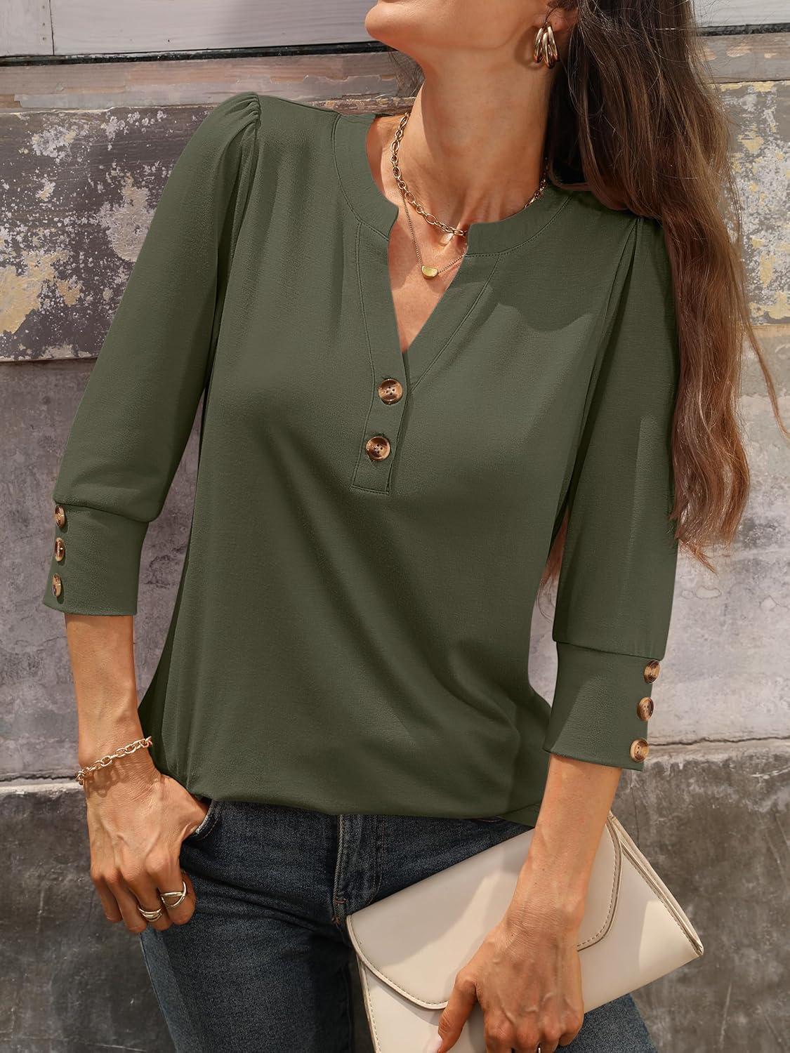 ANRABESS Womens Tops 3/4 Sleeve Casual Henley Shirts V Neck Buttons Dressy Work Business Blouses 2026 Spring Trendy Clothes(Army Green)